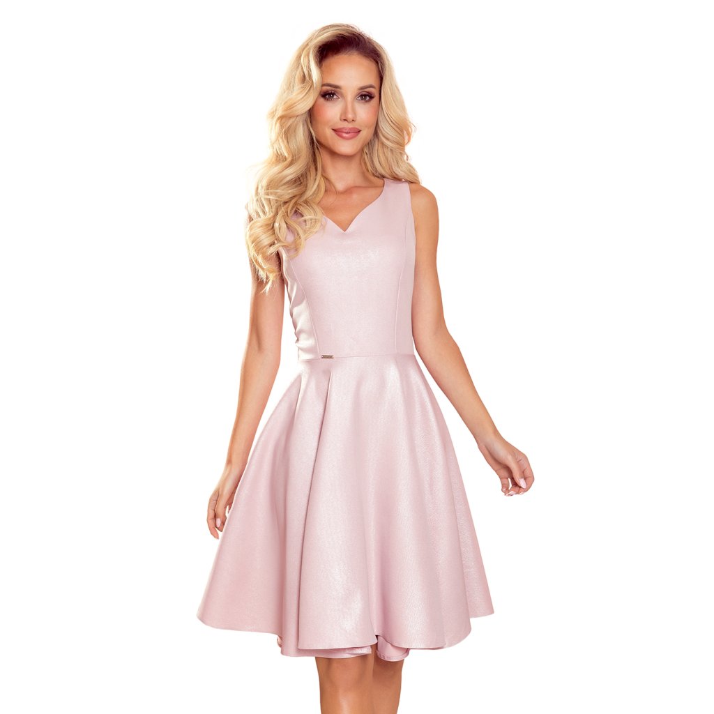 Rozevláté šaty se srdíčkovým výstřihem. Barva: pudrově růžová se třpytkami. Vysoce kvalitní materiál příjemný na dotek. Značka Numoco. Polský výrobek.