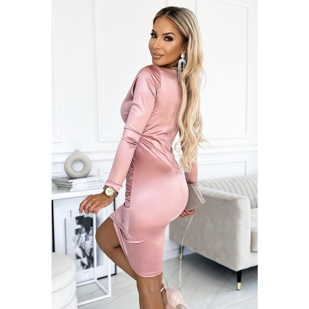 Numoco Saténové šaty s psaníčkovým výstřihem a dlouhým rukávem - špinavě růžové 477-1
