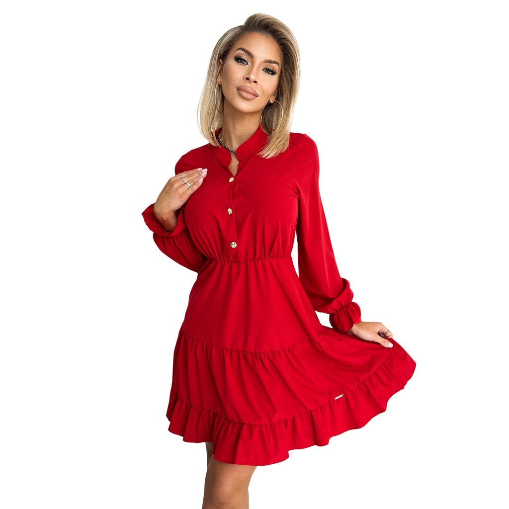 Červené šaty s volánky, dlouhými rukávy, výstřihem a zlatými knoflíky. Polská výroba. Značka Numoco.