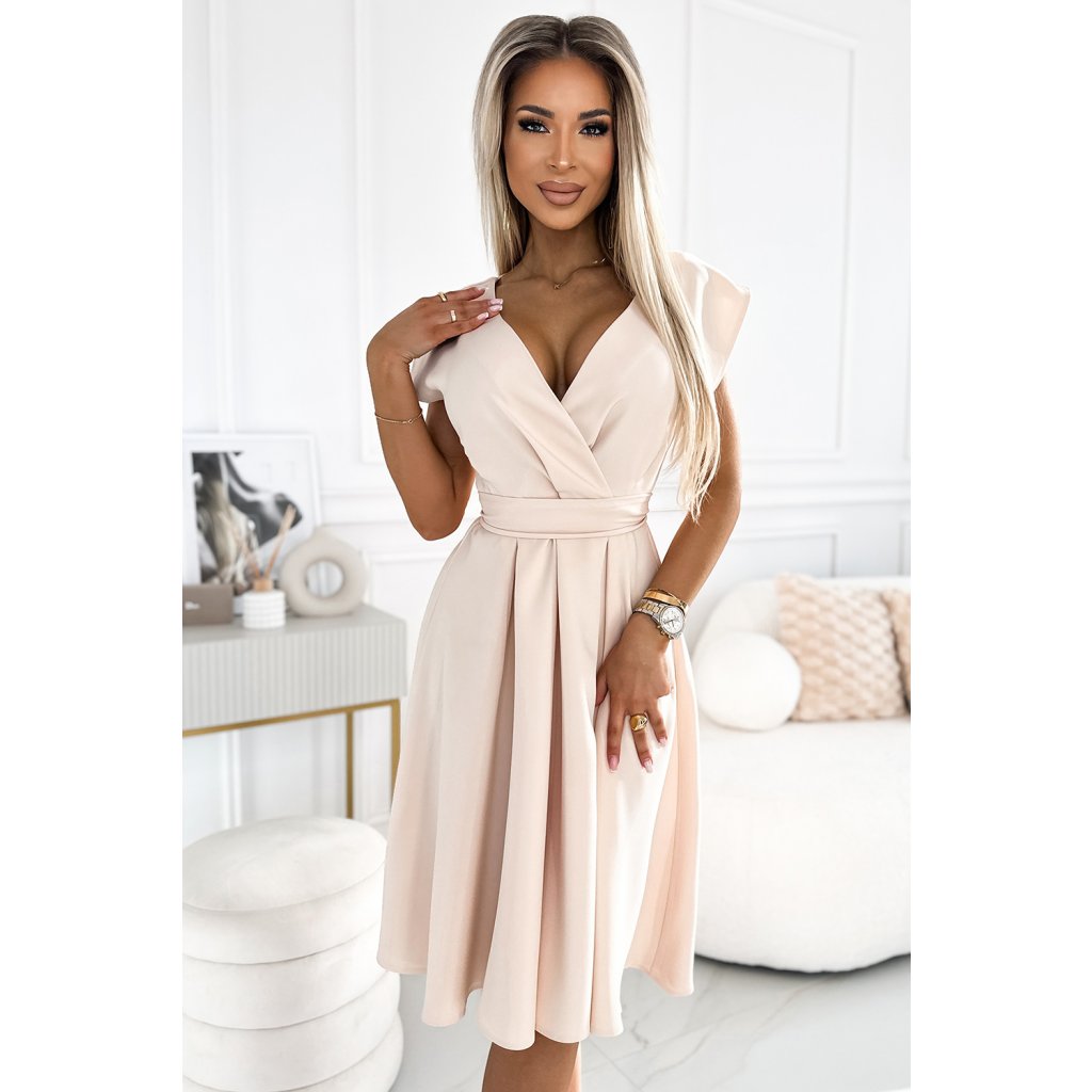Scarlett - rozšířené šaty s výstřihem obálky a opaskem. Vyrobeno z materiálu příjemného na dotek (95% polyester, 5% elastan). Barva: béžová. Značka Numoco. Polská produkce.