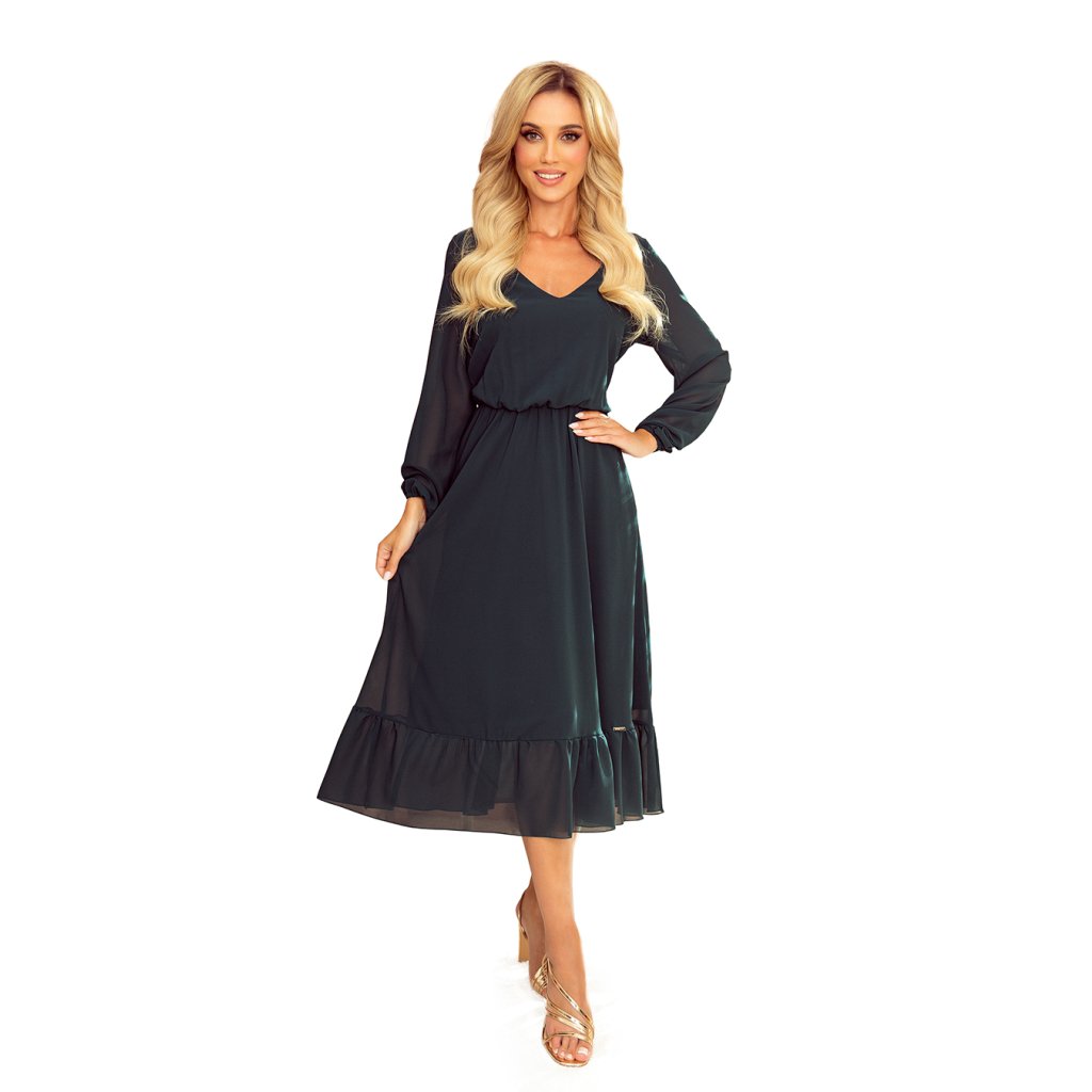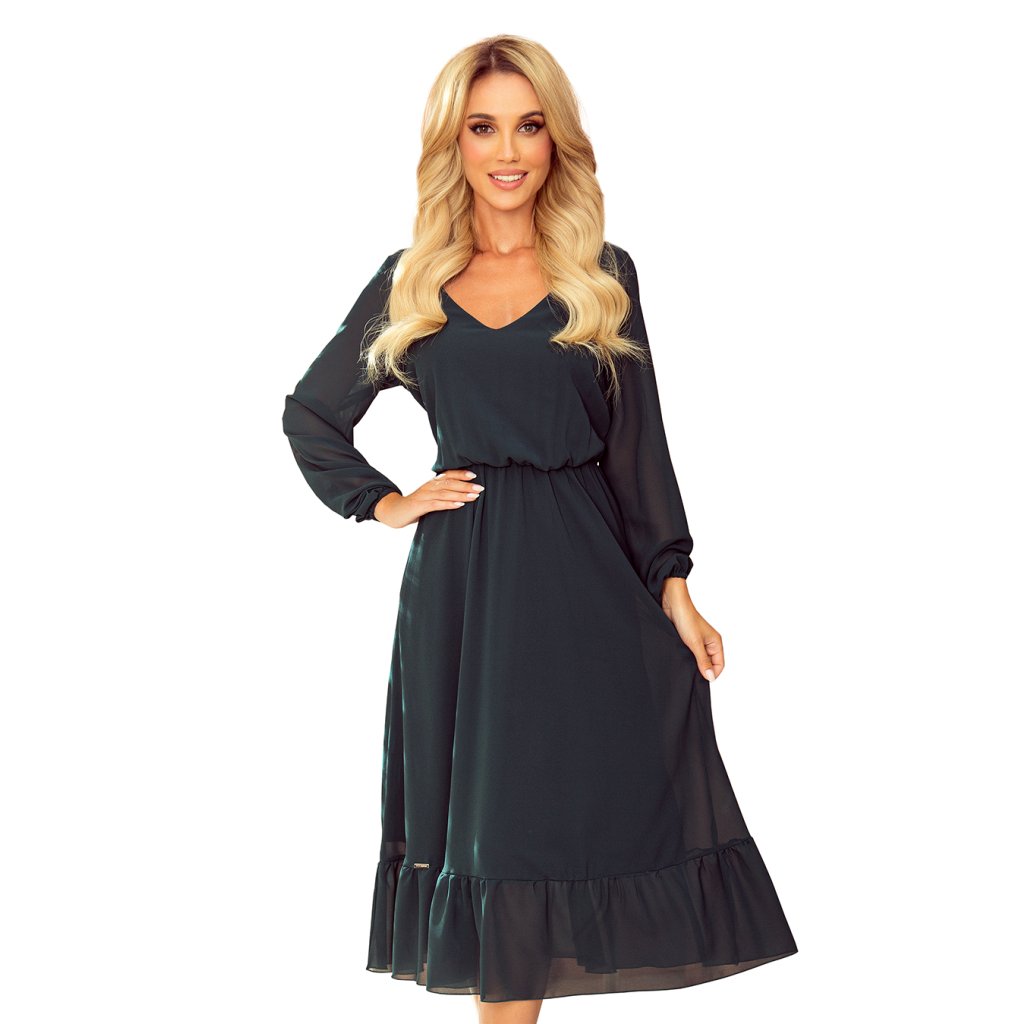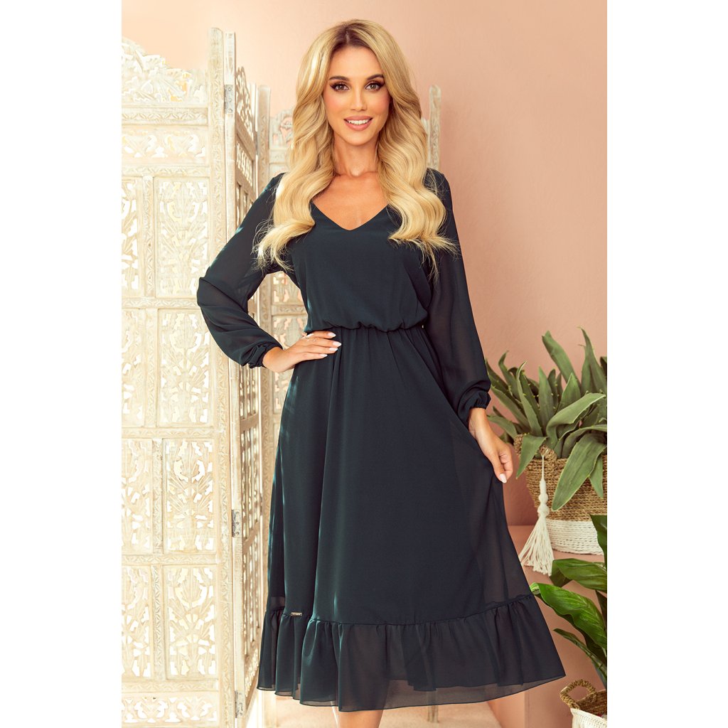 Numoco Šifónové midi šaty s výstřihem a límcem - zelené 304-2