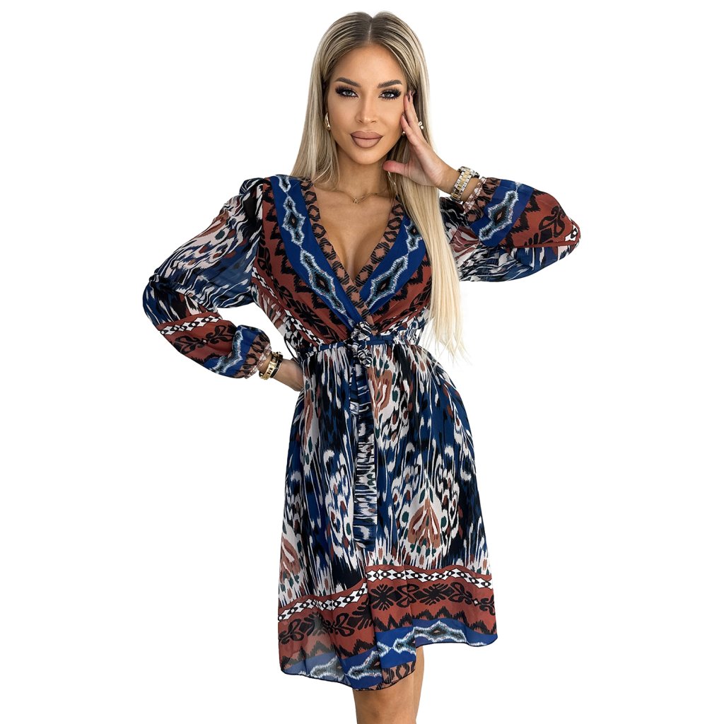 Numoco Šifonové šaty s výstřihem a dlouhým rukávem - indický vzor 516-1