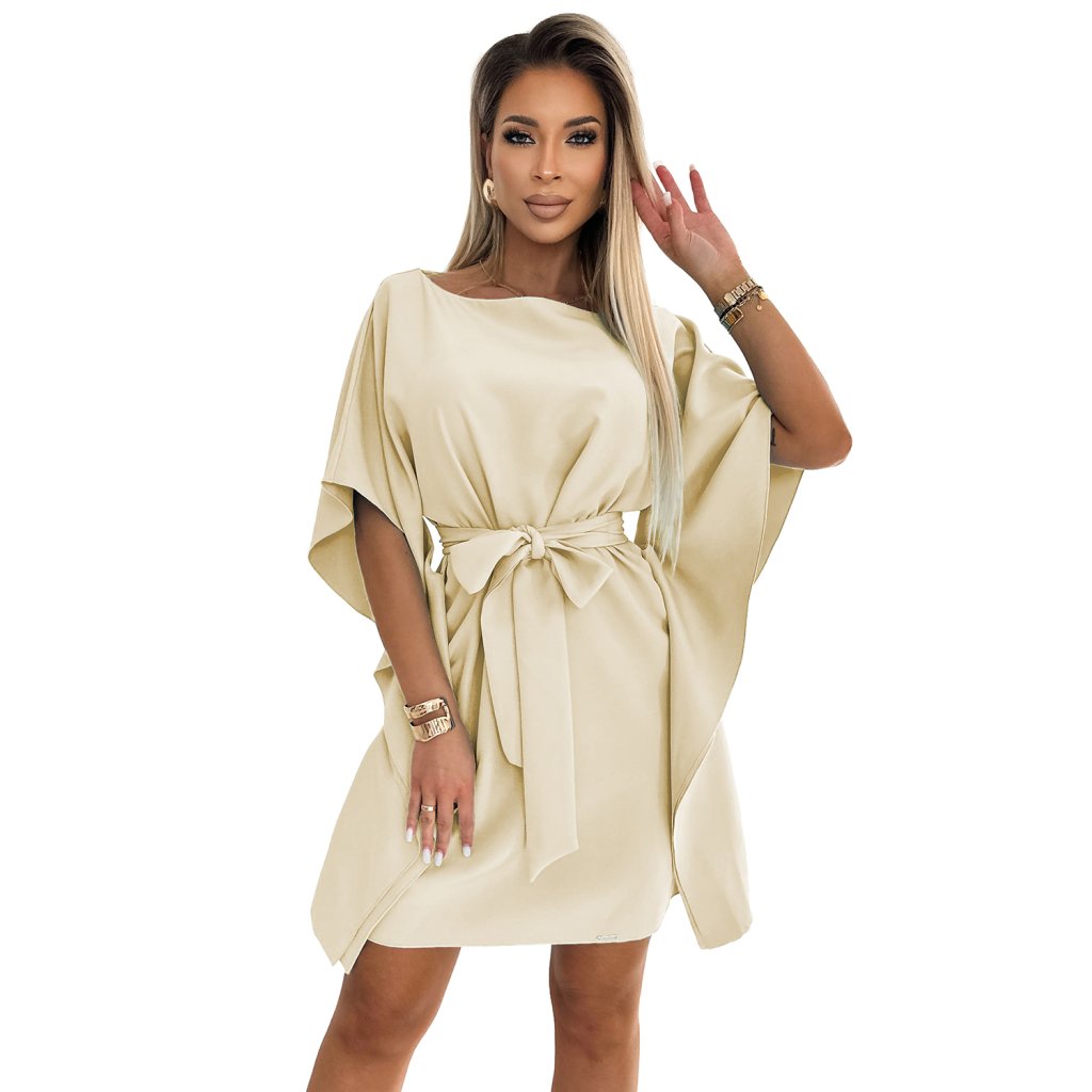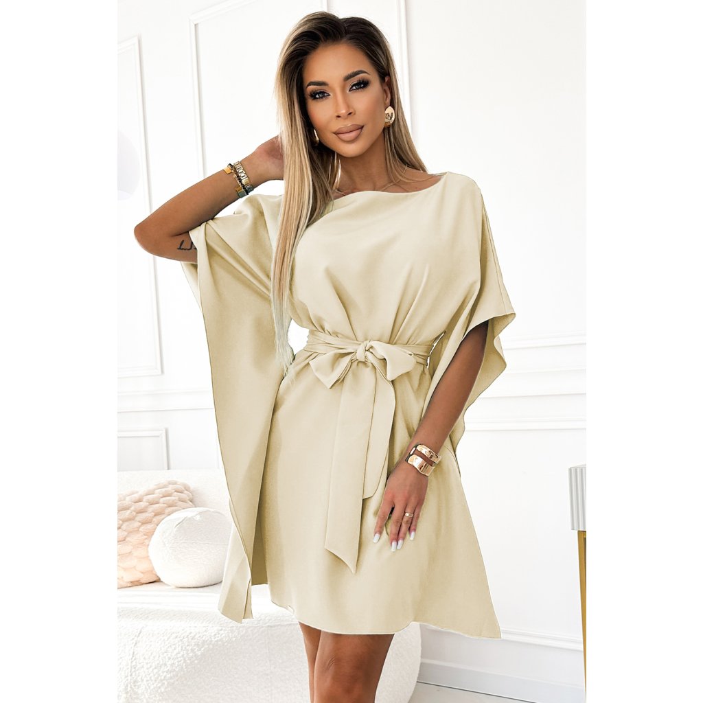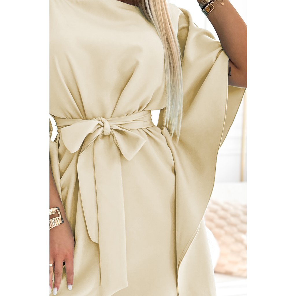SOFIA Motýlí šaty s páskem - béžová barva. Značka Numoco. Polská výroba.
