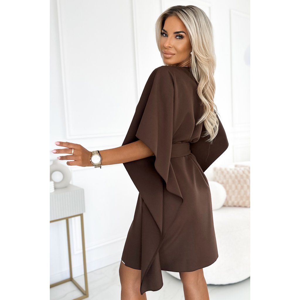 Numoco SOFIA Motýlí šaty se zavazováním v pase - čokoládová barva 287-33