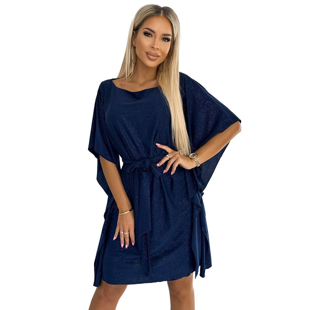 SOFIA Motýlí šaty s páskem - tmavě modrá se třpytkami. Vyrobeno z velmi pružného materiálu. Značka numoco. Polská výroba.