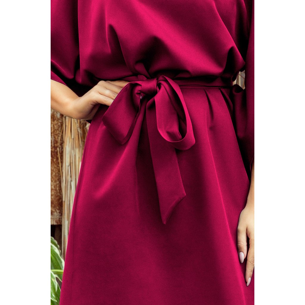 SOFIA Motýlí šaty s páskem - vínová barva. Vyrobeno z materiálu příjemného na dotek. Značka Numoco. Polská výroba.