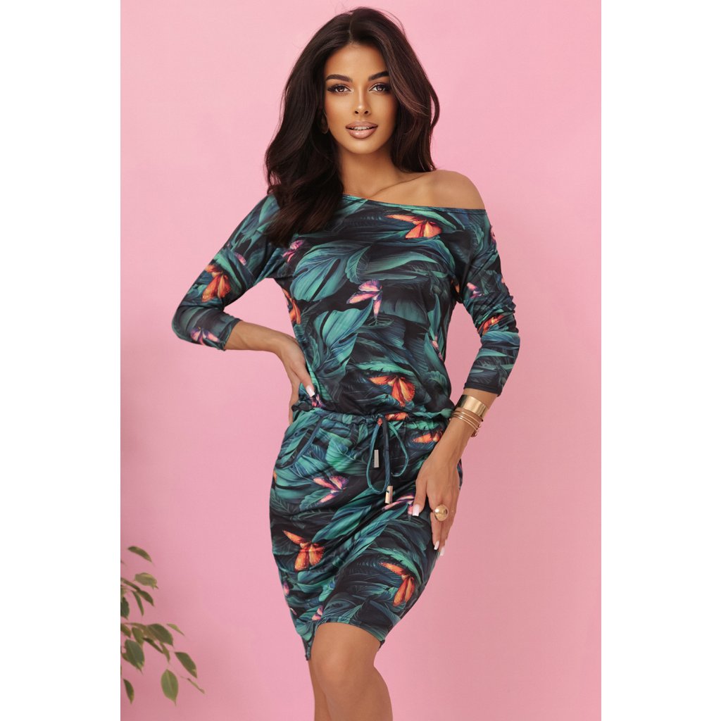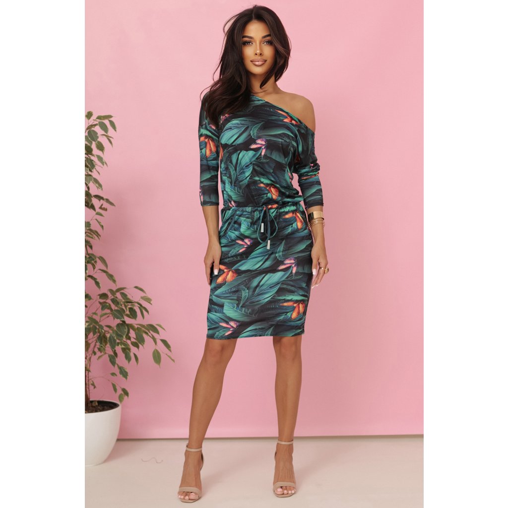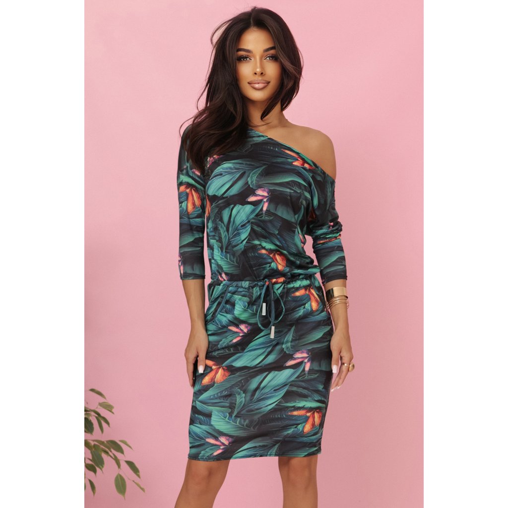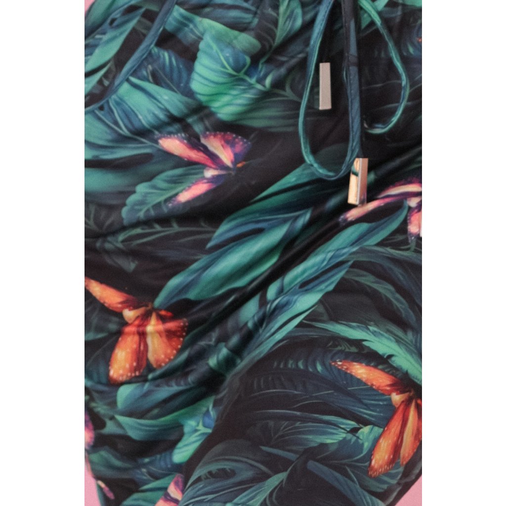 Sportovní šaty s lodičkovým výstřihem a tropickým 3D vzorem listů a motýlů. Pohodlné, flexibilní a stylové - ideální na léto. Polský výrobek. Značka Numoco.