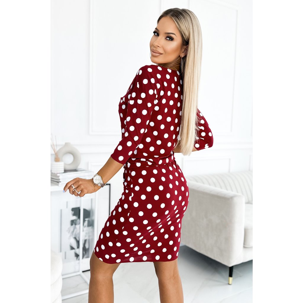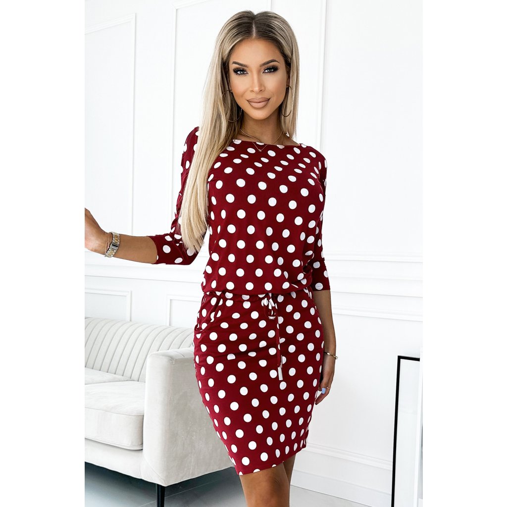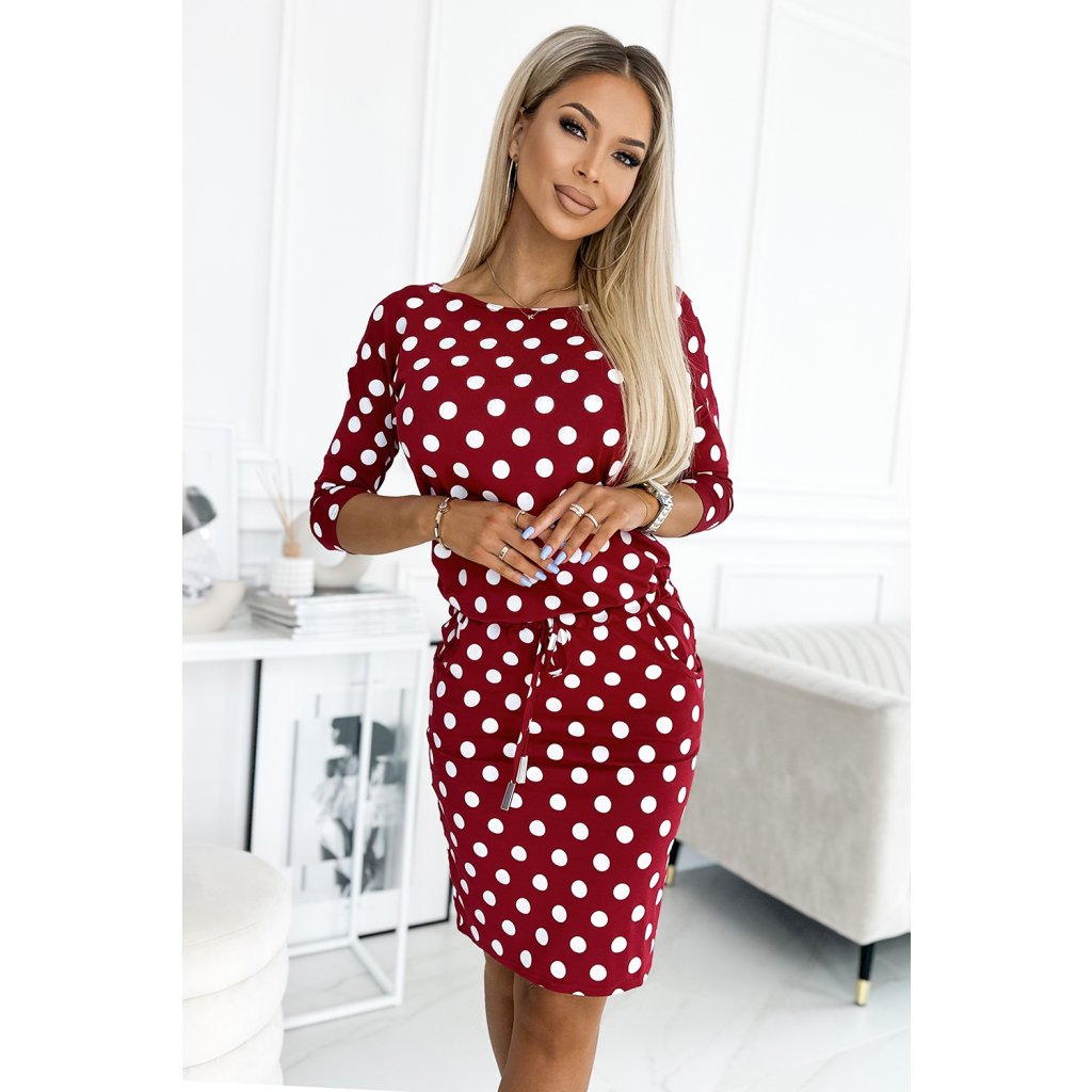 Sportovní šaty s kravatou, kapsami, lodičkovým výstřihem a 3/4 rukávy - vínové s bílými puntíky. Vyrobeno z elastického materiálu příjemného na dotek. Značka Numoco. Polská výroba.