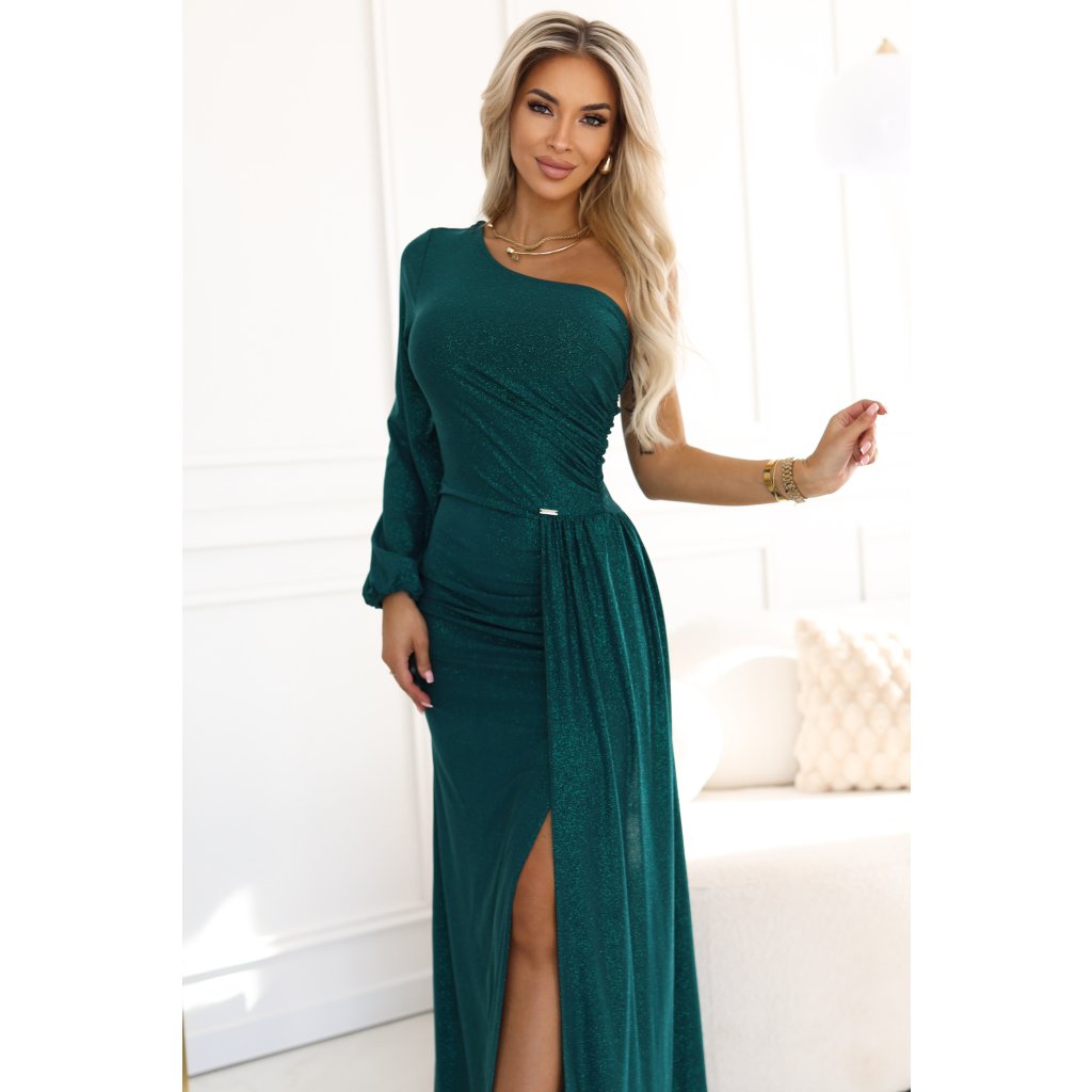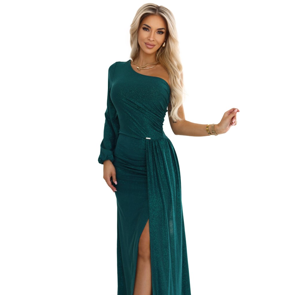 Dlouhé zelené třpytivé asymetrické šaty na jedno rameno s rozparkem - Numoco