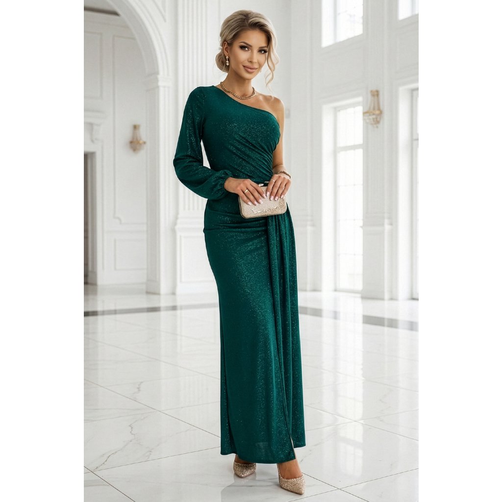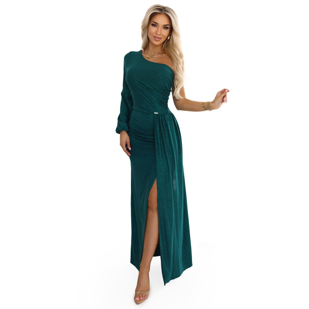 Numoco Třpytivé maxi šaty na jedno rameno s asymetrickými rukávy a rozparkem - zelené 658-2 - výprodej