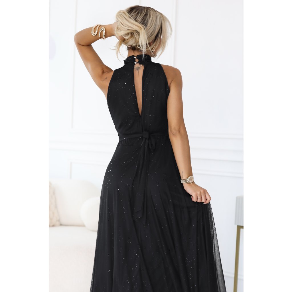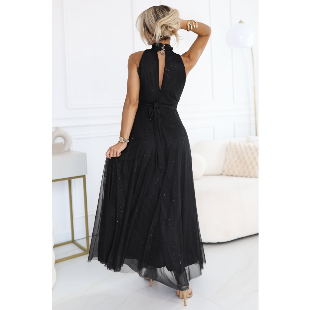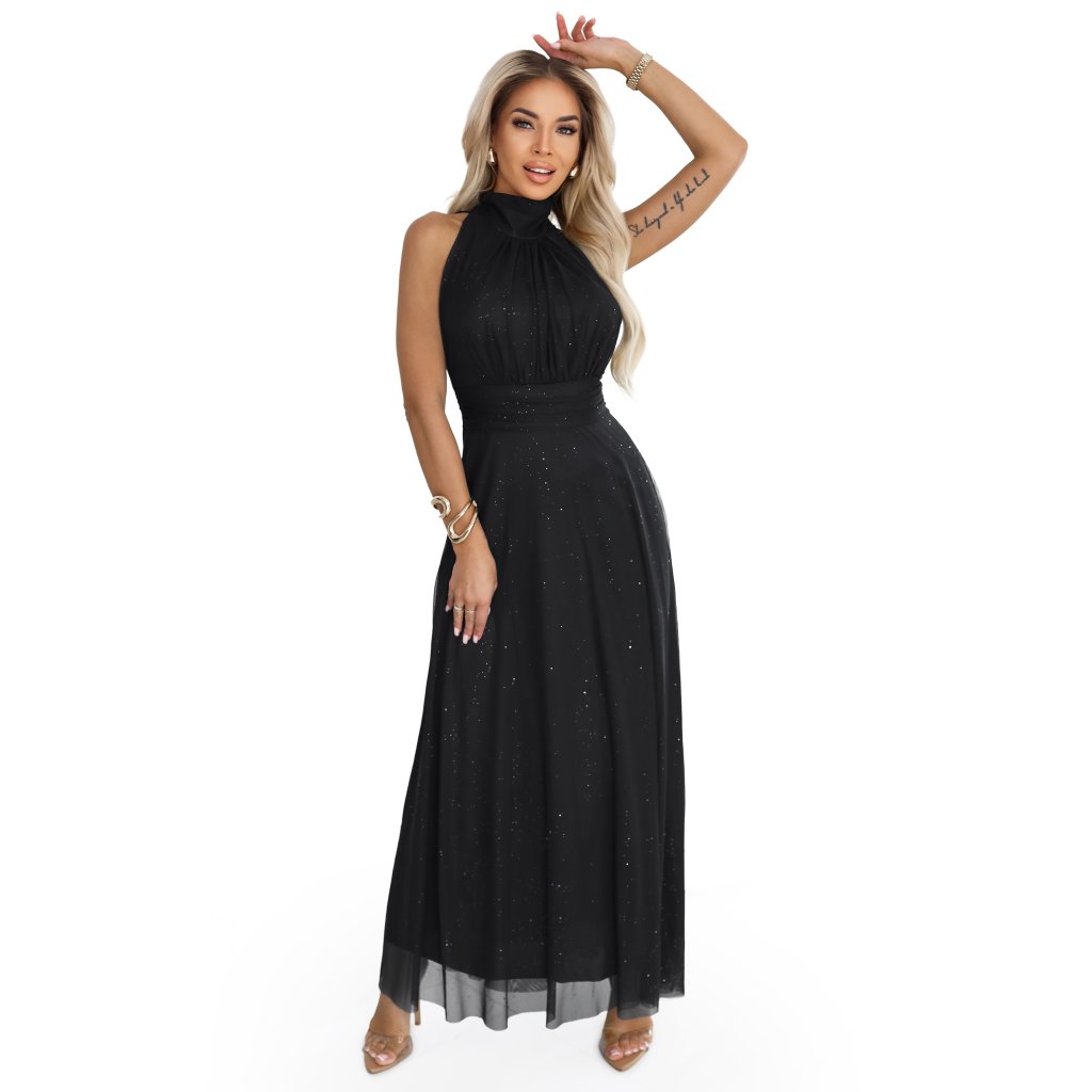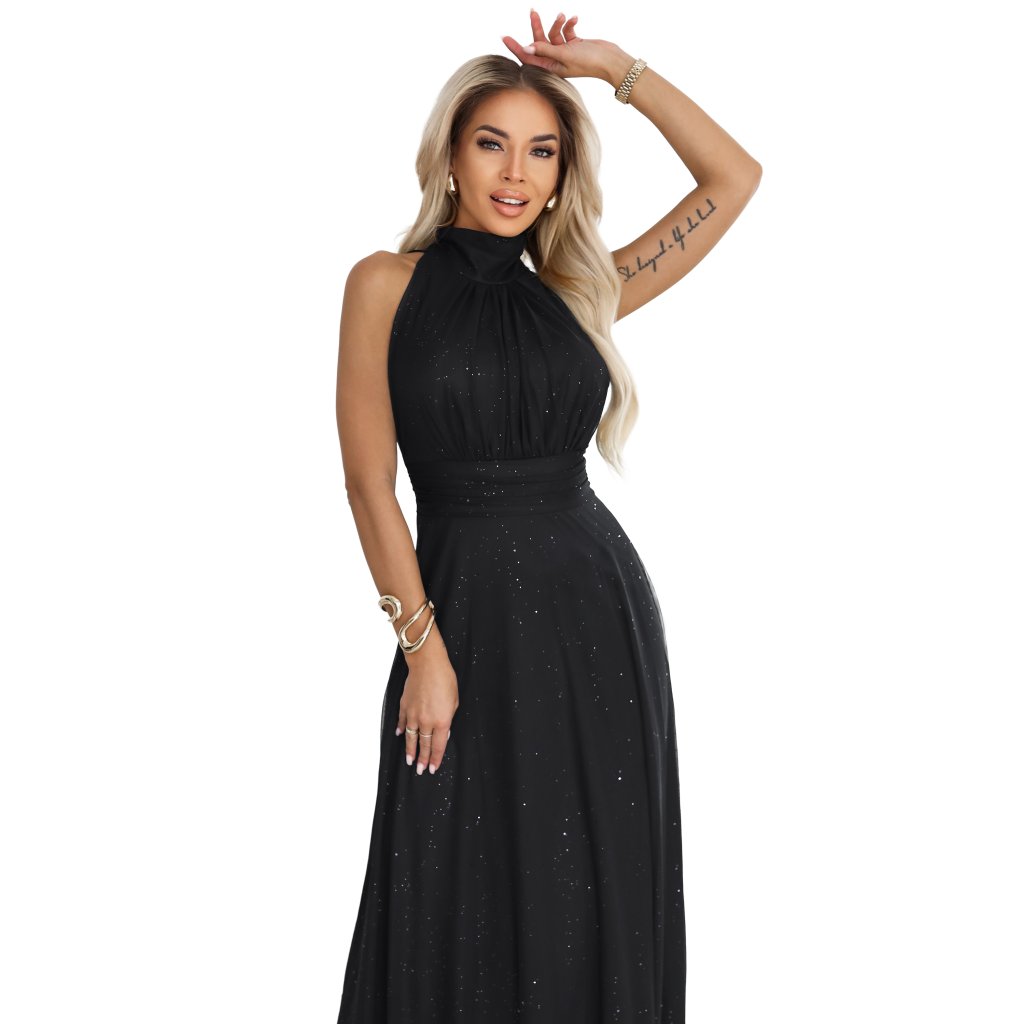 Numoco VERONICA luxusní dlouhé šaty s brokátovým akcentem a elegantním střihem - černé 636-3