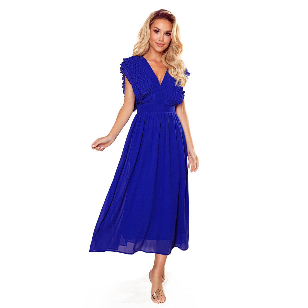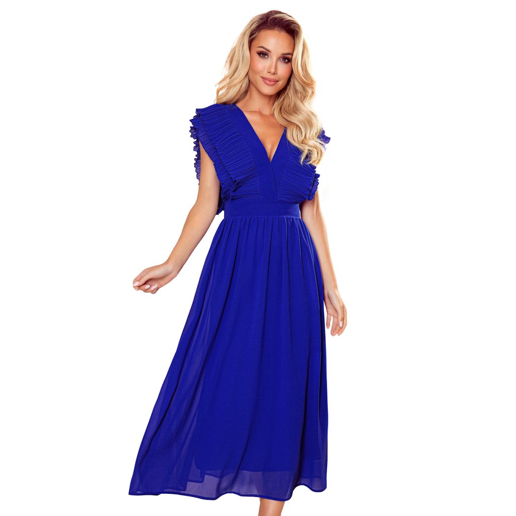 Yana - šifonové midi šaty s výstřihem a řaseným řasením. Sukně je vyrobena v módní 7/8 délce. Zapínání vzadu na krytý zip. Barva: modrá. Značka Numoco. Polská výroba.