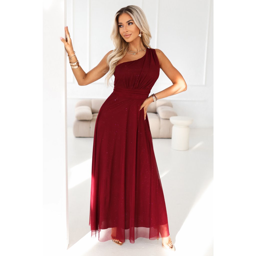 Numoco Dlouhé, lesklé večerní šaty na jedno rameno - vínové 656-1