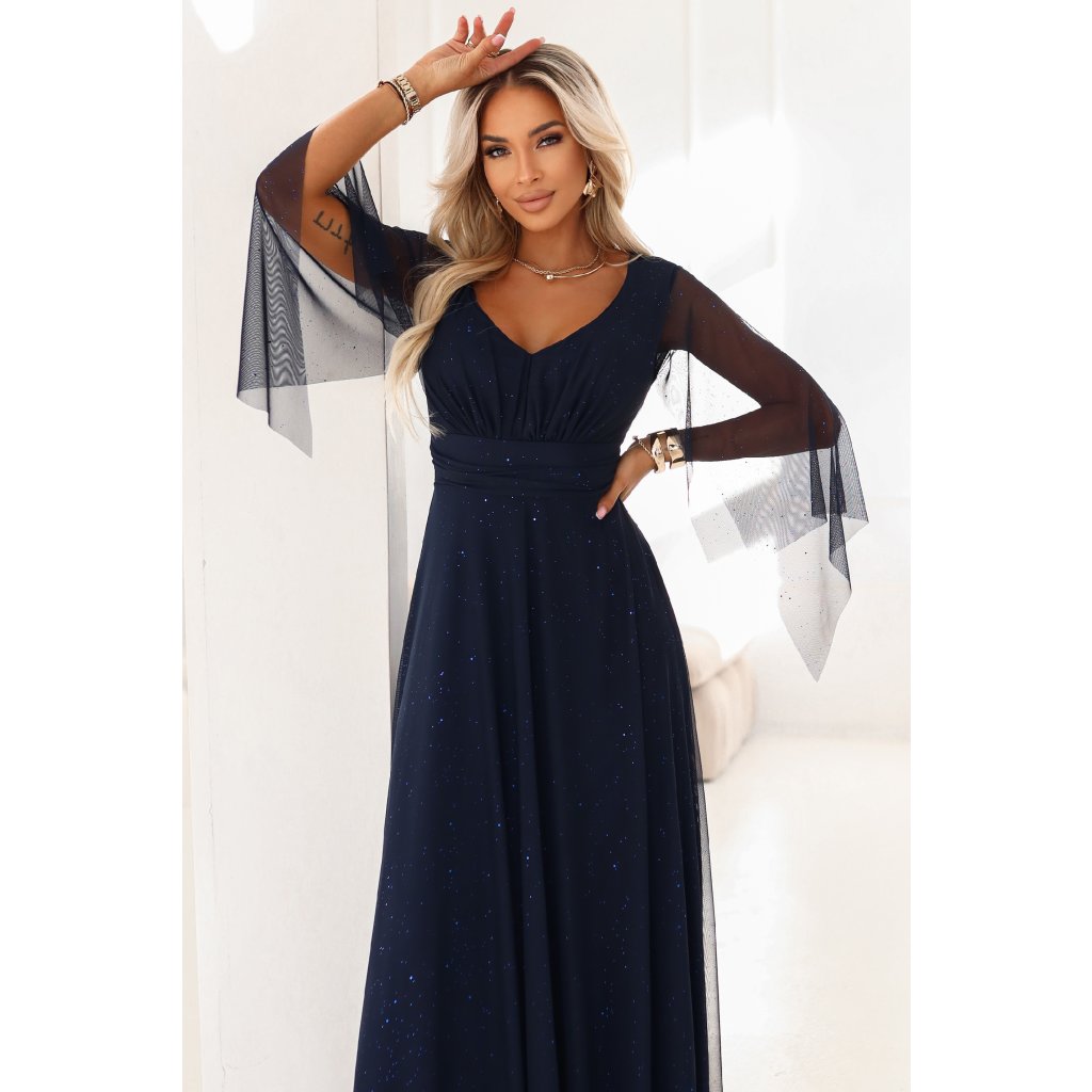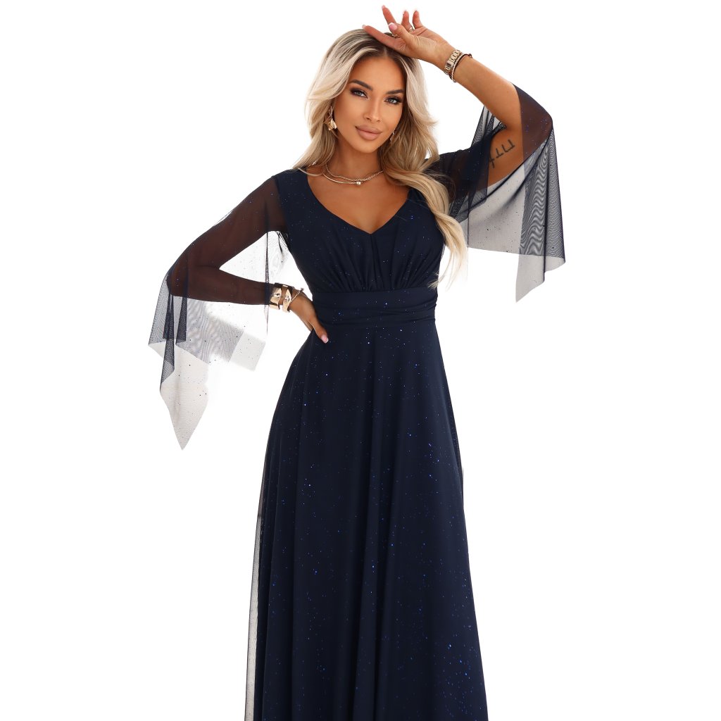 NumocoDlouhé, třpytivé šaty s výstřihem a průhlednými rukávy - tmavě modré 655-3
