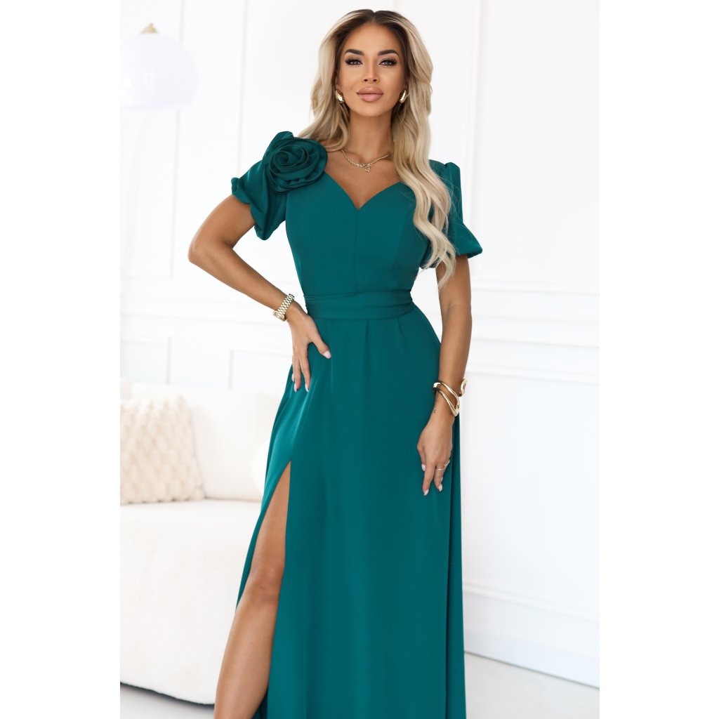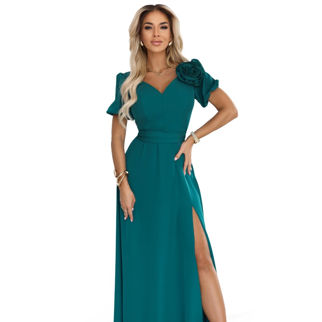 Numoco Elegantní dlouhé společenské šaty s květinou, páskem a vysokým rozparkem - lahvově zelená 653-1