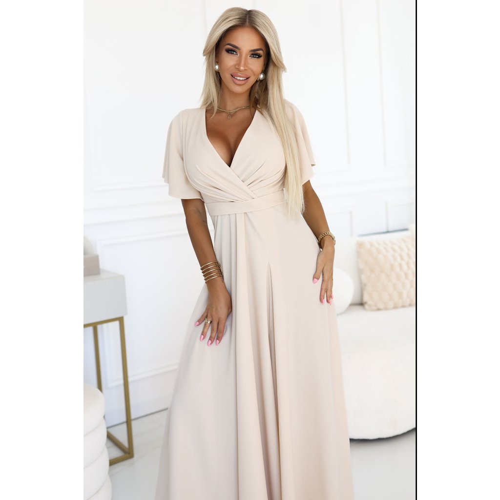Elegantní béžové maxi šaty s hlubokým výstřihem, splývavými rukávy a rozparkem na nohavici. Ideální pro zvláštní příležitosti. Vyrobeno v Polsku – značka Numoco.
