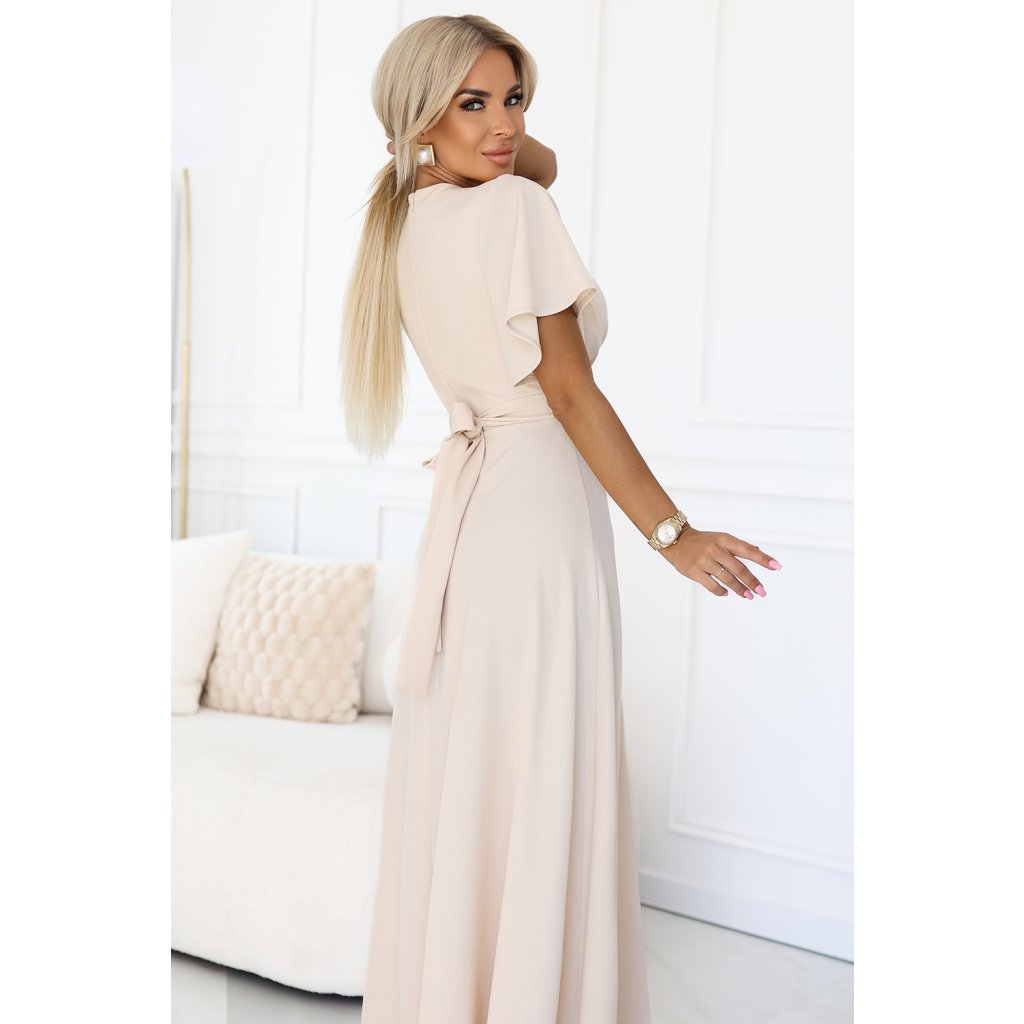 Jennifer – elegantní maxi šaty se zavinovacím výstřihem – béžové | Numoco