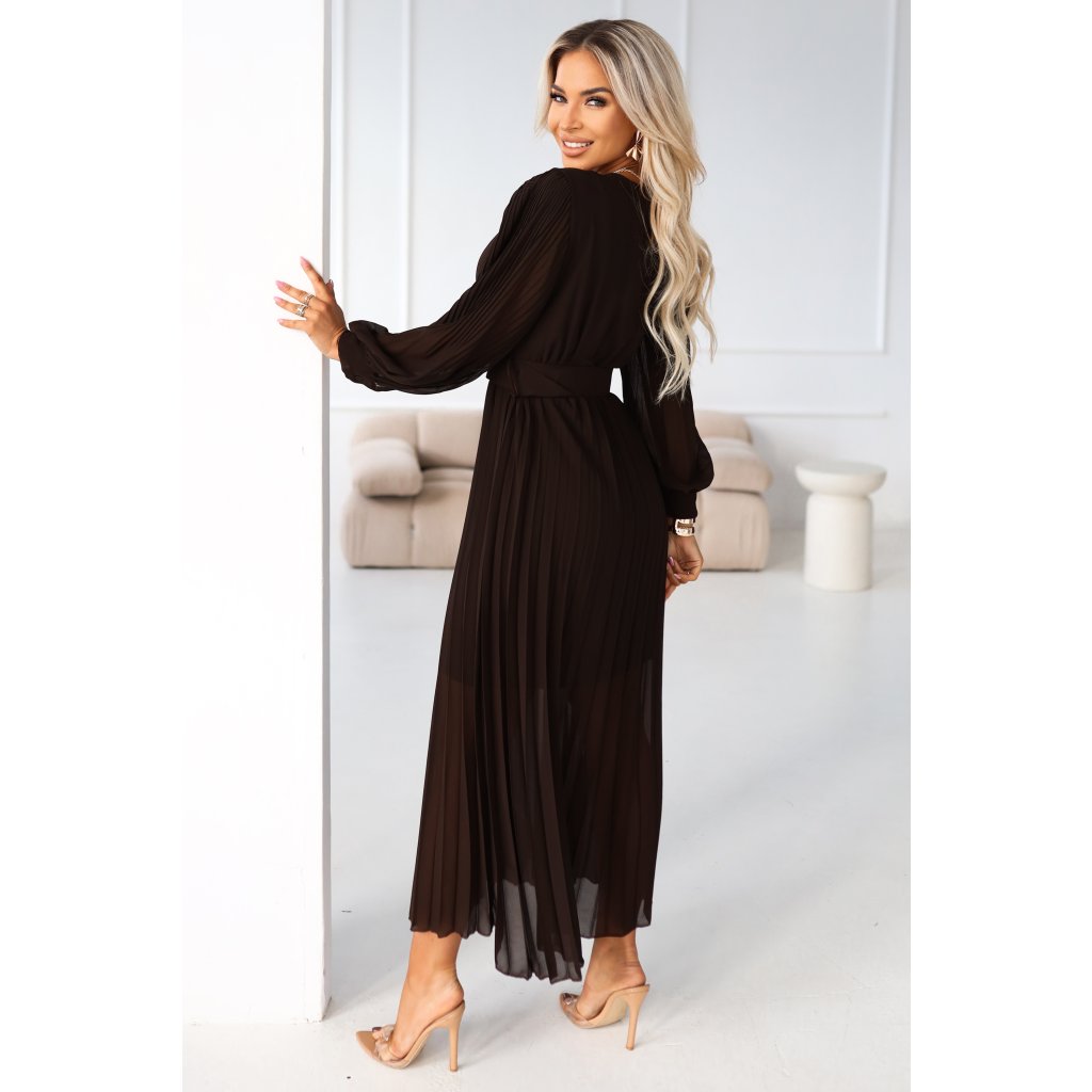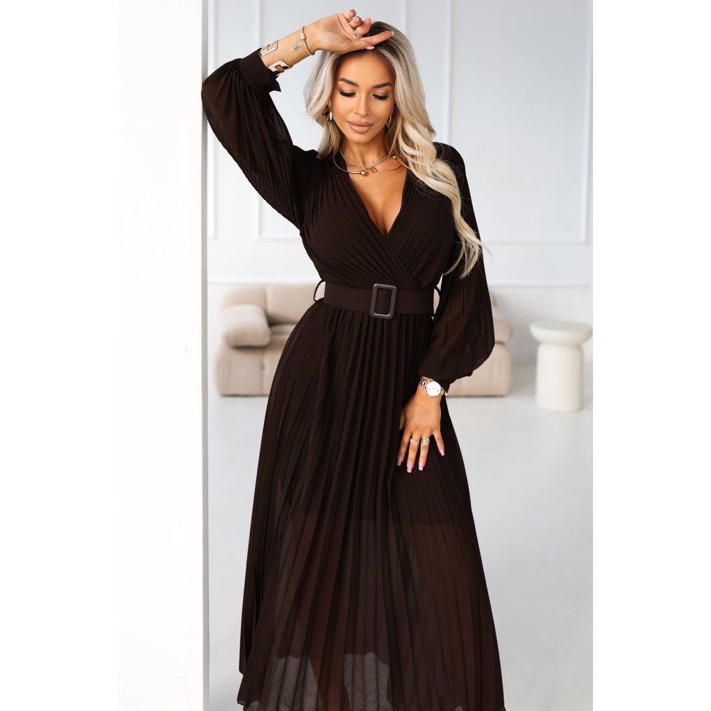 Čokoládové plisované midi šaty s páskem a výstřihem - Numoco Basic