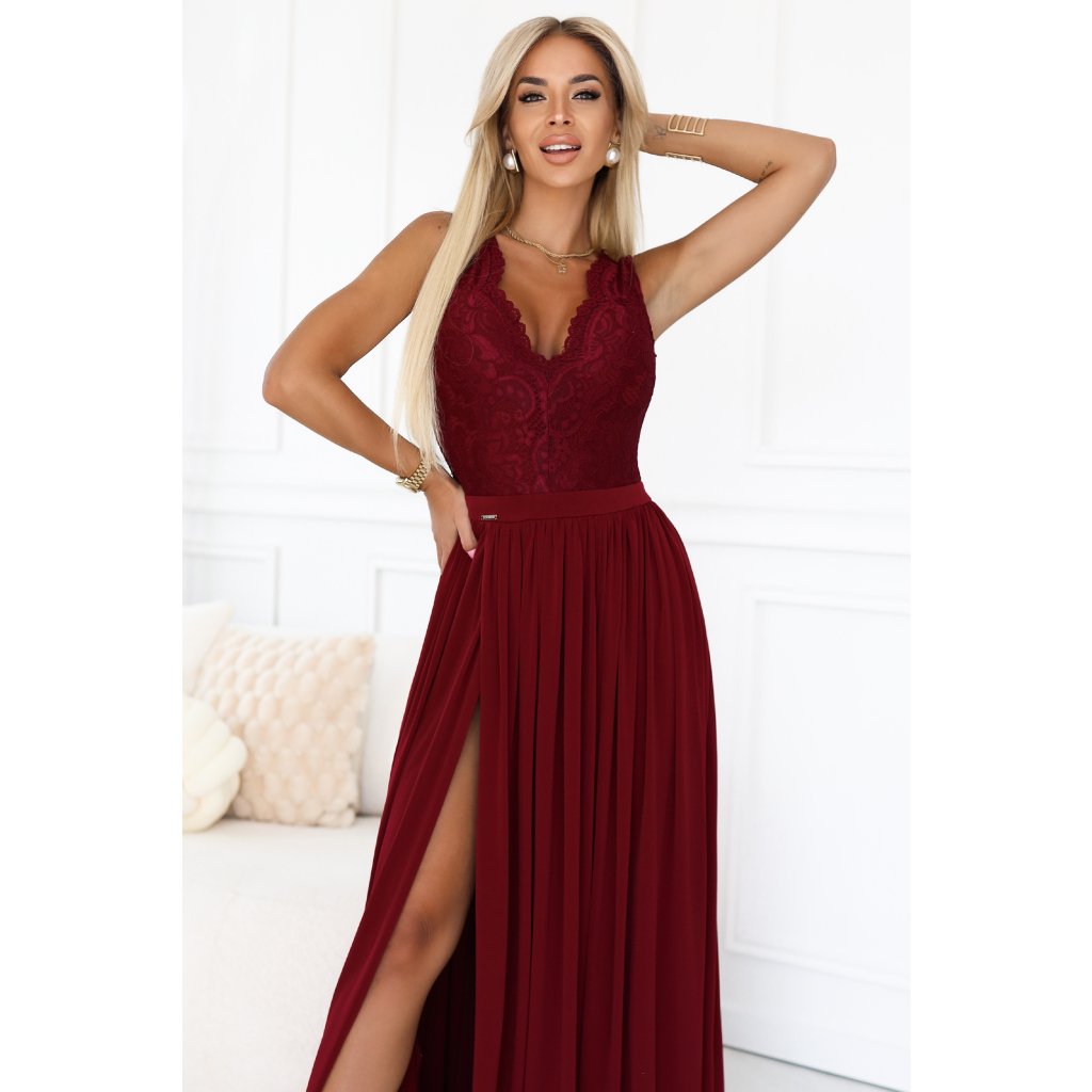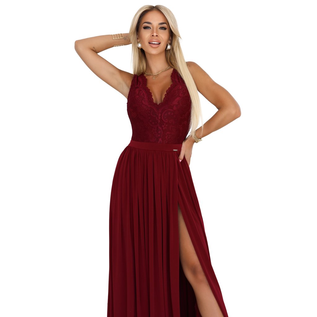 Numoco LEA dlouhé šaty s krajkovým výstřihem a rozparkem na nohavici - vínové 211-8