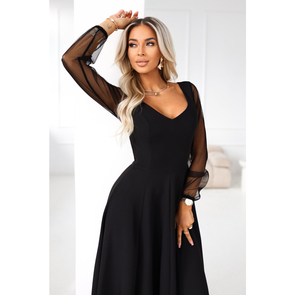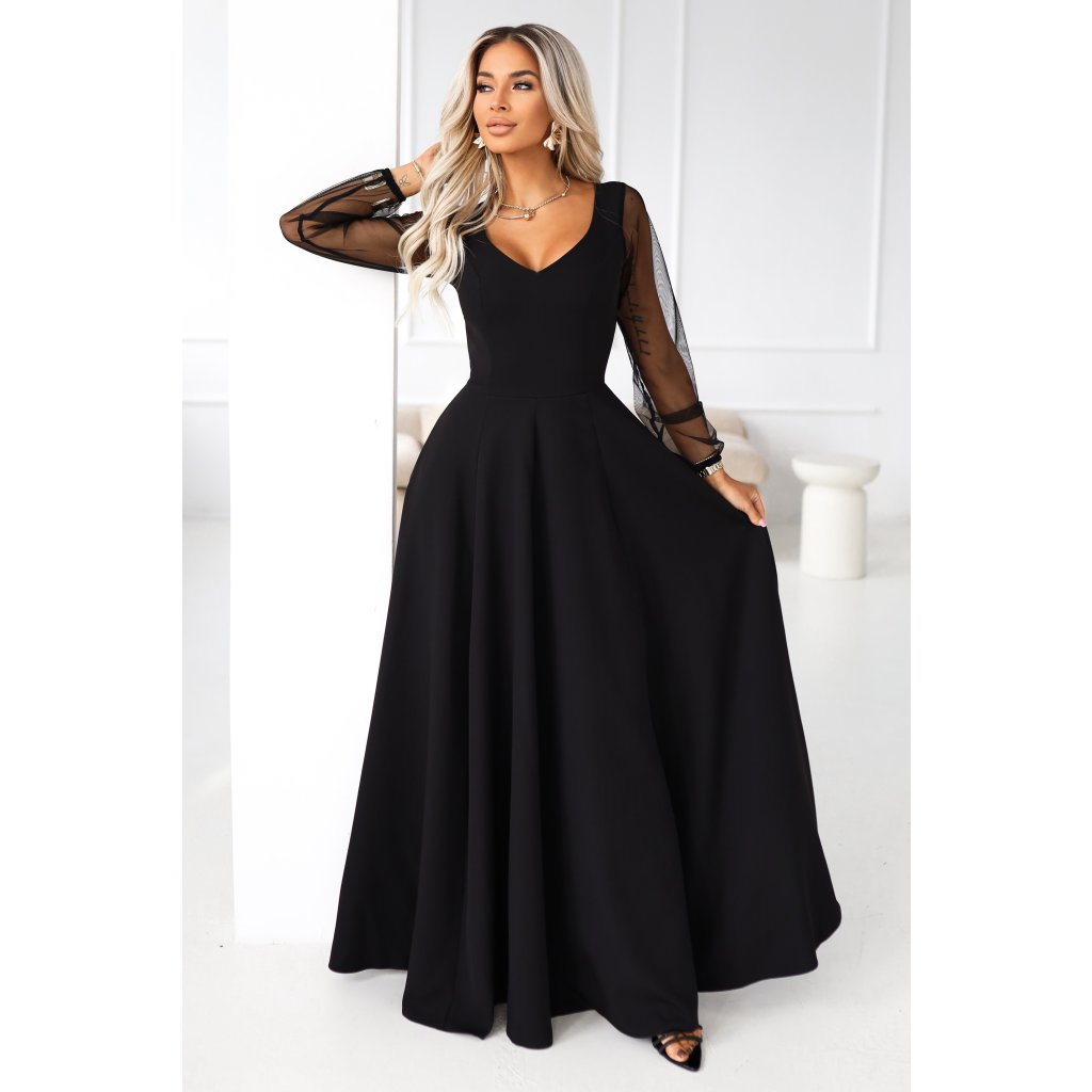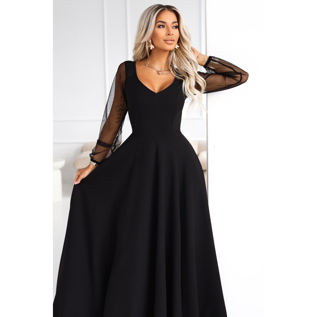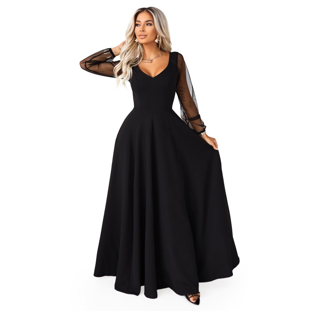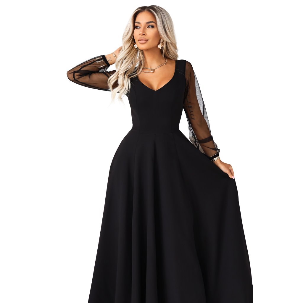 Numoco LORETTA unikátní dlouhé šaty s tylovými rukávy a výstřihem - černé 640-2