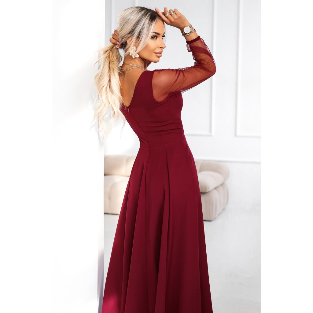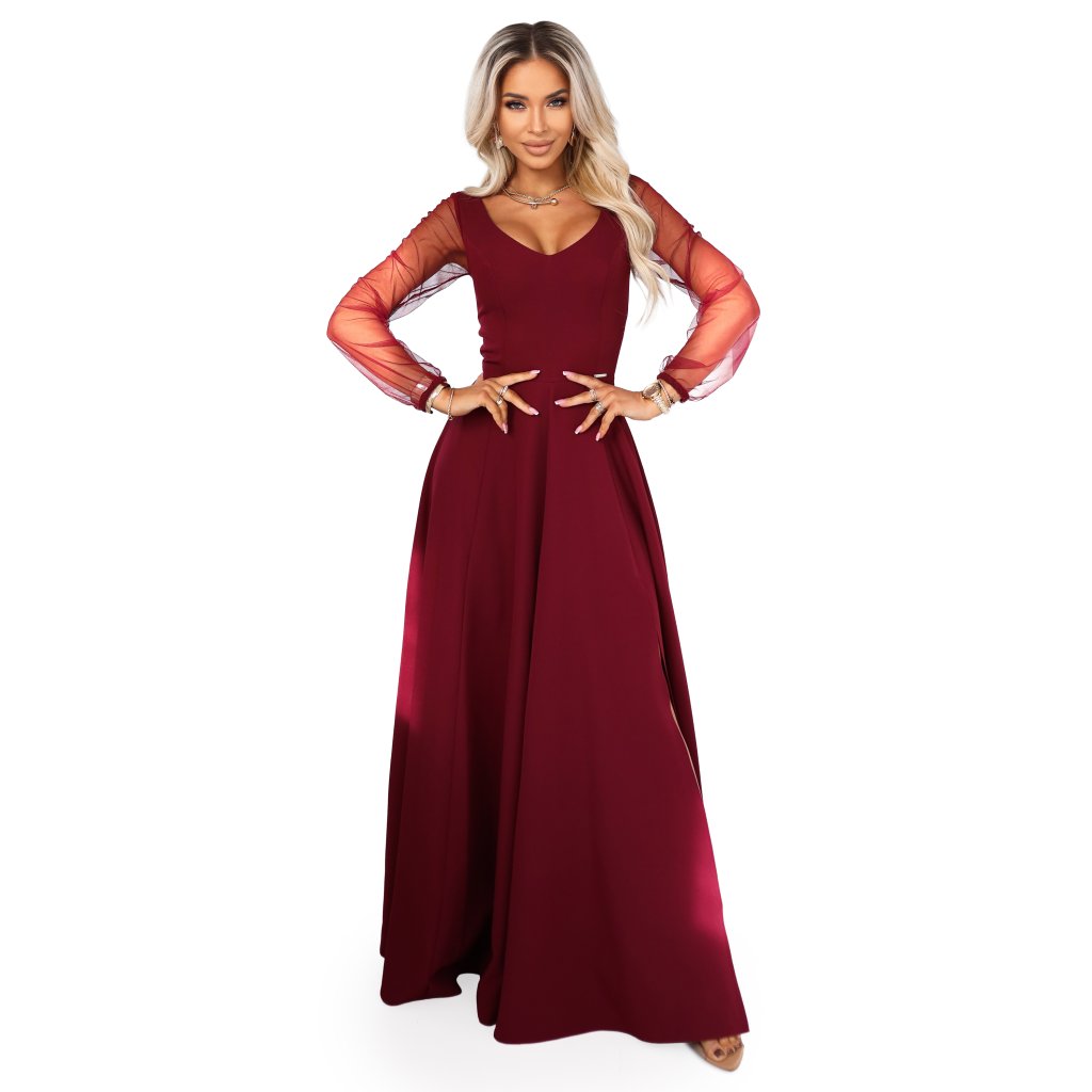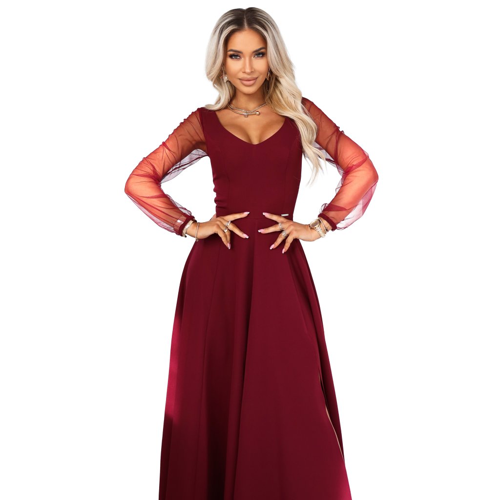 Numoco LORETTA unikátní dlouhé šaty s tylovými rukávy a výstřihem - vínové 640-1