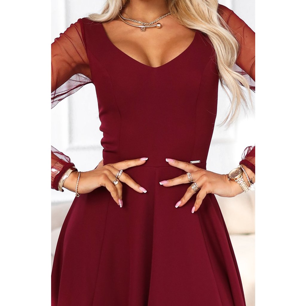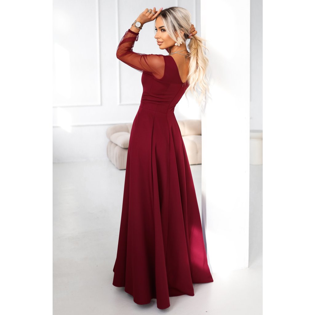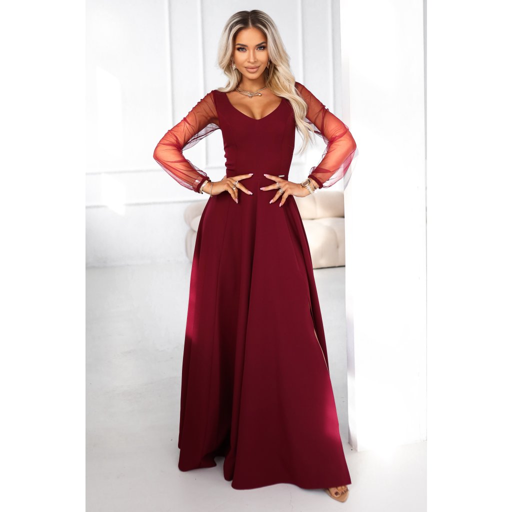 Numoco LORETTA unikátní dlouhé šaty s tylovými rukávy a výstřihem - vínové 640-1