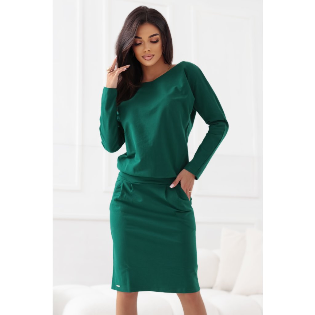 Zelené mikinové šaty s kapsami a volným zádovým výstřihem. Ideální pro každodenní nošení i do práce. Vyrobeno v Polsku – Numoco.