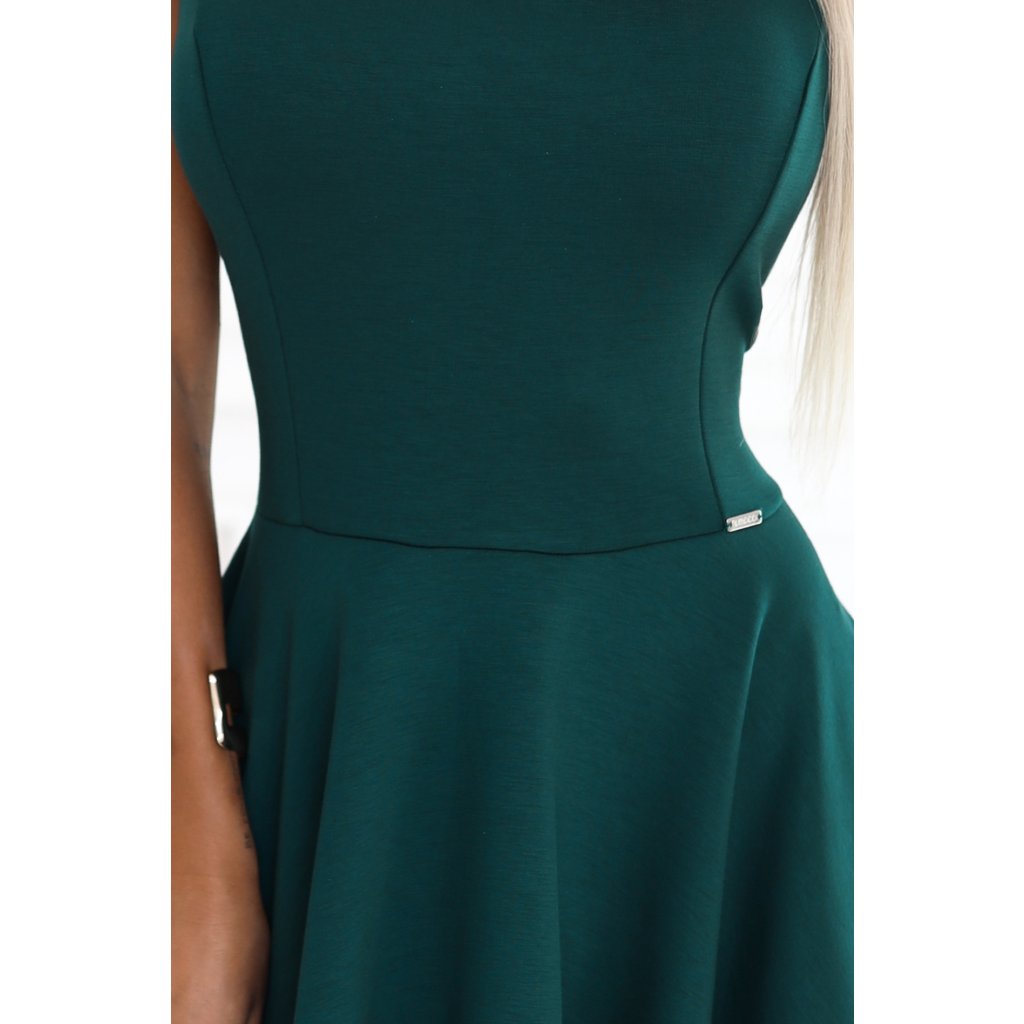 Tyto elegantní lahvově zelené šaty s rozšířenou sukní a delšími zády zdůrazňují siluetu a jsou ideální pro zvláštní příležitosti. Vyrobeno v Polsku společností Numoco.