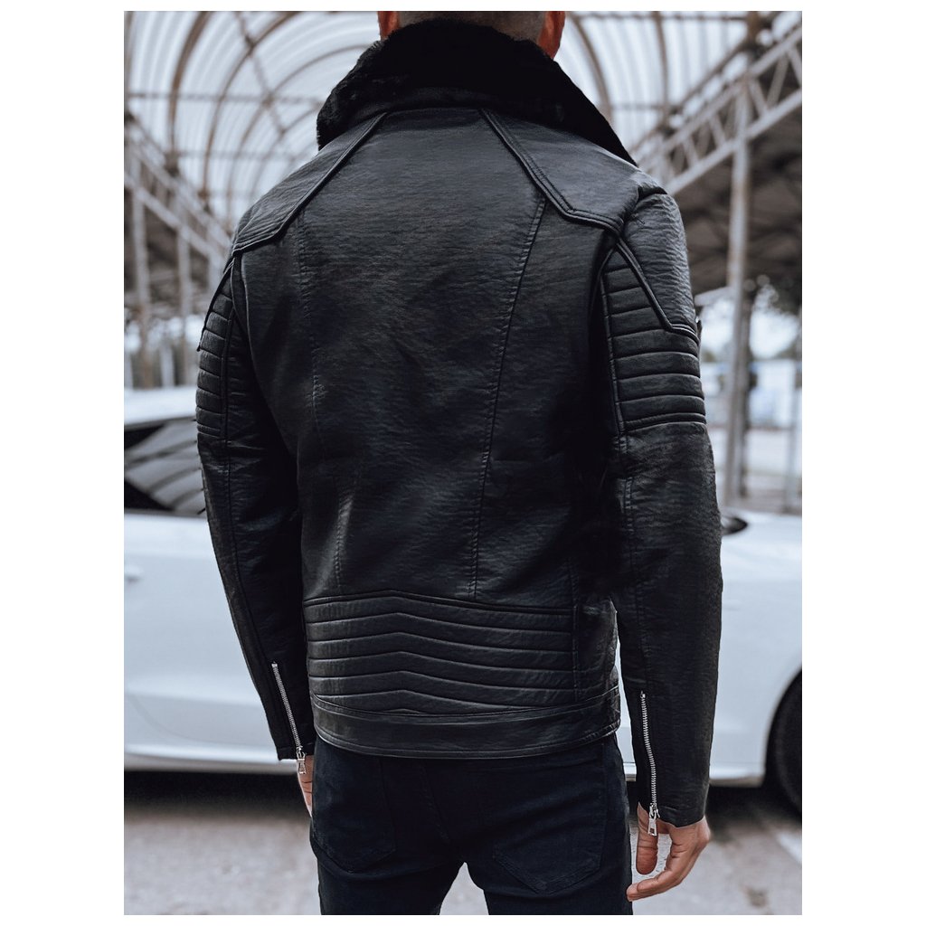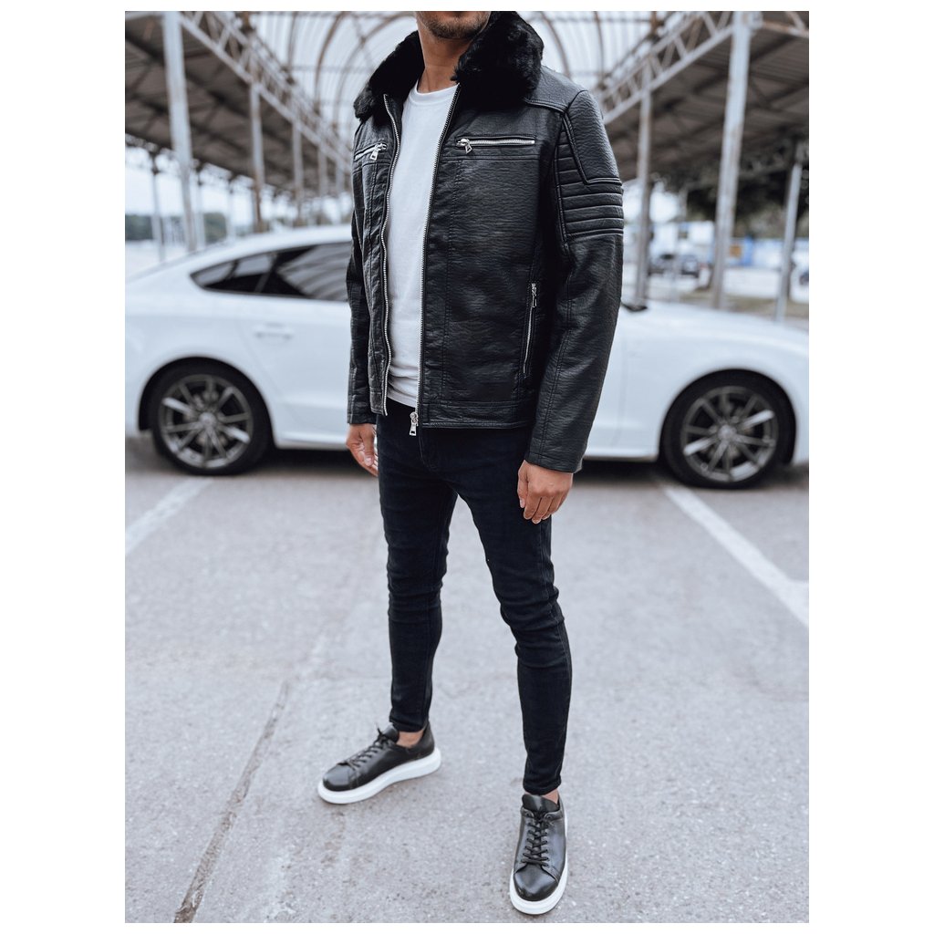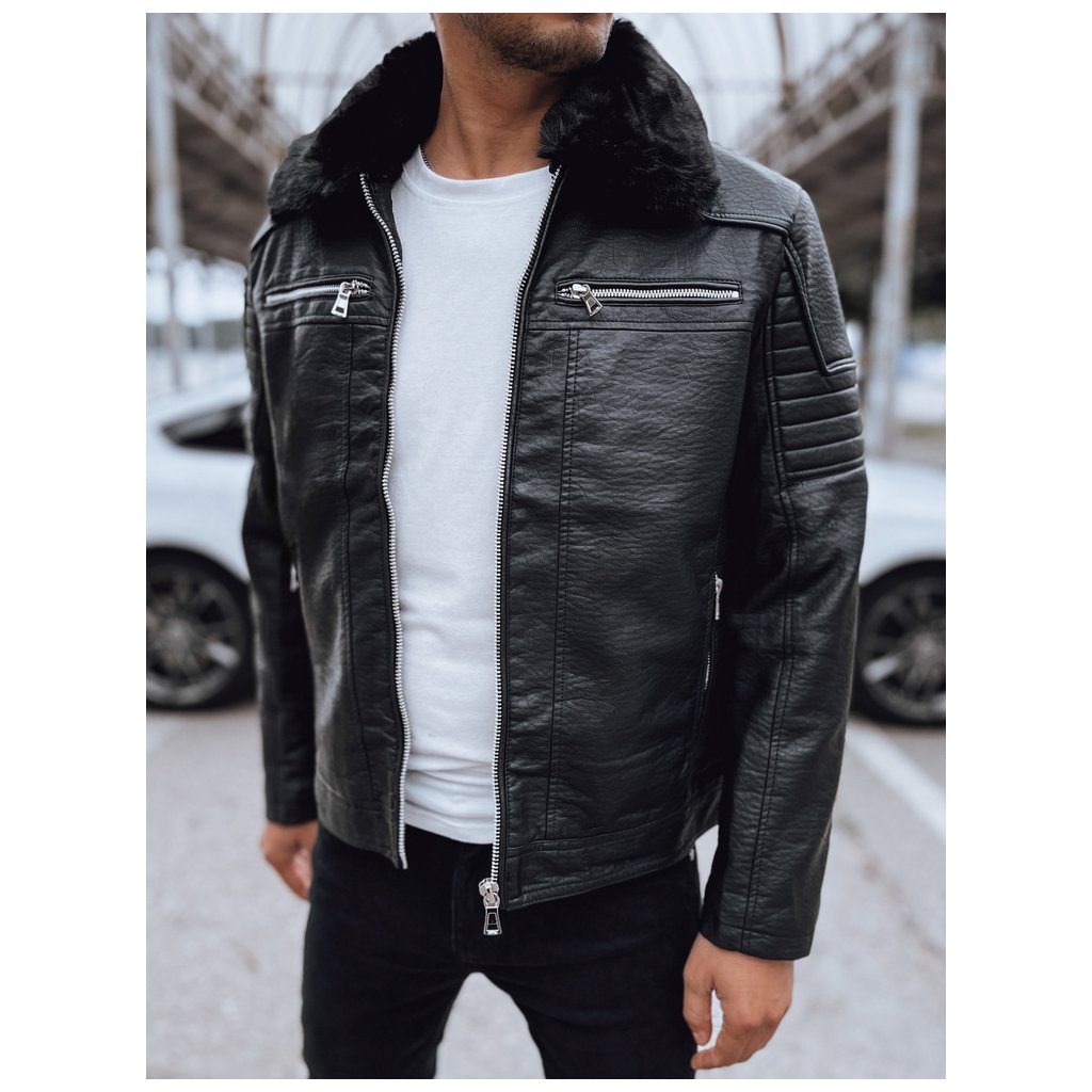 Černá pánská kožená bunda. Vyrobeno z umělé kůže. Zapínání na zip. Prošívaná podšívka. Odnímatelný kožešinový lem na límci. Dvě boční kapsy a jedna vnitřní kapsa. Vnější materiál: 1000% polyuretan. Podšívka: 100% polyester.