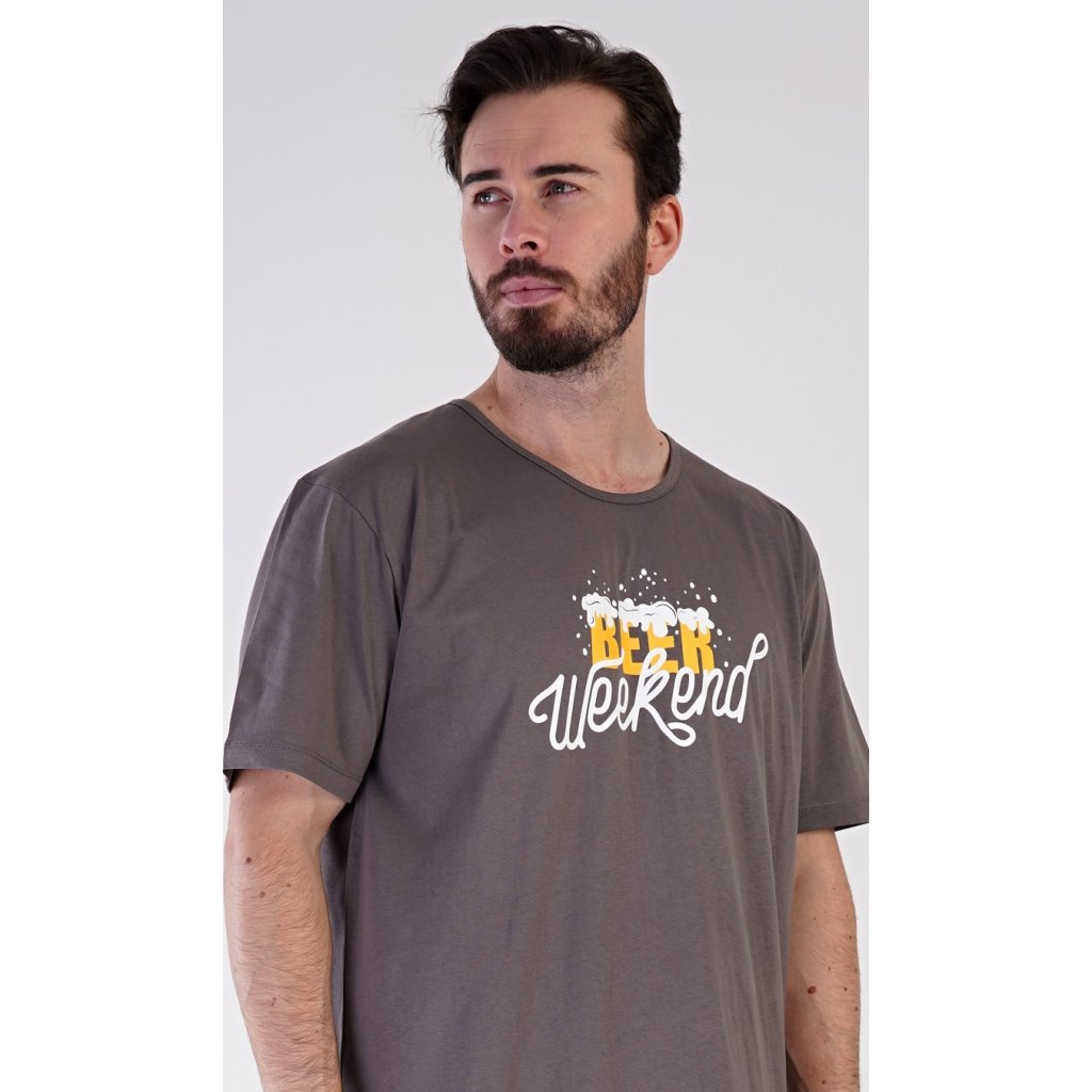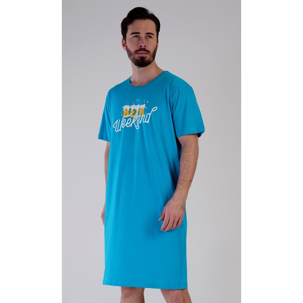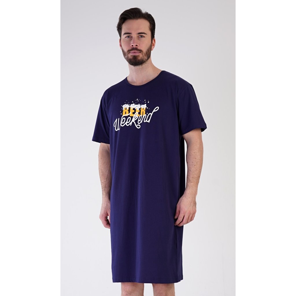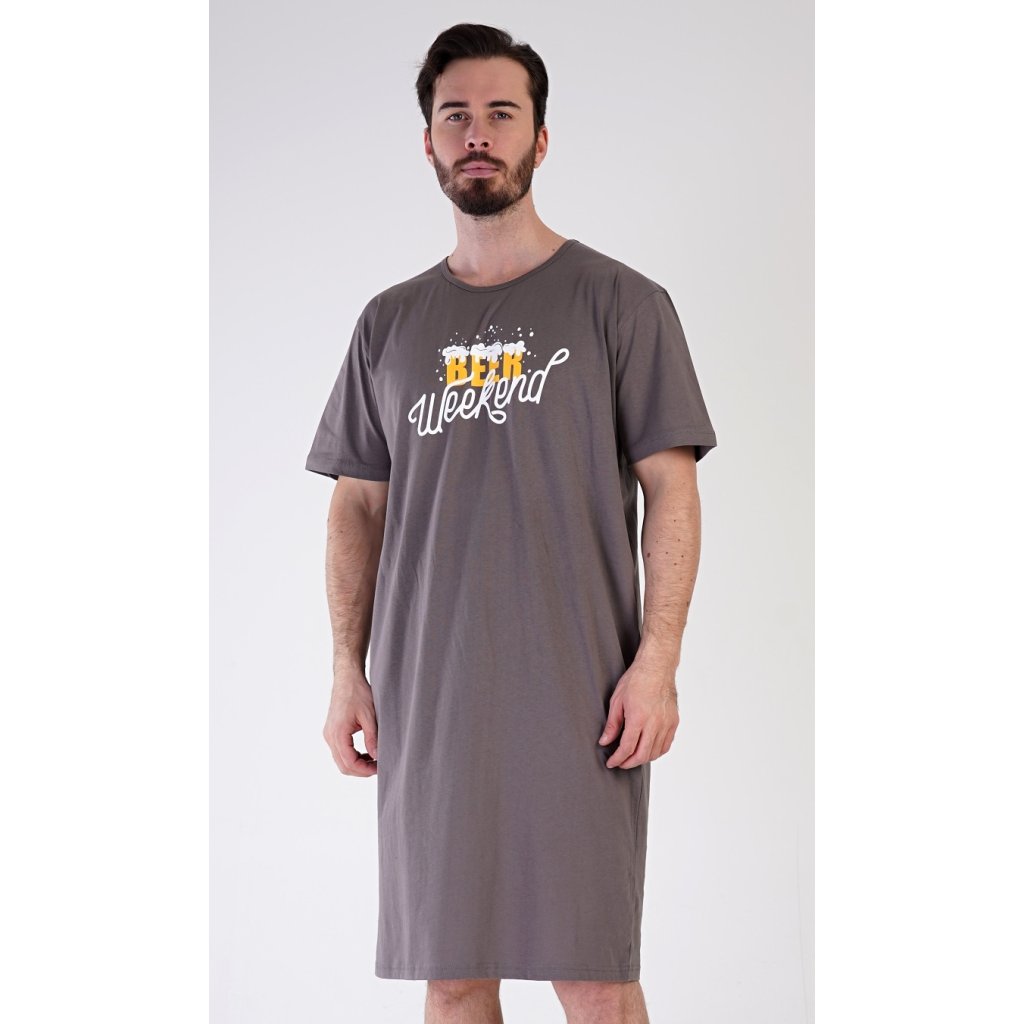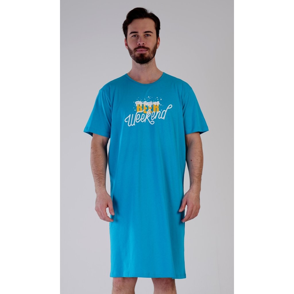 Pánská bavlněná noční košile s krátkým rukávem Beer weekend. Jednobarevná pánská noční košile s kulatým výstřihem a délkou po kolena má na hrudi nápis 'Beer weekend'. Tato košile je vhodným dárkem pro všechny milovníky piva. Použitý materiál je příjemný a poddajný na dotek. Obsah bavlny je 100%.