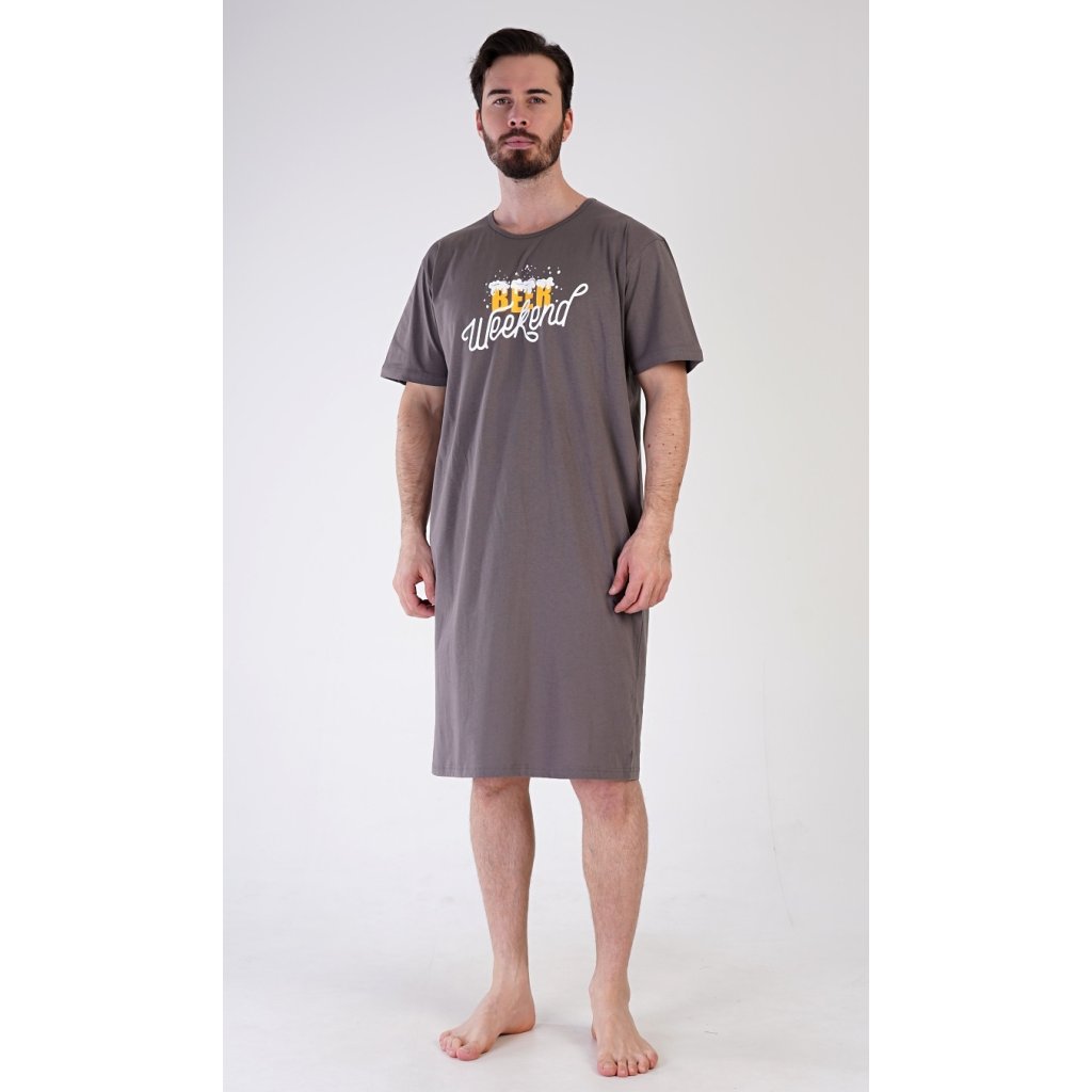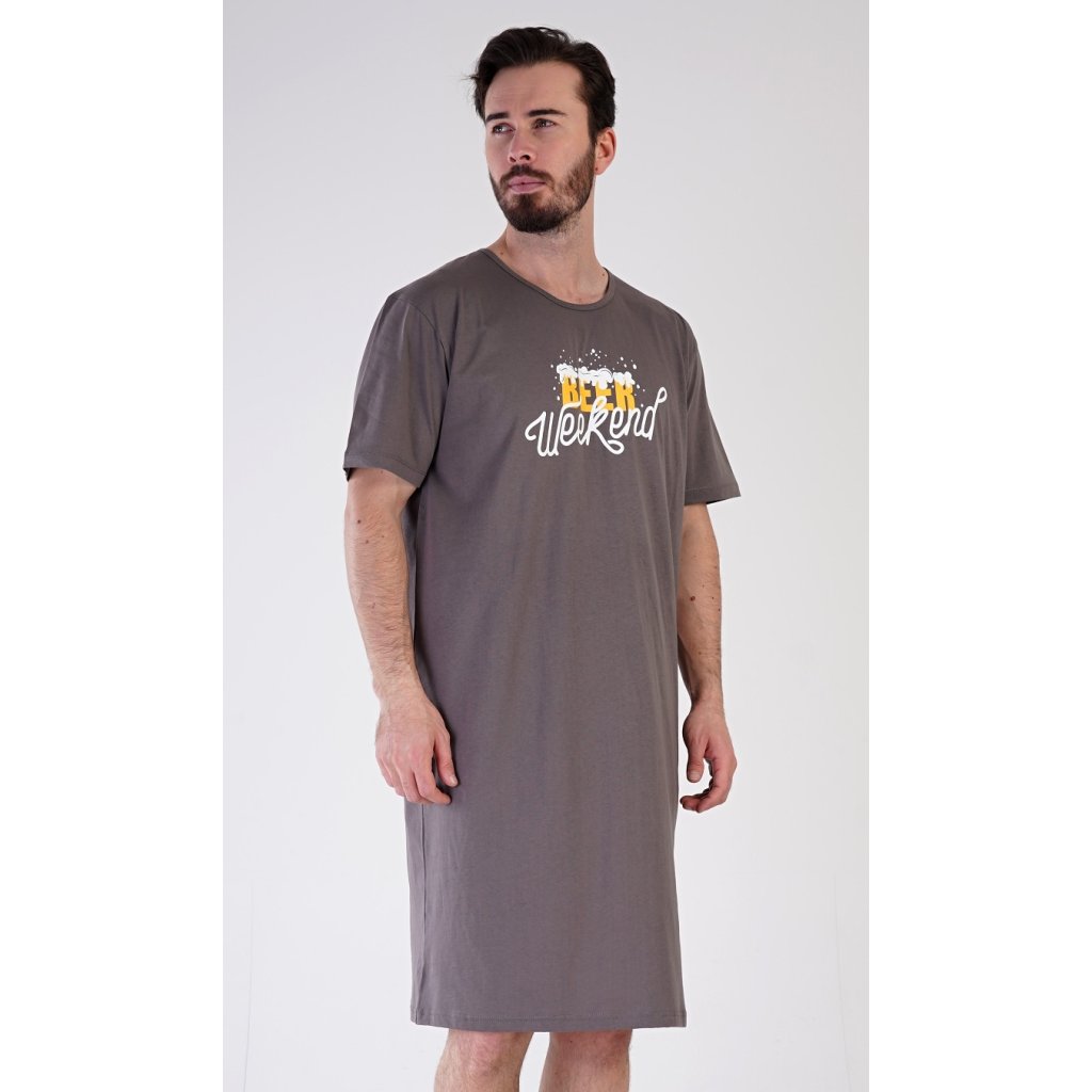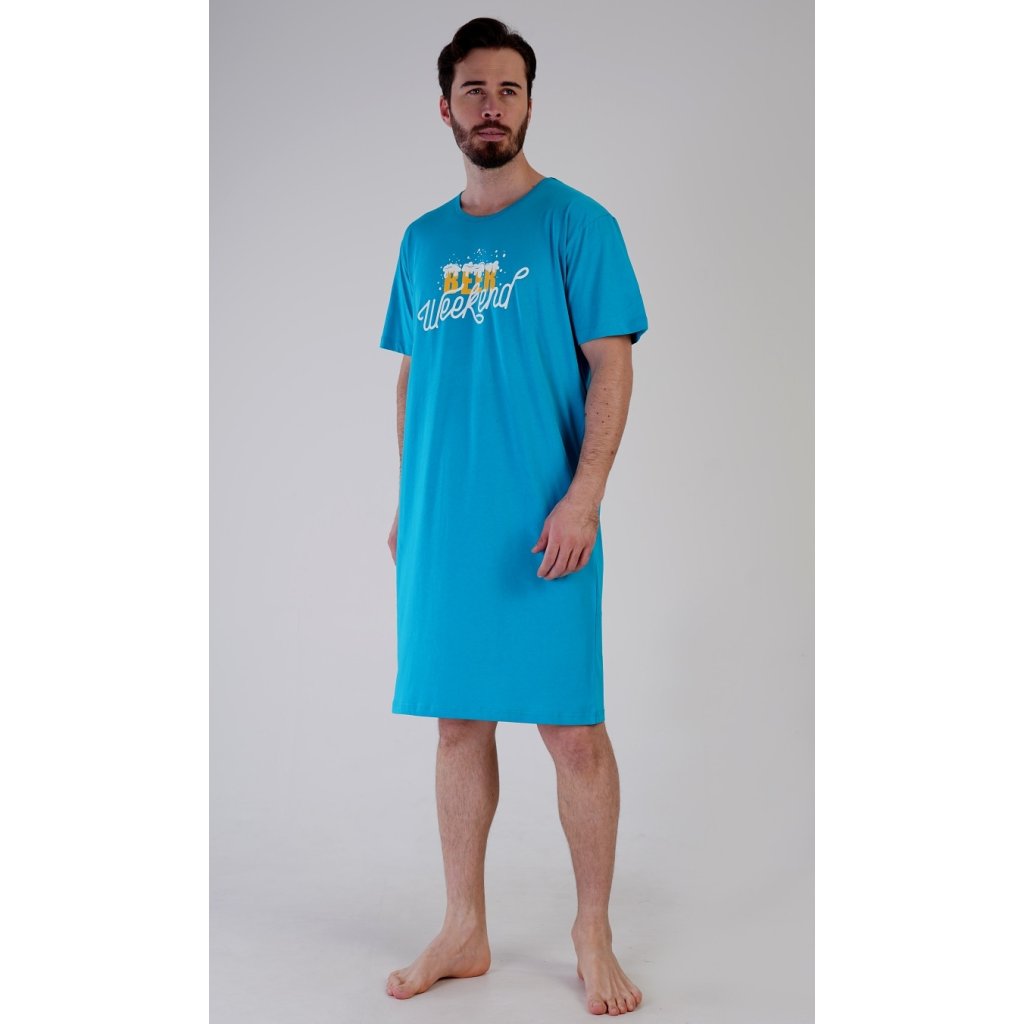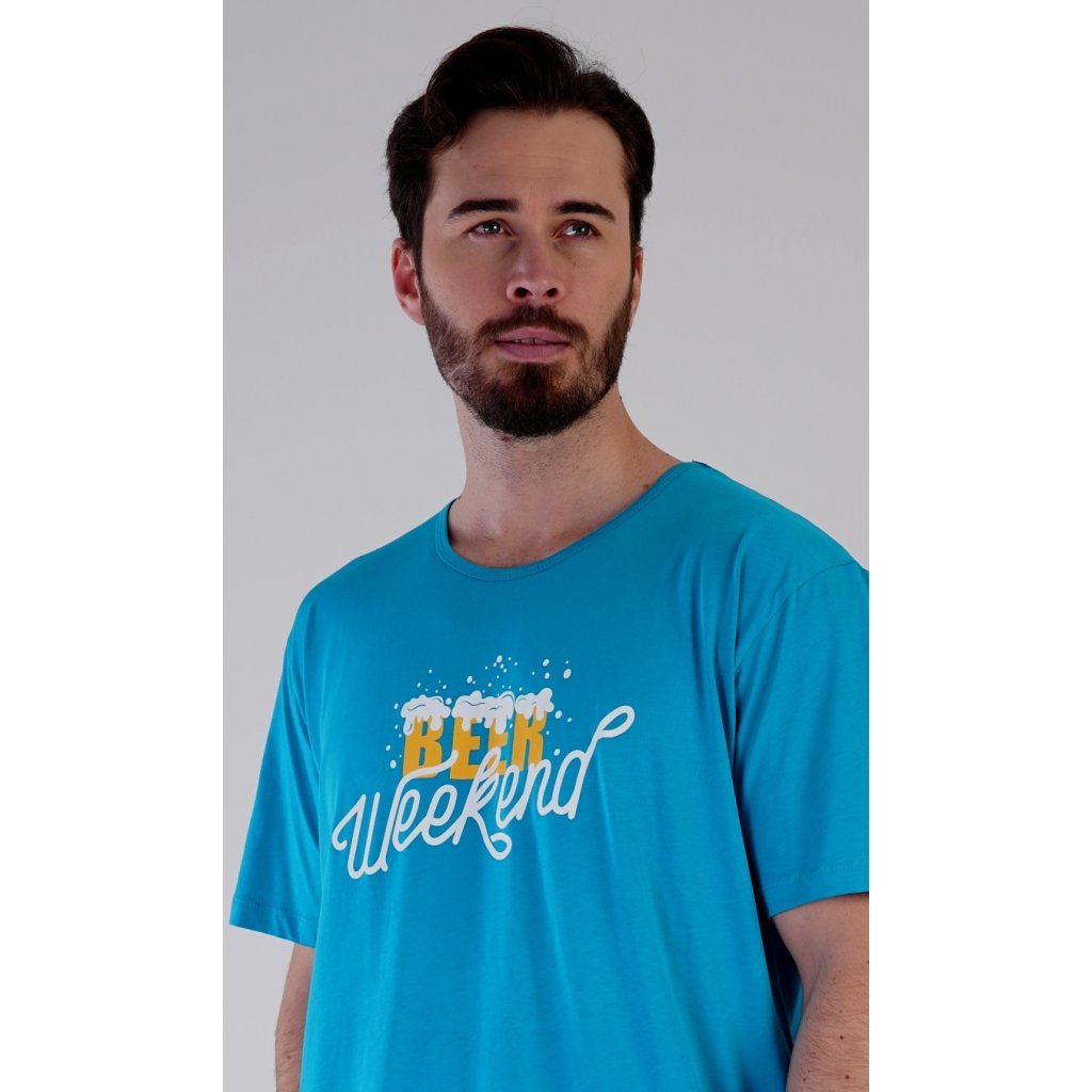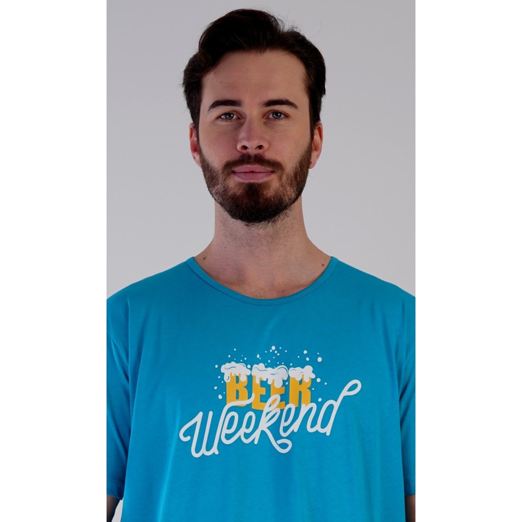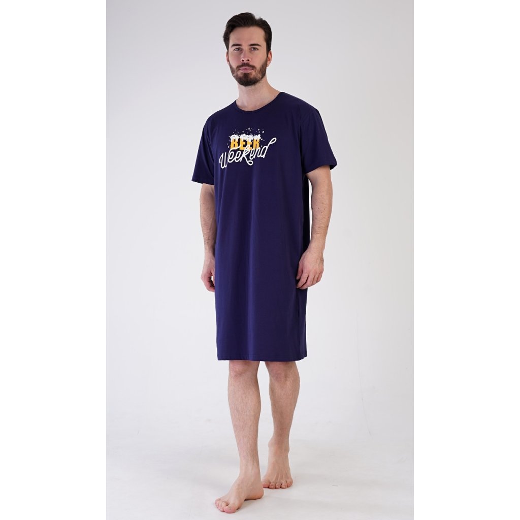 Pánská bavlněná noční košile s krátkým rukávem Beer weekend. Jednobarevná pánská noční košile s kulatým výstřihem a délkou po kolena má na hrudi nápis 'Beer weekend'. Tato košile je vhodným dárkem pro všechny milovníky piva. Použitý materiál je příjemný a poddajný na dotek. Obsah bavlny je 100%.