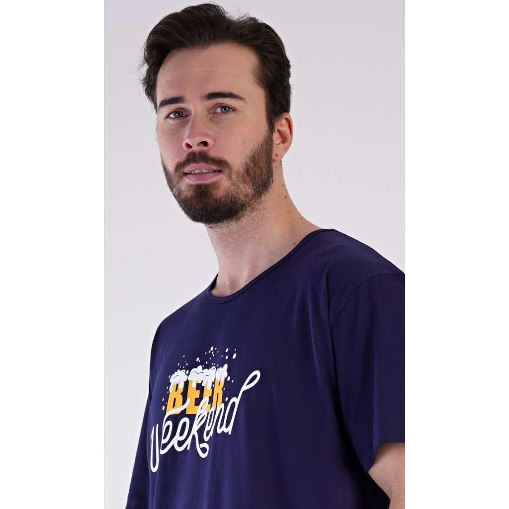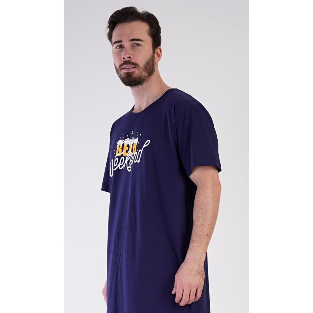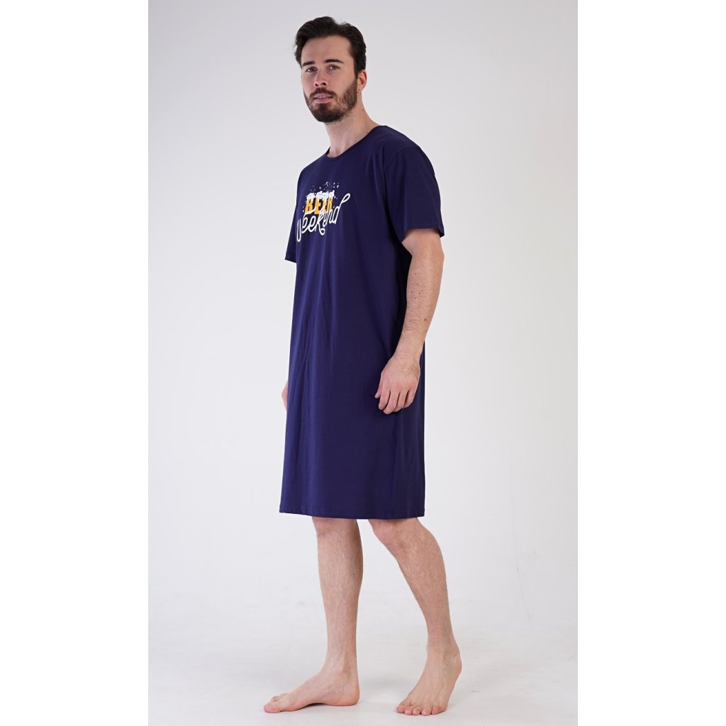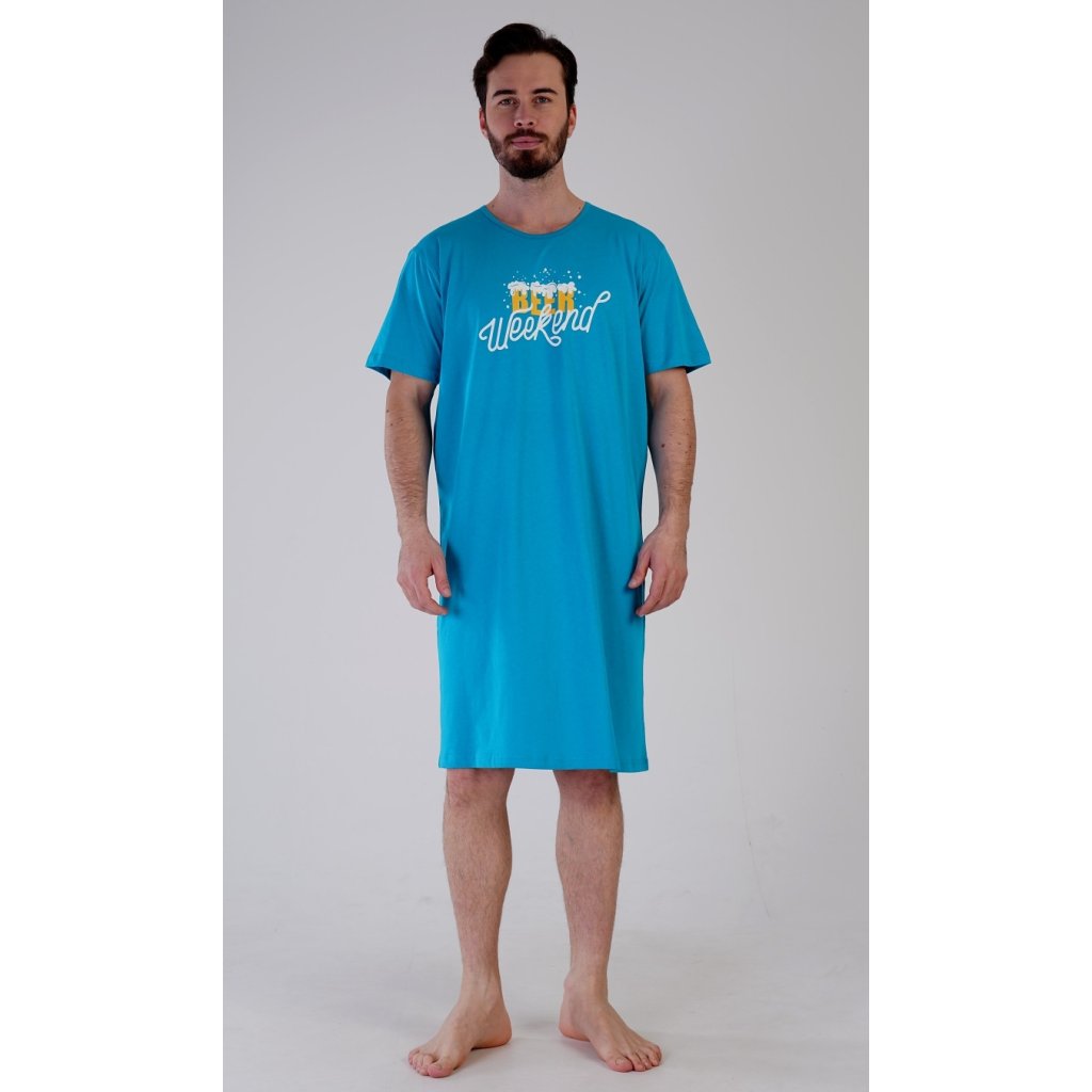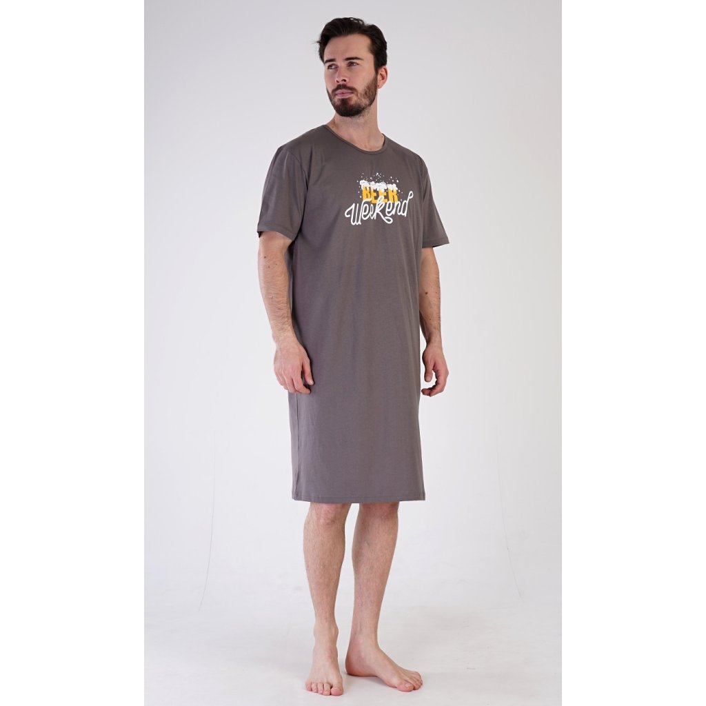 Pánská bavlněná noční košile s krátkým rukávem Beer weekend. Jednobarevná pánská noční košile s kulatým výstřihem a délkou po kolena má na hrudi nápis 'Beer weekend'. Tato košile je vhodným dárkem pro všechny milovníky piva. Použitý materiál je příjemný a poddajný na dotek. Obsah bavlny je 100%.
