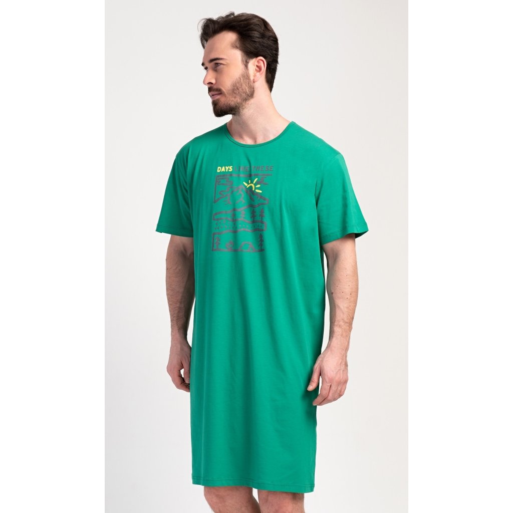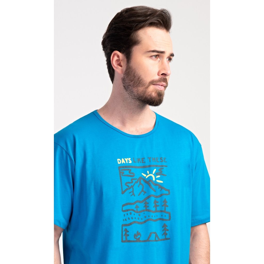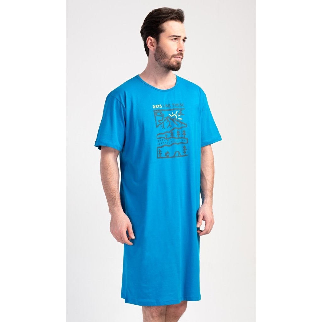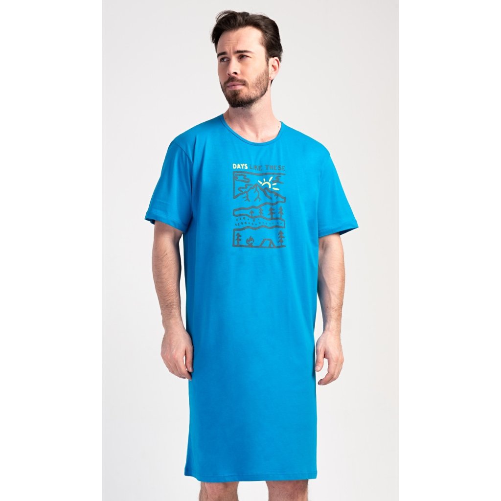 Pánská bavlněná noční košile s krátkým rukávem Outdoor. Jednobarevná pánská noční košile s kulatým výstřihem má na hrudi obrázek lesnaté krajiny a nápis 'Days like these'. Tato košile je vhodným dárkem pro všechny milovníky turistiky. Použitý materiál je příjemný a poddajný na dotek. Obsah bavlny je 100%.