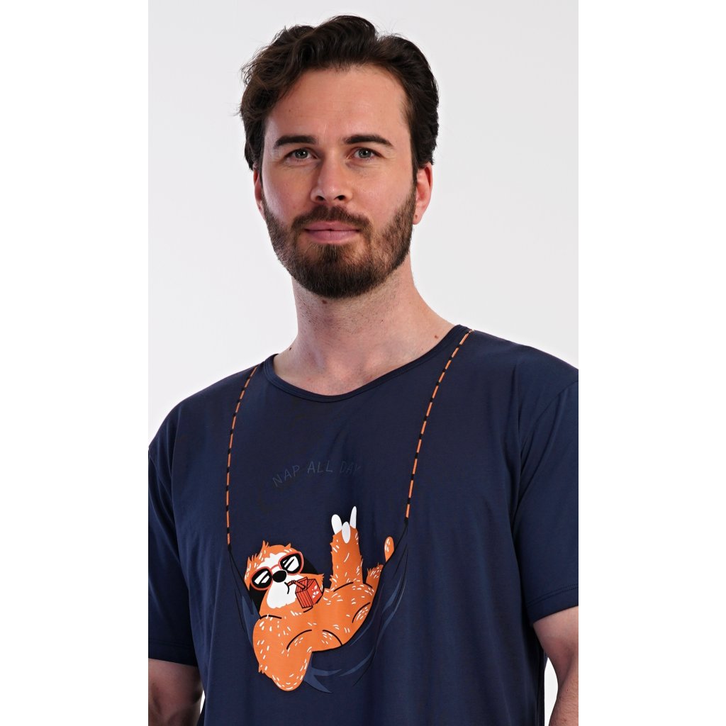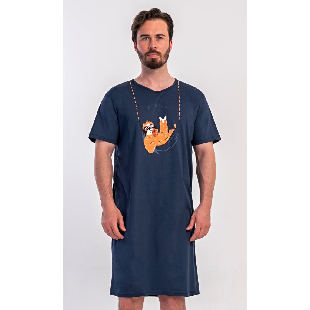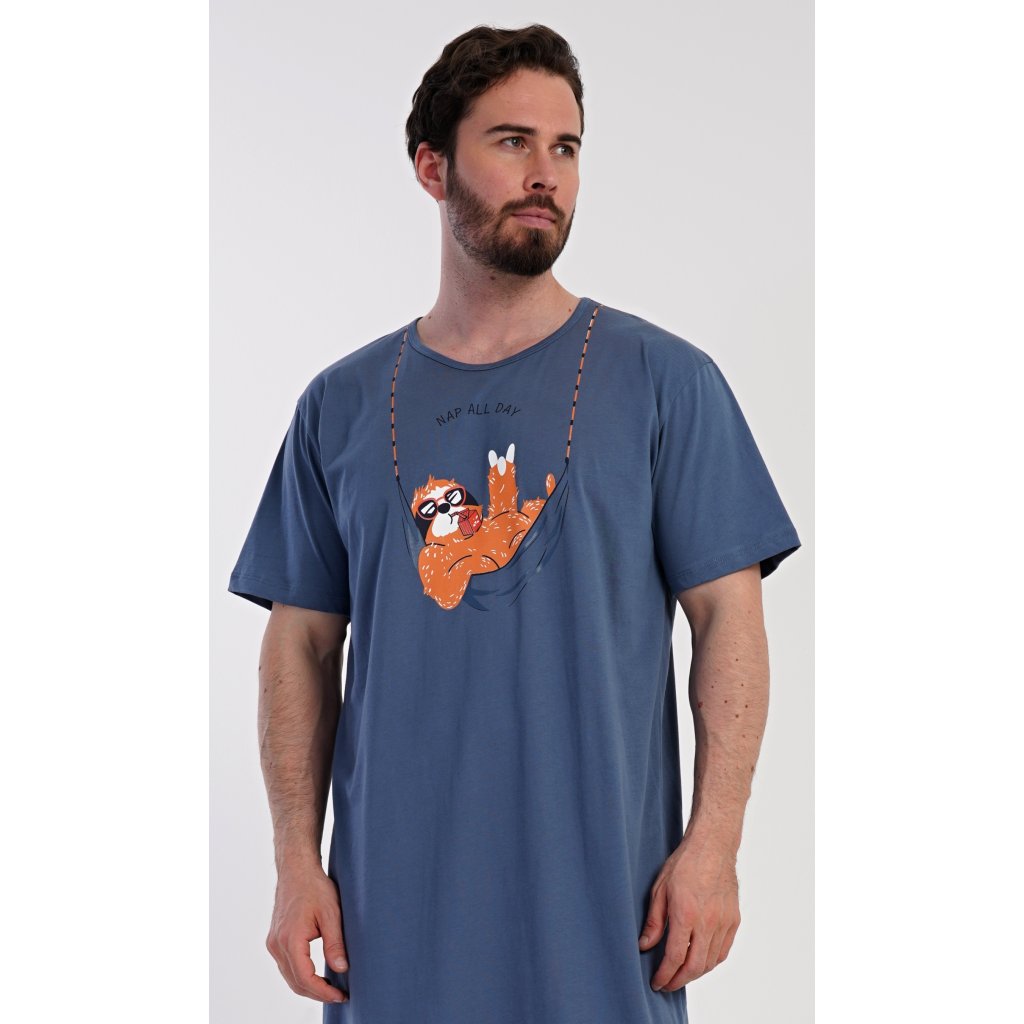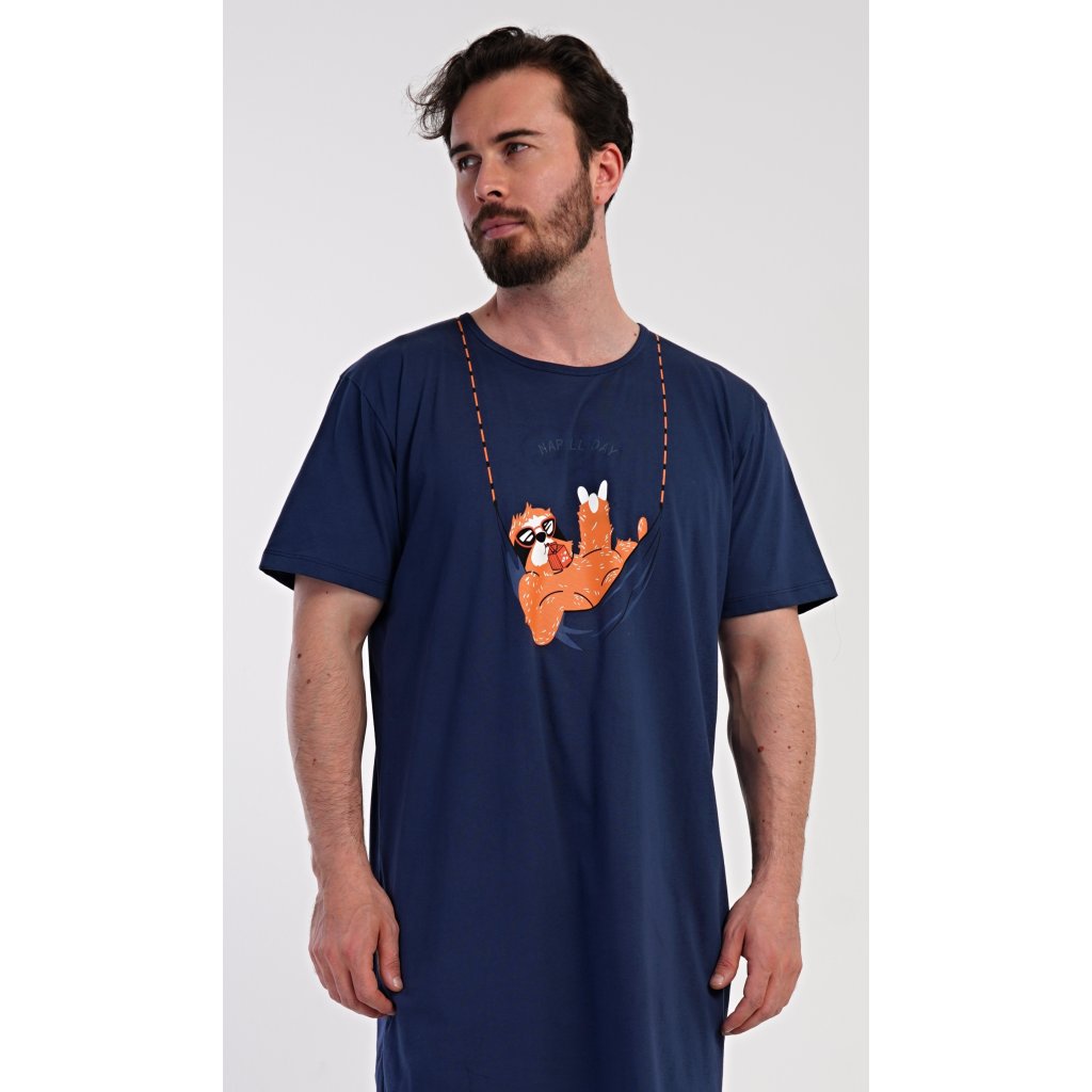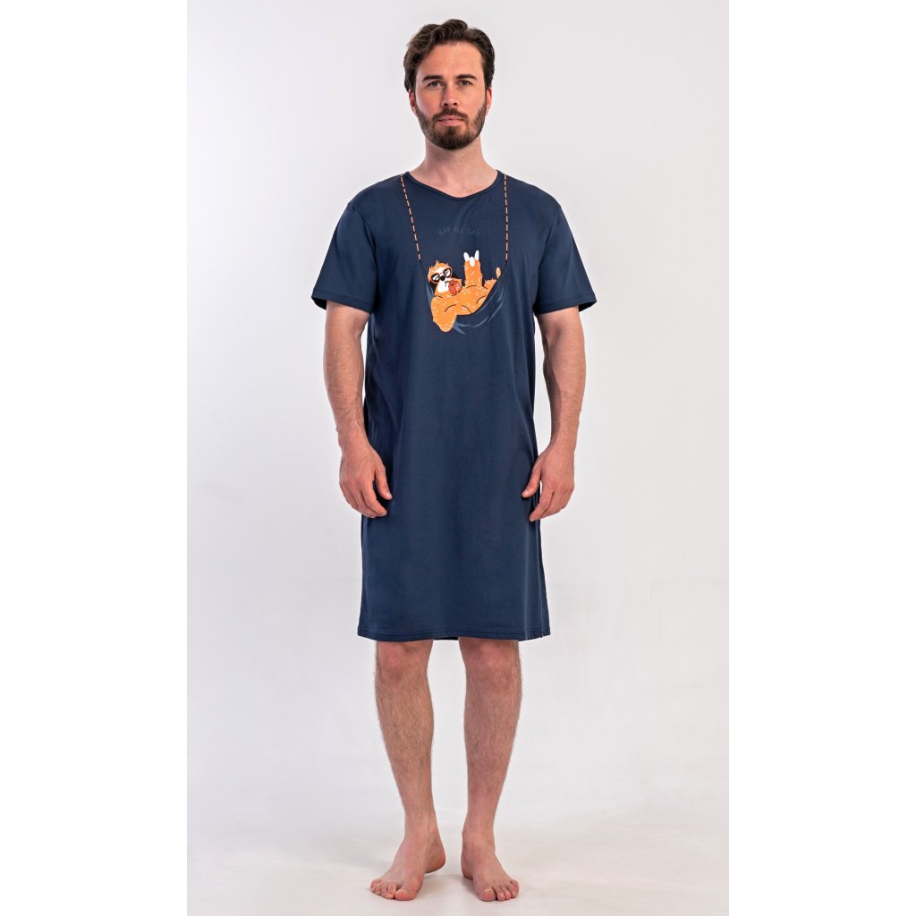 Pánská bavlněná noční košile s krátkým rukávem Pohodář. Jednobarevná pánská noční košile s kulatým výstřihem a délkou po kolena má na hrudi obrázek lenochoda v houpací síti. Použitý materiál s obsahem bavlny 100% je příjemný a poddajný na dotek.