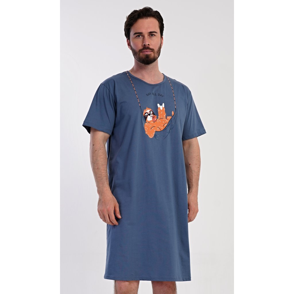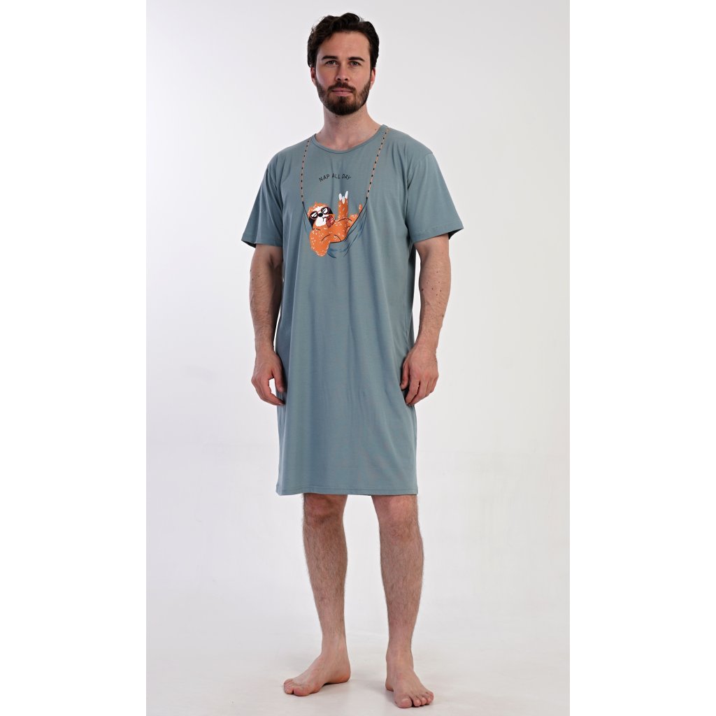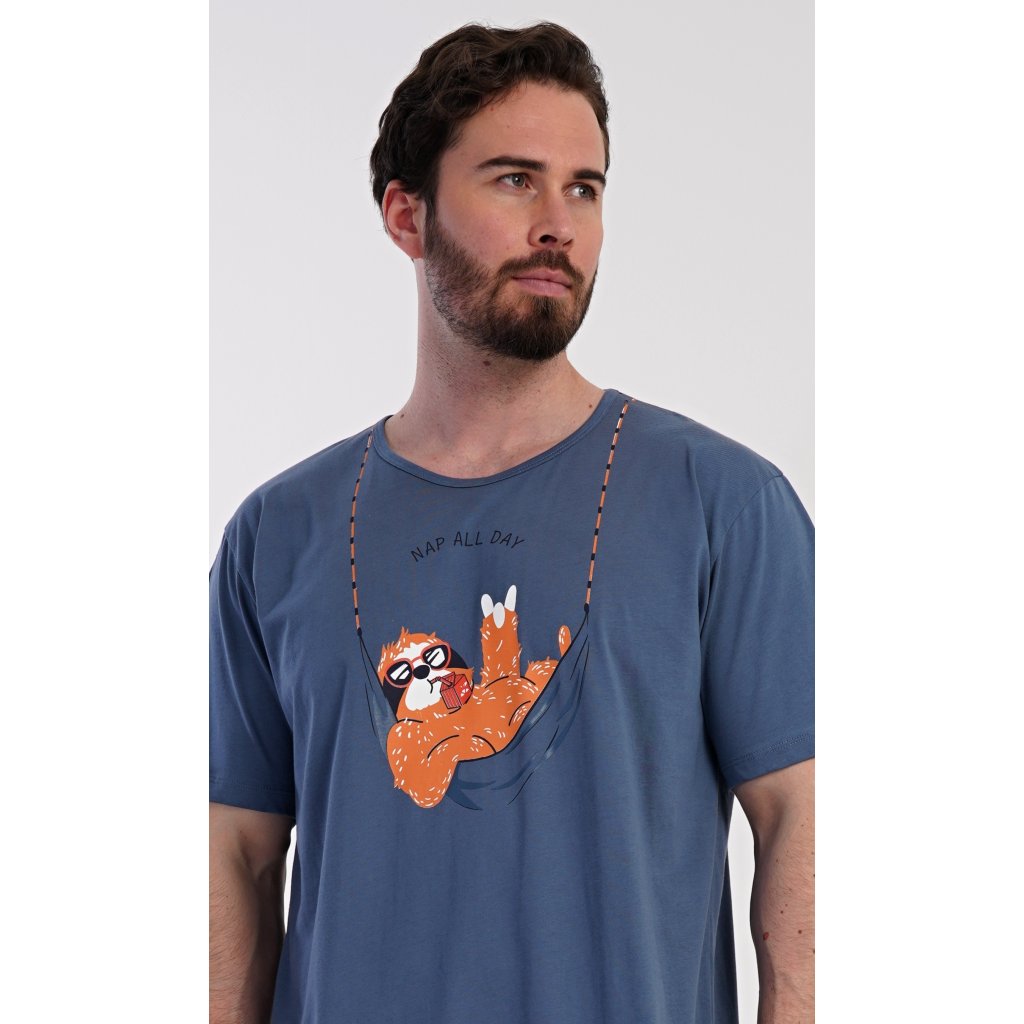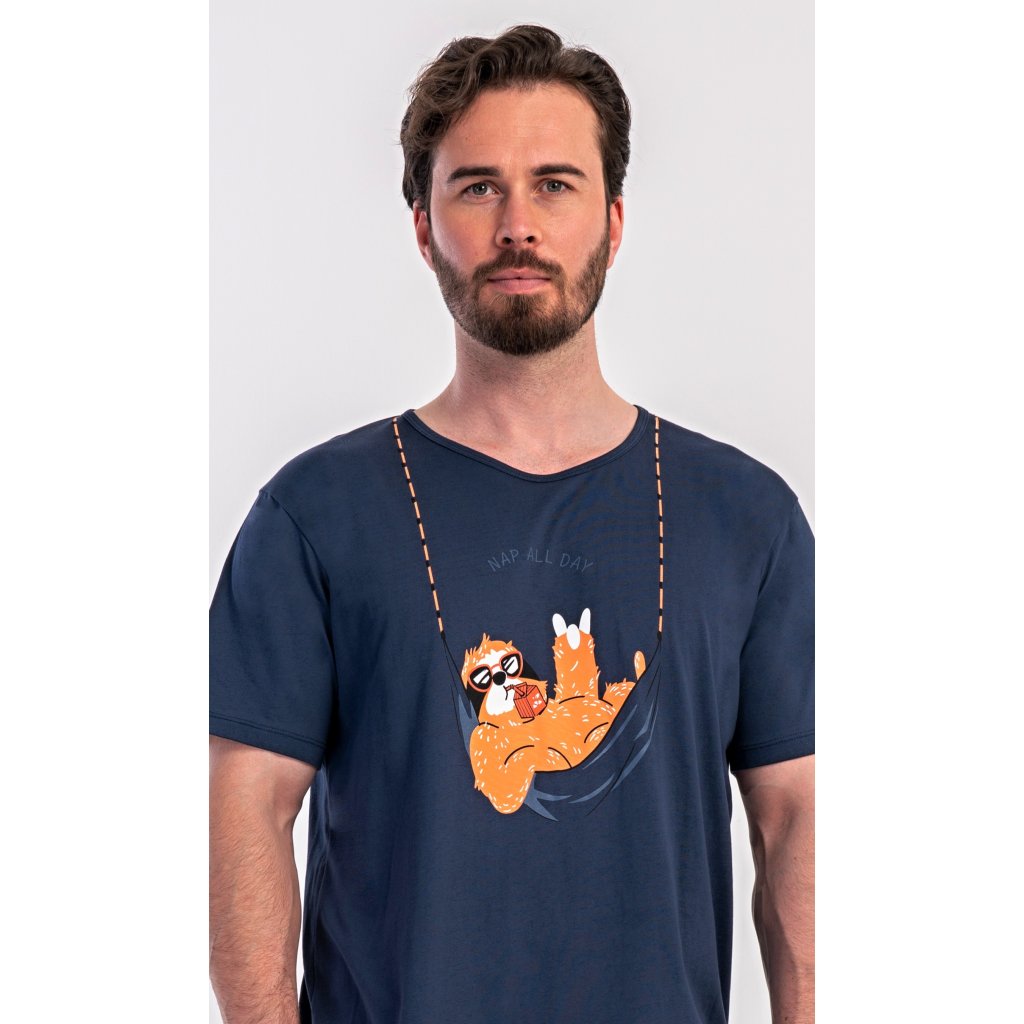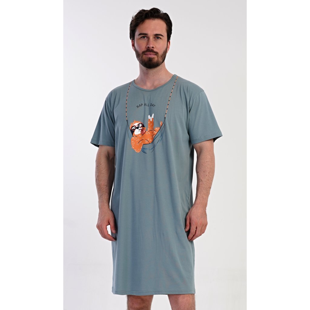 Pánská bavlněná noční košile s krátkým rukávem Pohodář. Jednobarevná pánská noční košile s kulatým výstřihem a délkou po kolena má na hrudi obrázek lenochoda v houpací síti. Použitý materiál s obsahem bavlny 100% je příjemný a poddajný na dotek.