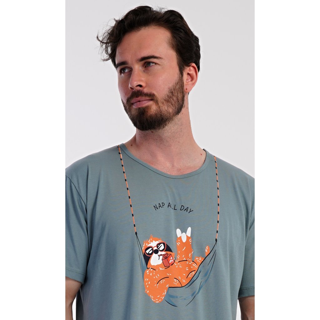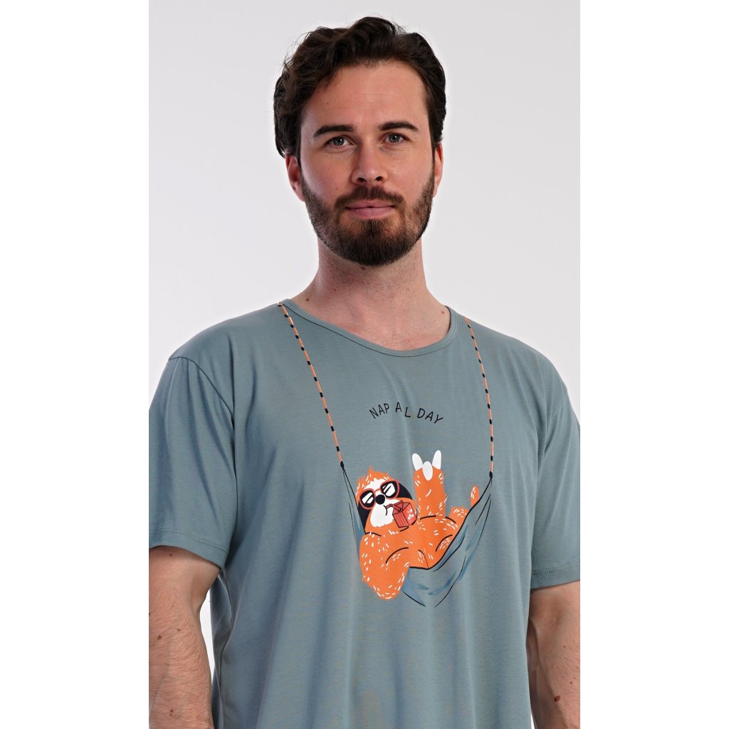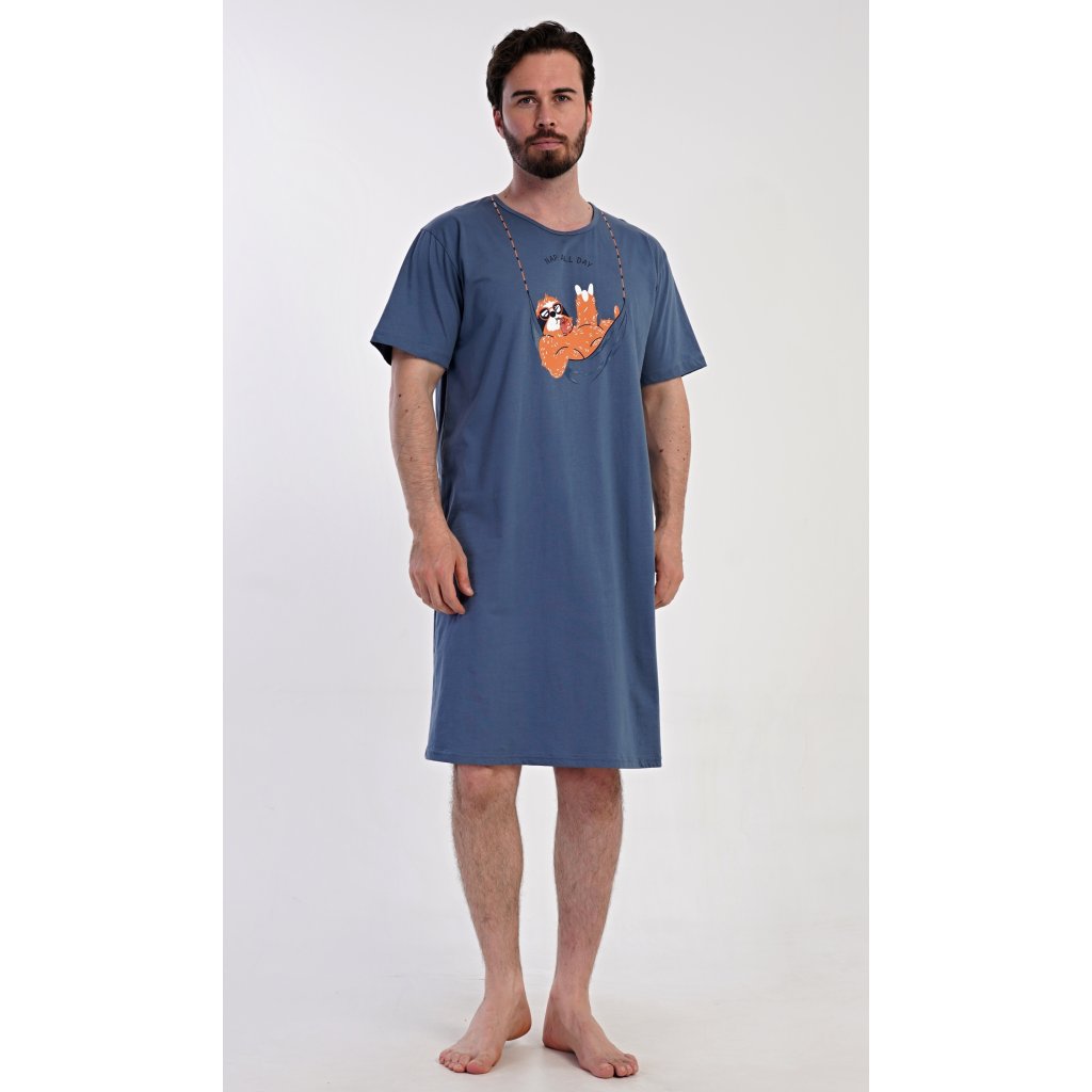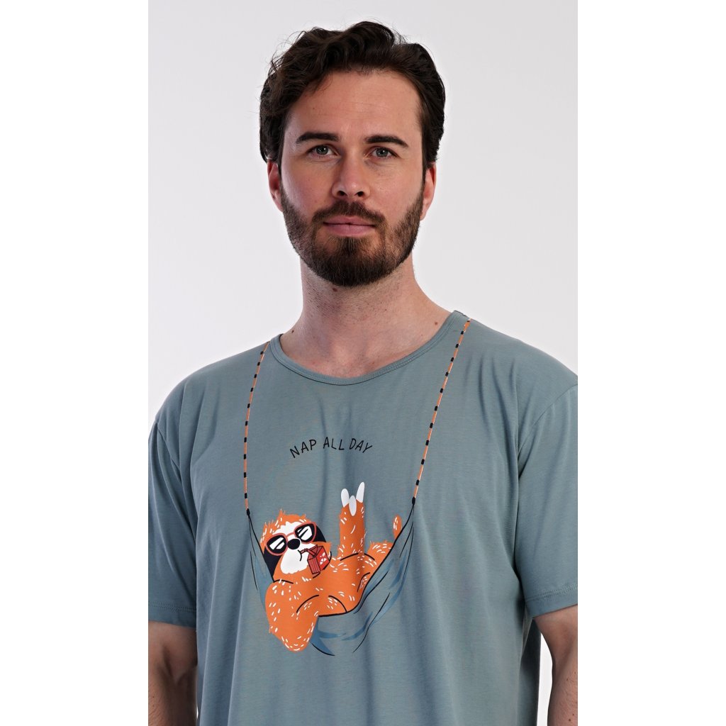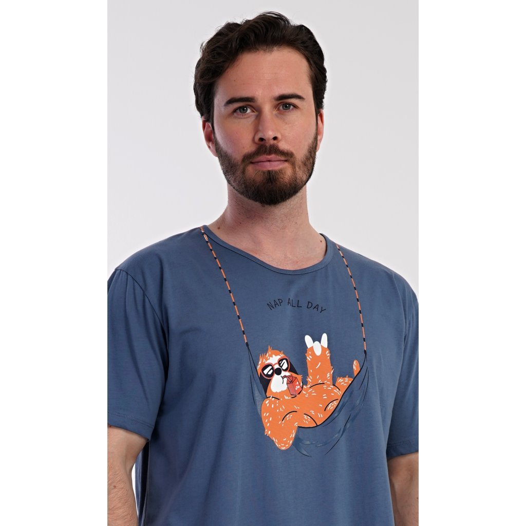 Pánská bavlněná noční košile s krátkým rukávem Pohodář. Jednobarevná pánská noční košile s kulatým výstřihem a délkou po kolena má na hrudi obrázek lenochoda v houpací síti. Použitý materiál s obsahem bavlny 100% je příjemný a poddajný na dotek.