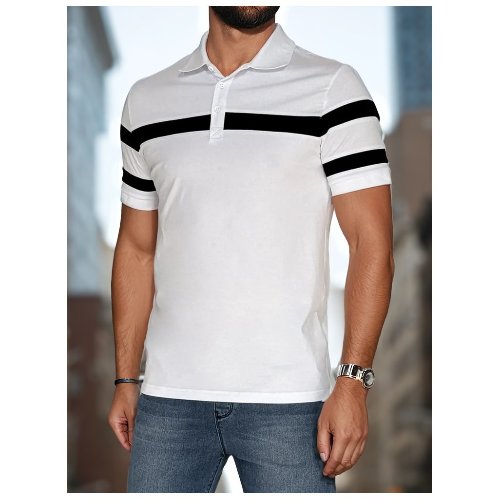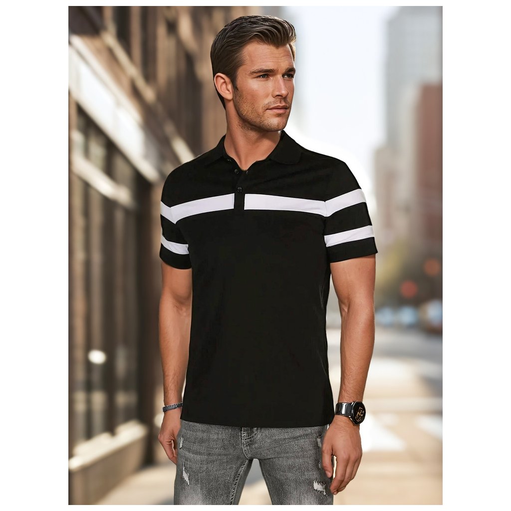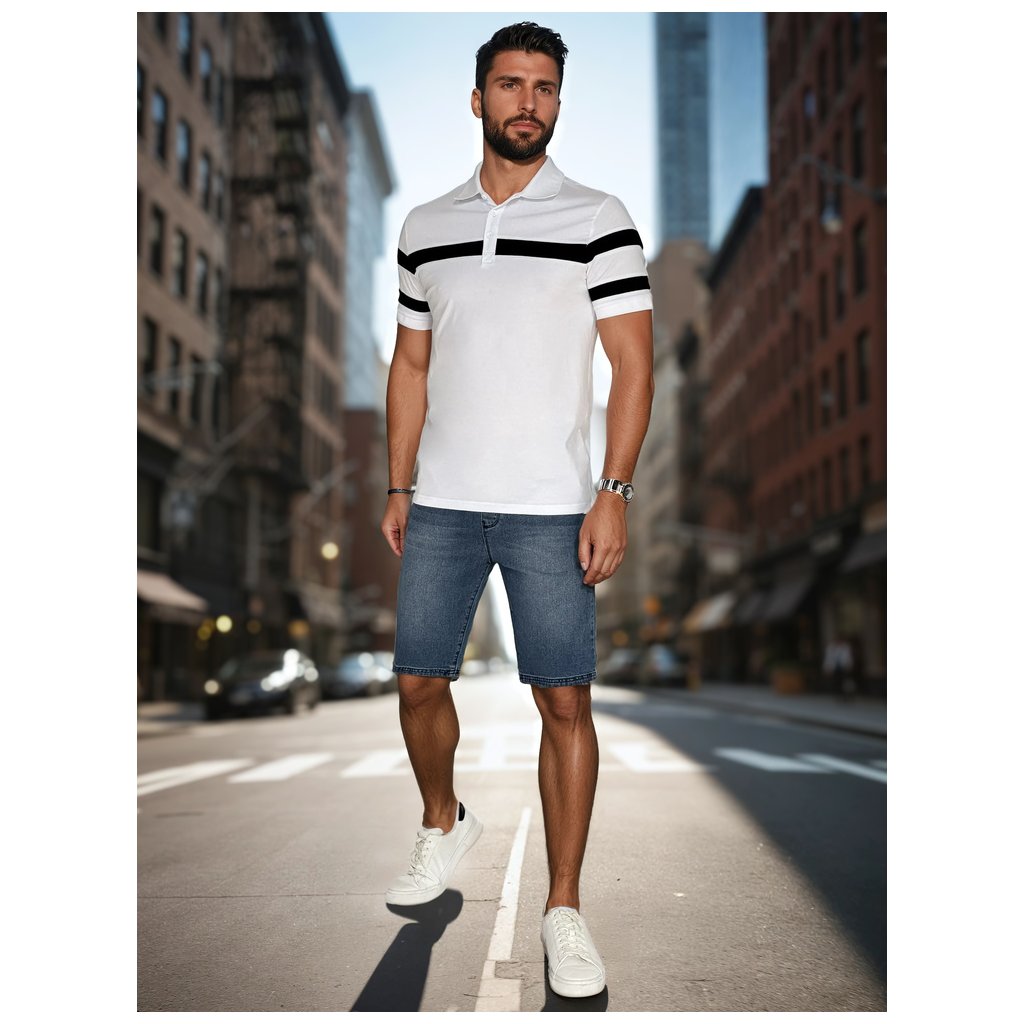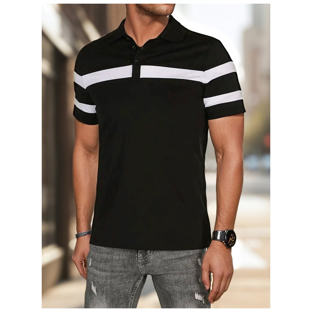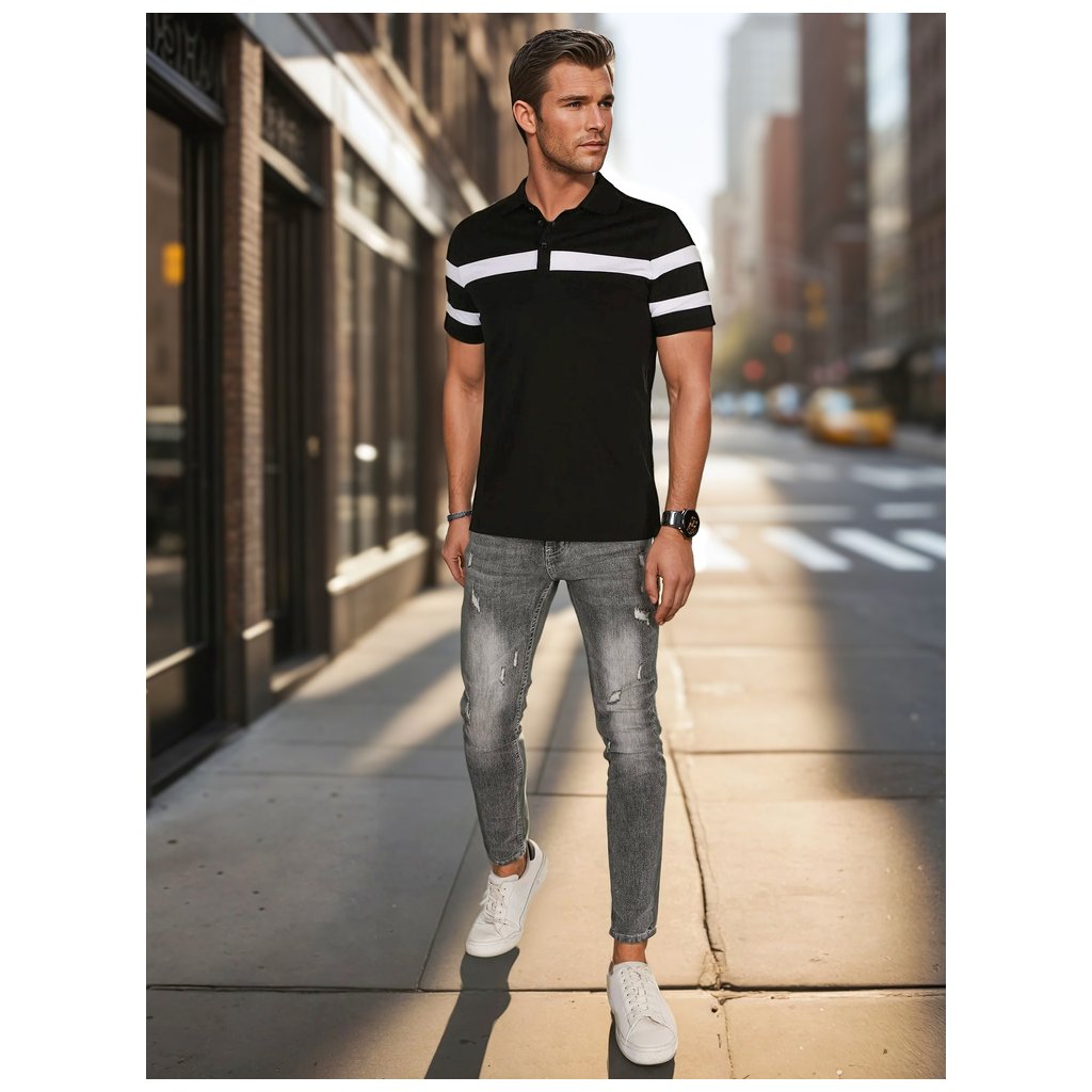 Toto pánské polo tričko s krátkým rukávem je všestrannou volbou pro každodenní nošení. Klasický límec na knoflíky dodává eleganci, zatímco ozdobný proužek vpředu a na rukávech rozbíjí jednoduchý design. Pohodlný střih umožňuje volný pohyb a lehká tkanina je ideální pro teplejší jarní dny.