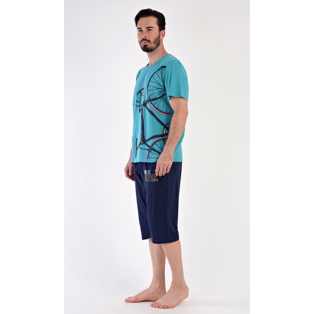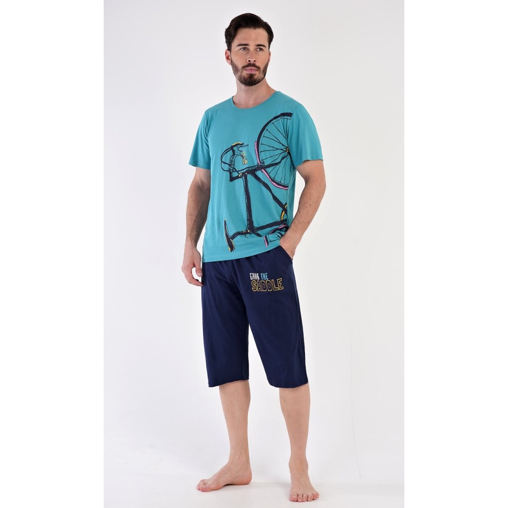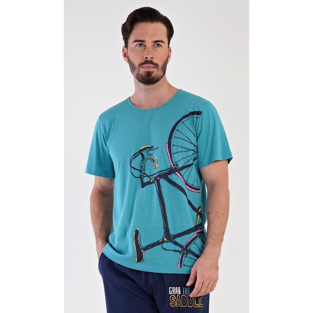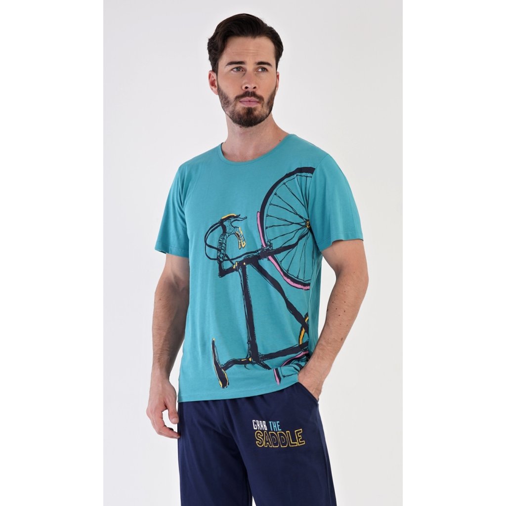 Pánské bavlněné pyžamo bermudy Dominik. Pánské pyžamo se skládá z trička s krátkým rukávem a kalhot po kolena. Jednobarevné triko zdobí výrazný obrázek kola. Kalhoty mají v pase gumu, šňůrku na stažení a praktické kapsy. Použitý materiál je jemný a poddajný na dotek. Podíl bavlny u trika a kalhot je 100%.