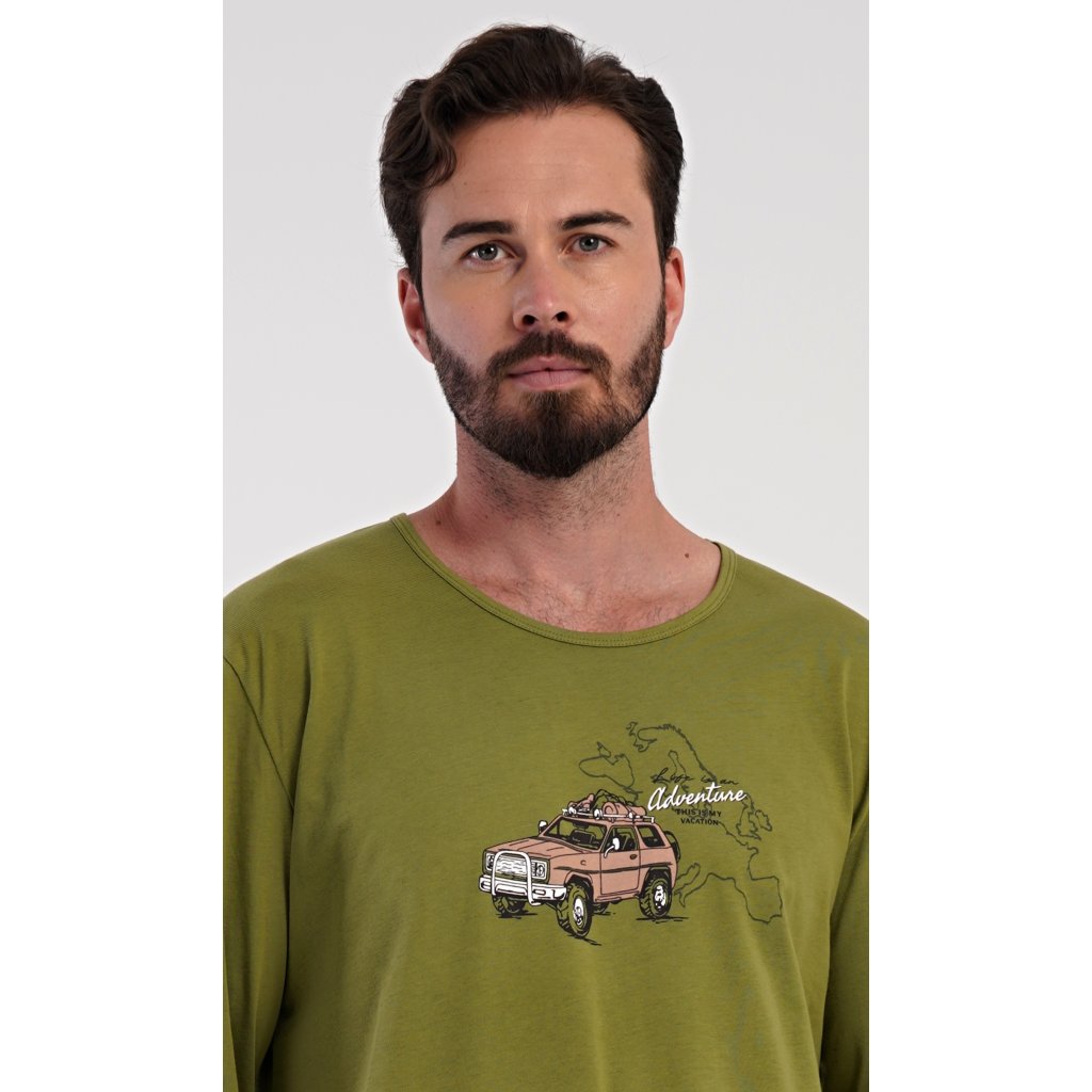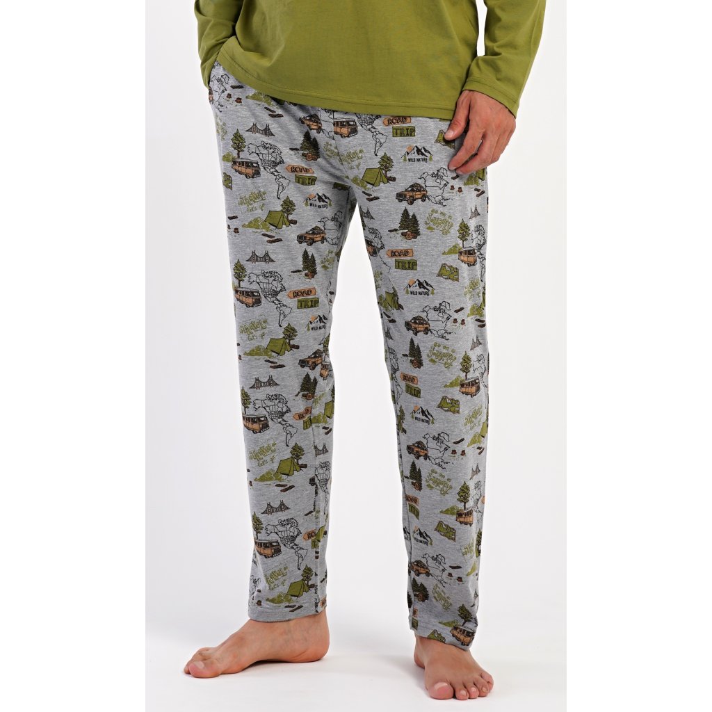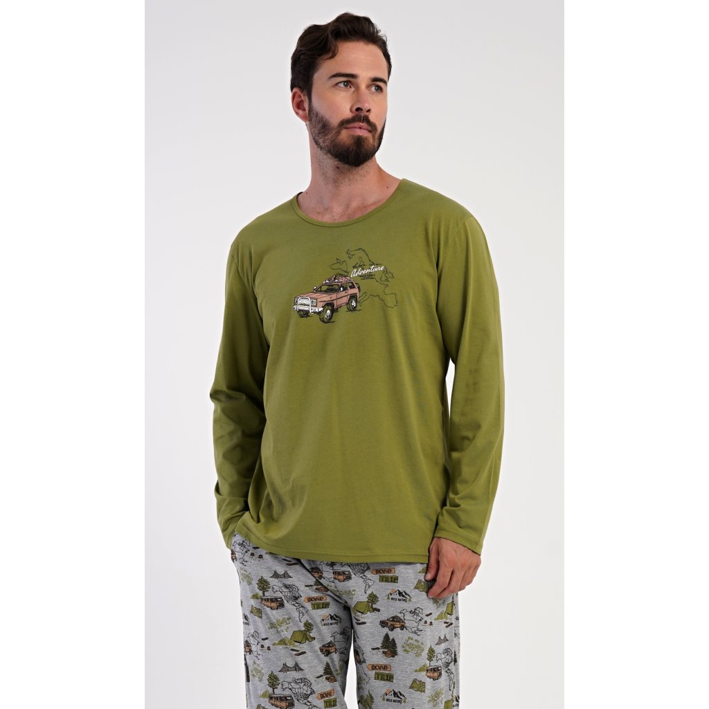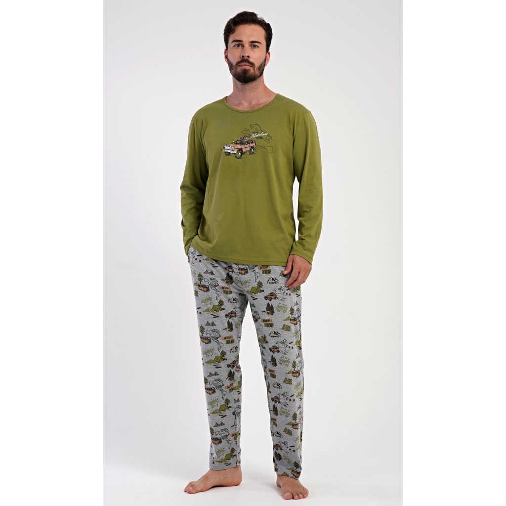 Pánské dlouhé pyžamo Adventure. Pánské pyžamo se skládá z trika s dlouhým rukávem a dlouhých kalhot. Triko je jednobarevné, zdobené na hrudi obrázkem terénního auta. Kalhoty mají v pase gumu, šňůrku na stažení a praktické kapsy. Použitý materiál je příjemný a poddaný na dotek. Obsah bavlny u trika je 100% a u kalhot 70%.