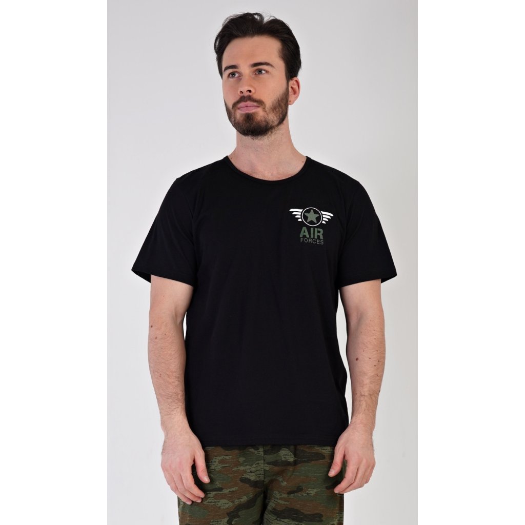 Pánské bavlněné pyžamo dlouhé s krátkým rukávem Air forces. Pánské pyžamo se skládá z trička s krátkým rukávem a dlouhých kalhot. Černé tričko s kulatým výstřihem zdobí menší nápis. Kalhoty s army potiskem mají v pase gumu a šňůrku na stažení, nohavice jsou zakončeny patenty. Kalhoty nemají kapsy. Použitý materiál s obsahem bavlny 100% je příjemný a poddajný na dotek.