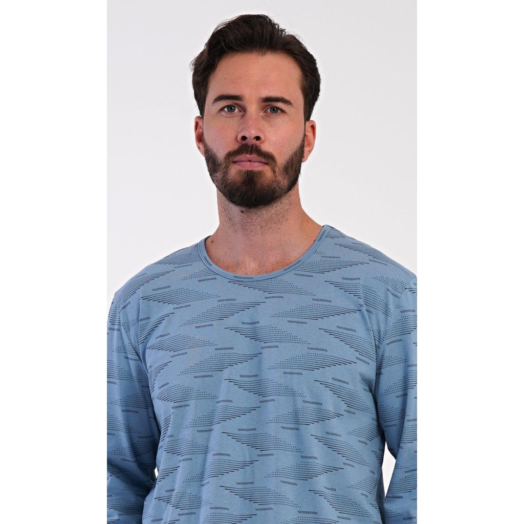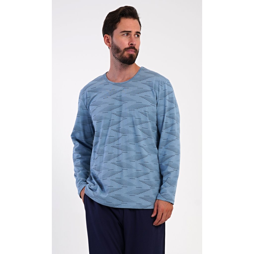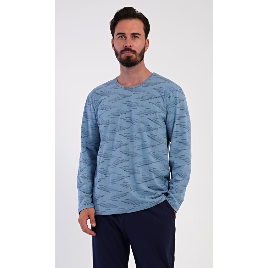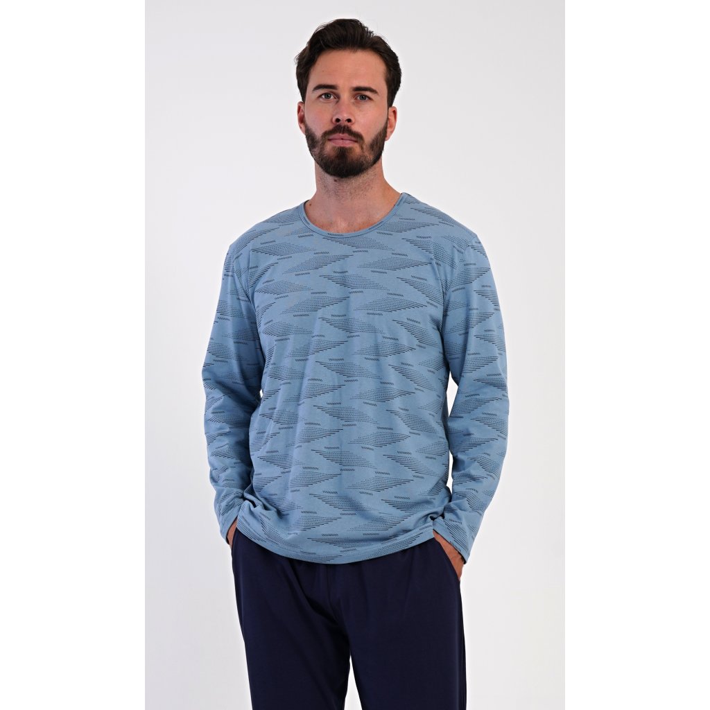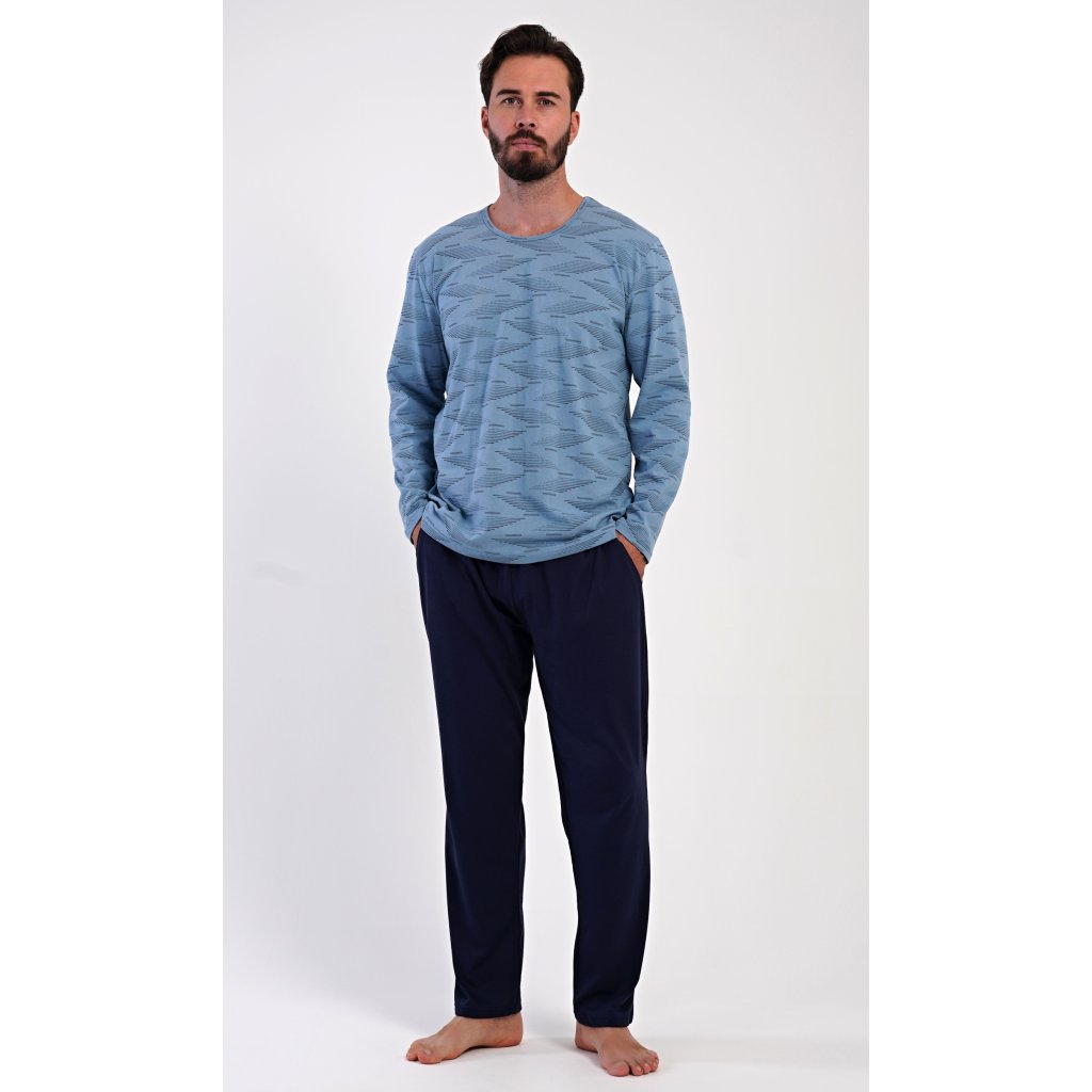 Pánské dlouhé bavlněné pyžamo Arny. Pánské pyžamo se skládá z trika s dlouhým rukávem a dlouhých kalhot. Triko s kulatým výstřihem je potištěno geometrickým vzorem. Jednobarevné kalhoty mají v pase gumu, šňůrku na stažení a praktické kapsy. Použitý materiál s obsahem bavlny 100% je poddajný a příjemný na dotek.