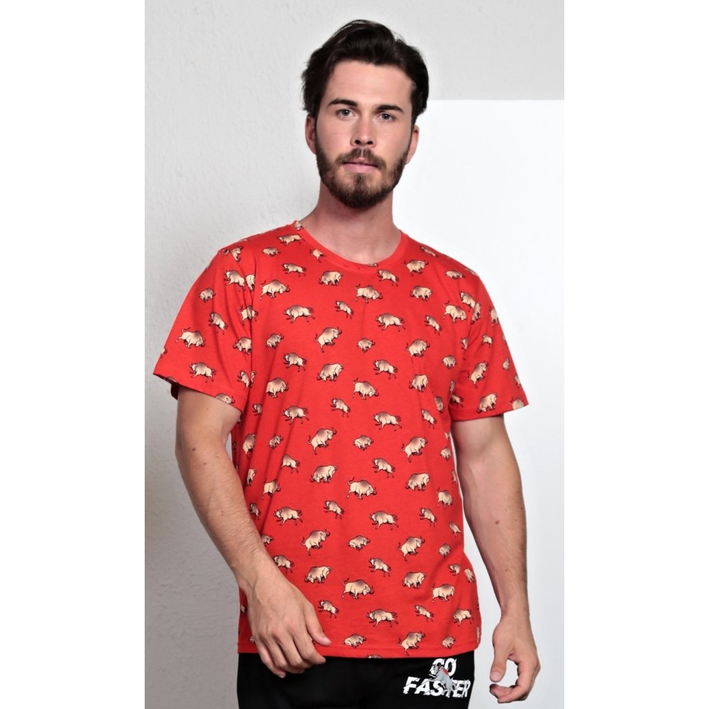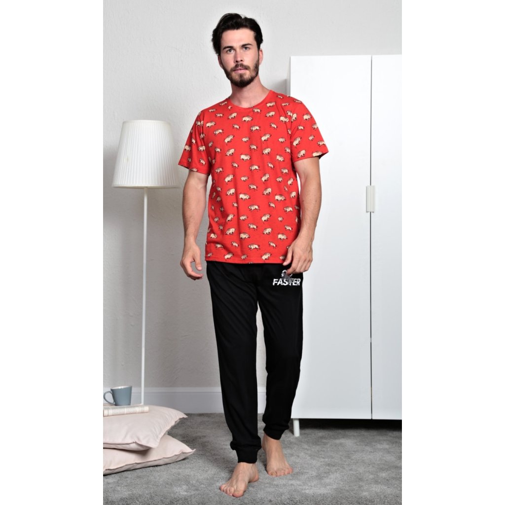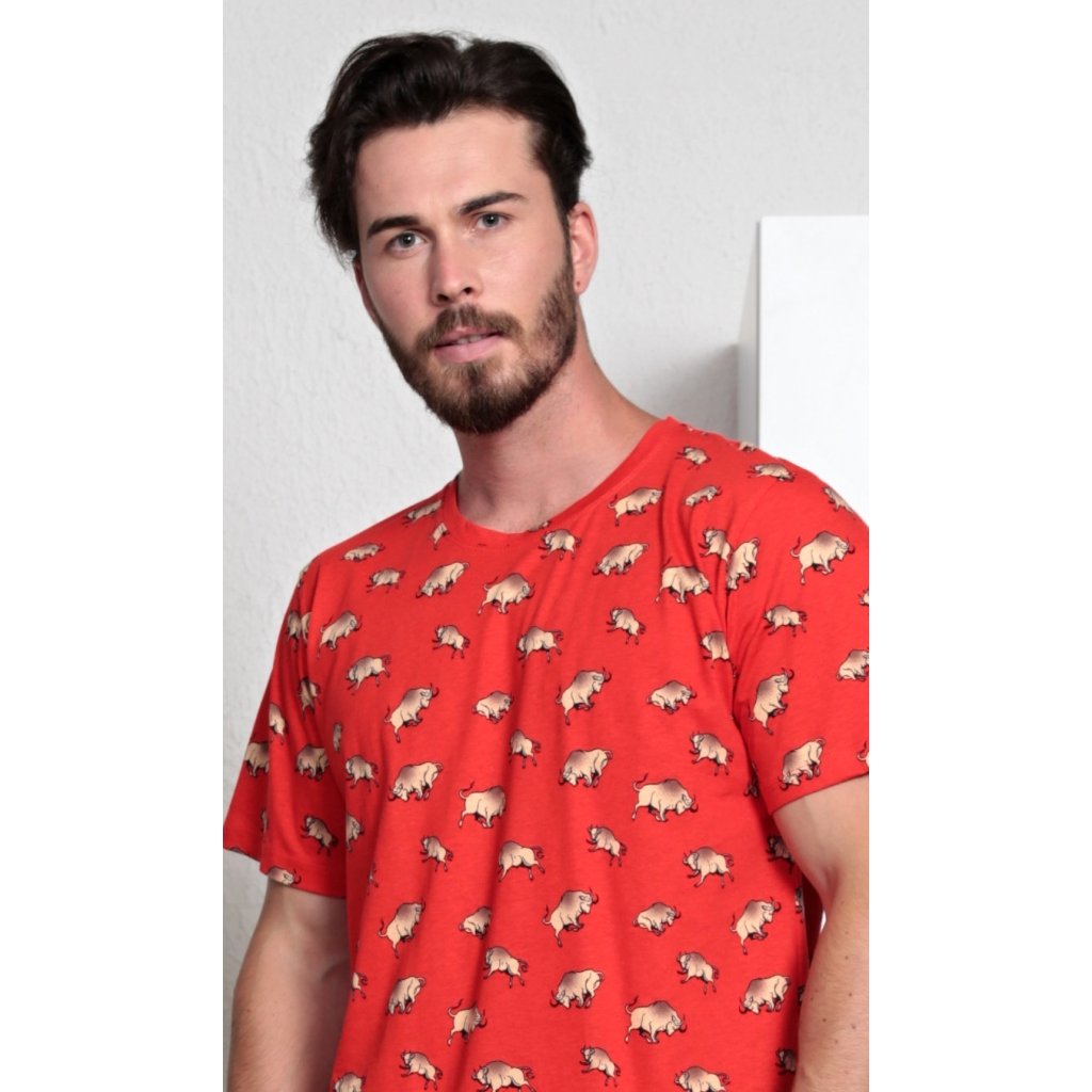 Pánské bavlněné pyžamo dlouhé s krátkým rukávem Býk. Pánské pyžamo se skládá z trička s krátkým rukávem a dlouhých kalhot. Na červeném tričku je je potisk býků. Kalhoty s kapsami mají v pase gumu a šňůrku, nohavice jsou zakončeny patenty. Použitý materiál s obsahem bavlny 100% je příjemný a poddajný na dotek.