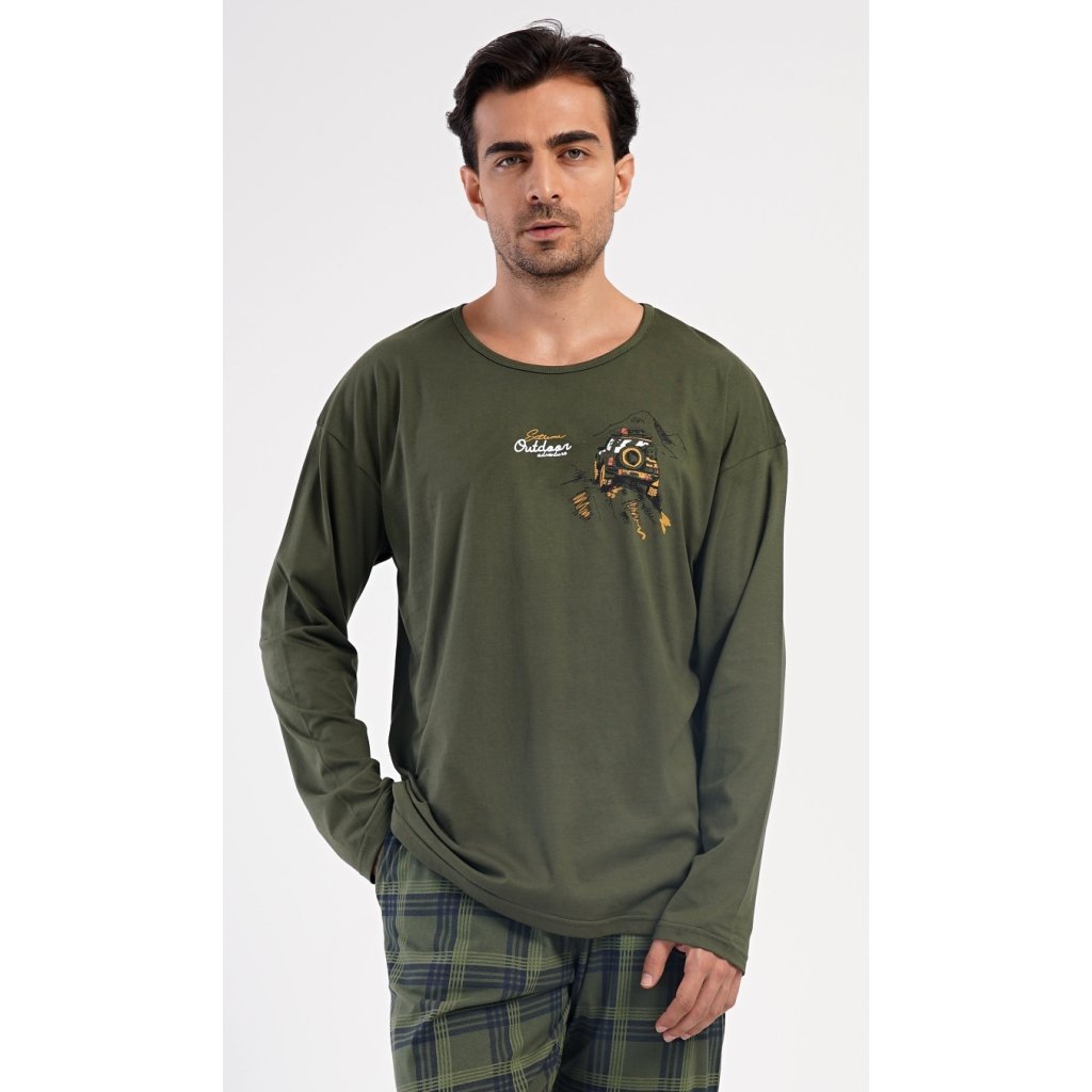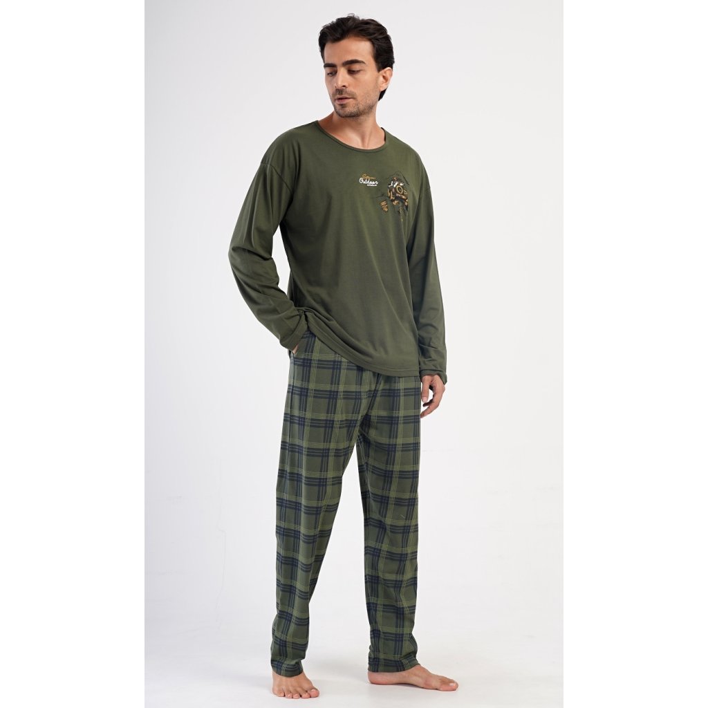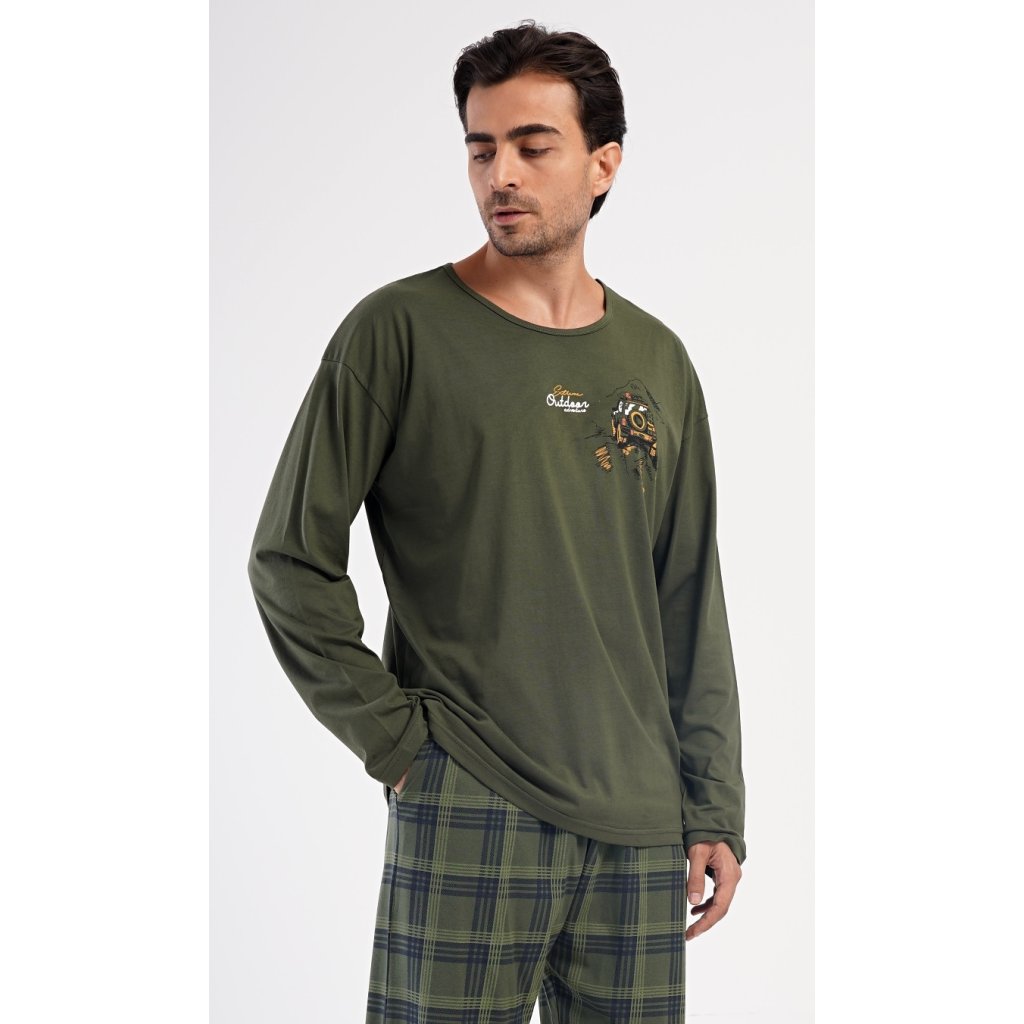 Pánské dlouhé bavlněné pyžamo David. Pánské pyžamo se skládá z trika s dlouhým rukávem a dlouhých kalhot. Triko je jednobarevné, zdobené na hrudi obrázkem terénního auta a nápisem 'Extreme outdoor adventure'. Kostkované kalhoty mají v pase gumu, šňůrku na stažení a praktické kapsy. Použitý materiál s obsahem bavlny 100% je poddajný a příjemný na dotek.