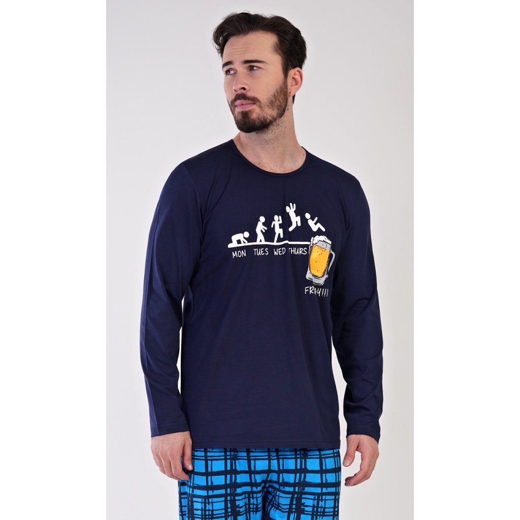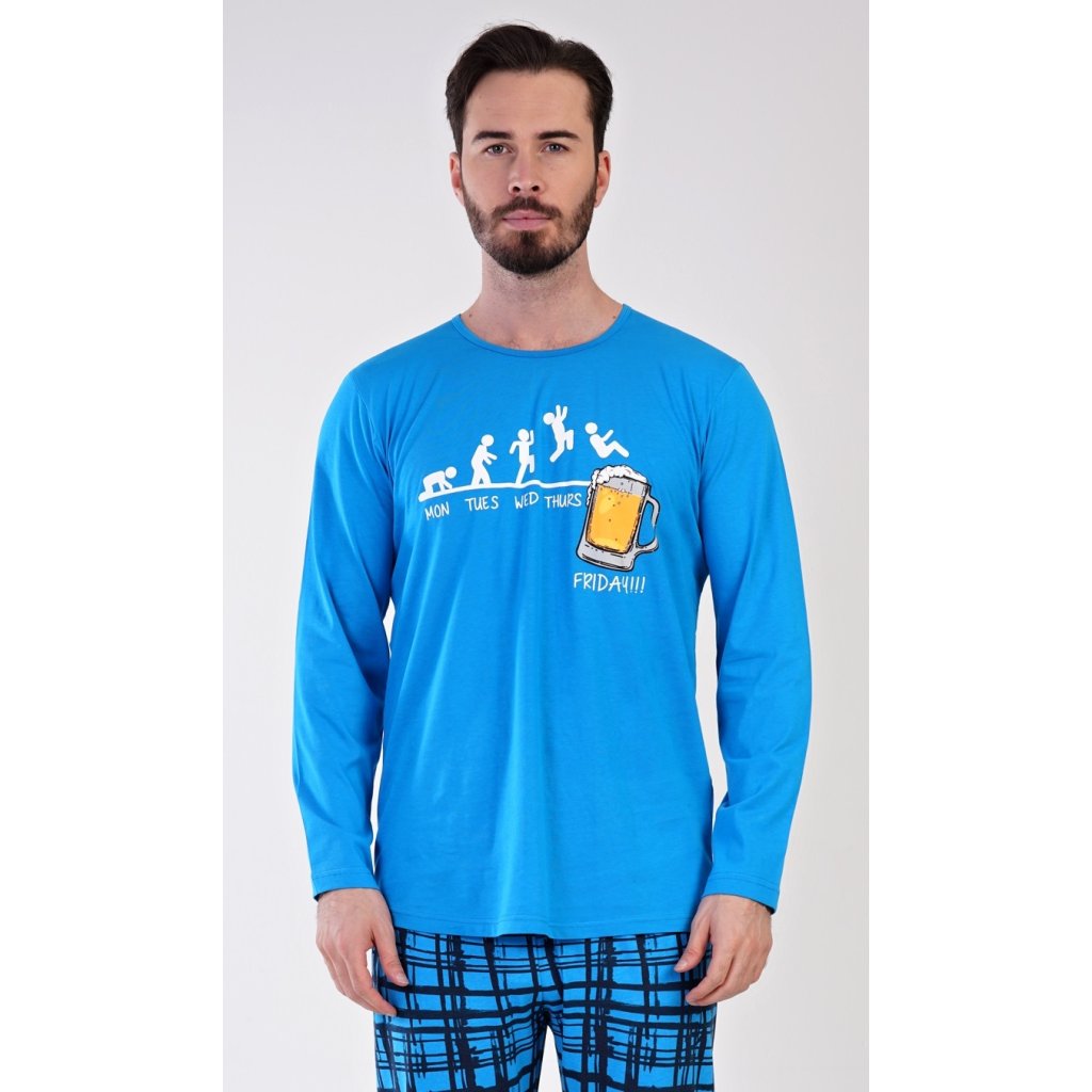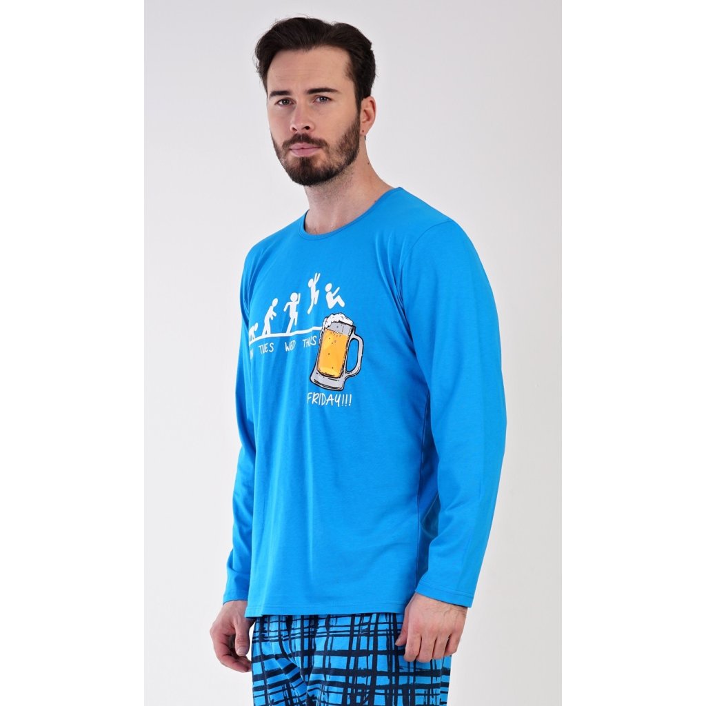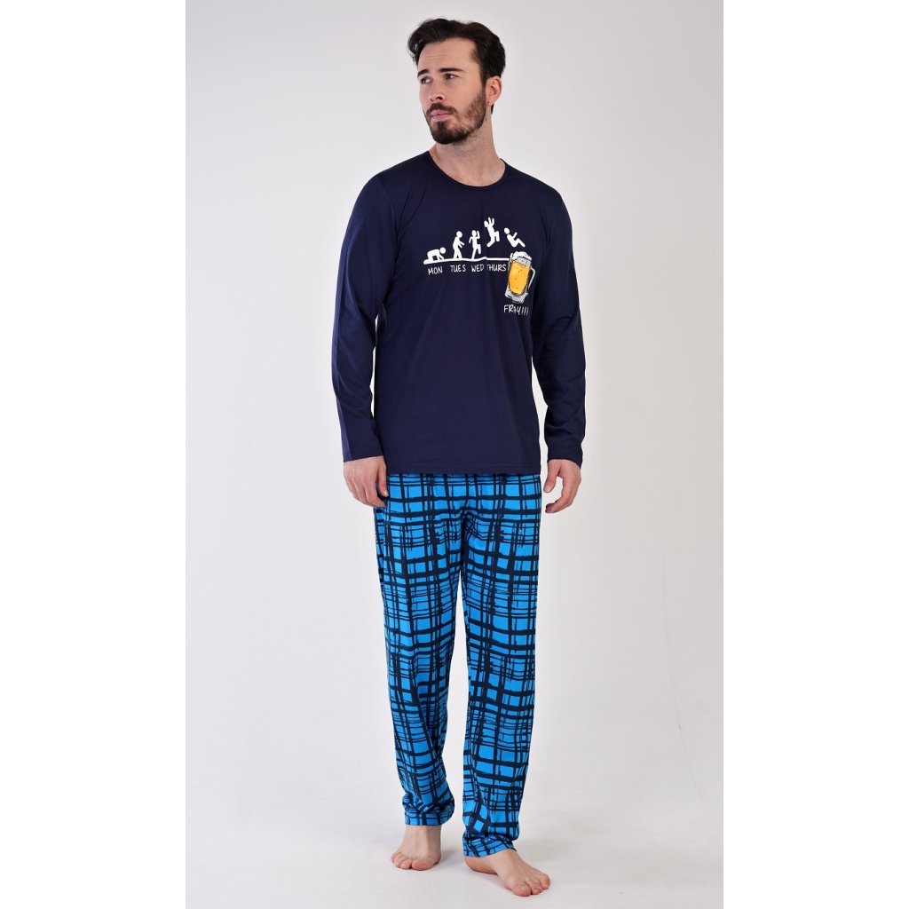 Pánské bavlněné pyžamo dlouhé Filip. Pánské pyžamo se skládá z trika s dlouhým rukávem a dlouhých kalhot. Jednobarevné triko s kulatým výstřihem je zdobeno veselým obrázkem panáčků, kteří se s blížícím víkendem nemůžou dočkat sklenice piva. Kostkované kalhoty mají v pase gumu a šňůrku na stažení. Nemají kapsy. Použitý materiál je příjemný a poddajný na dotek. Podíl bavlny u kalhot i trika je 100%.