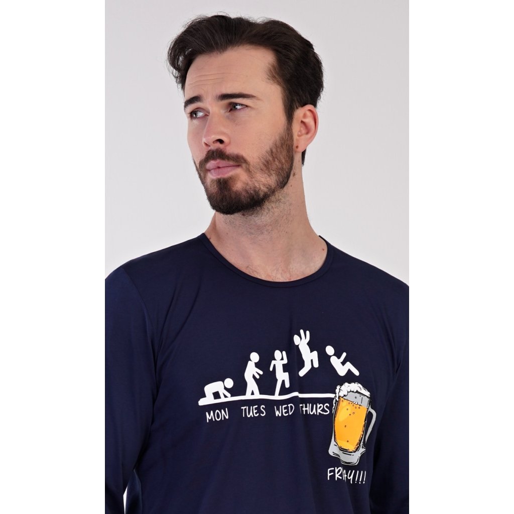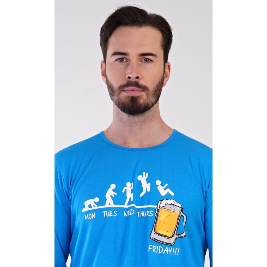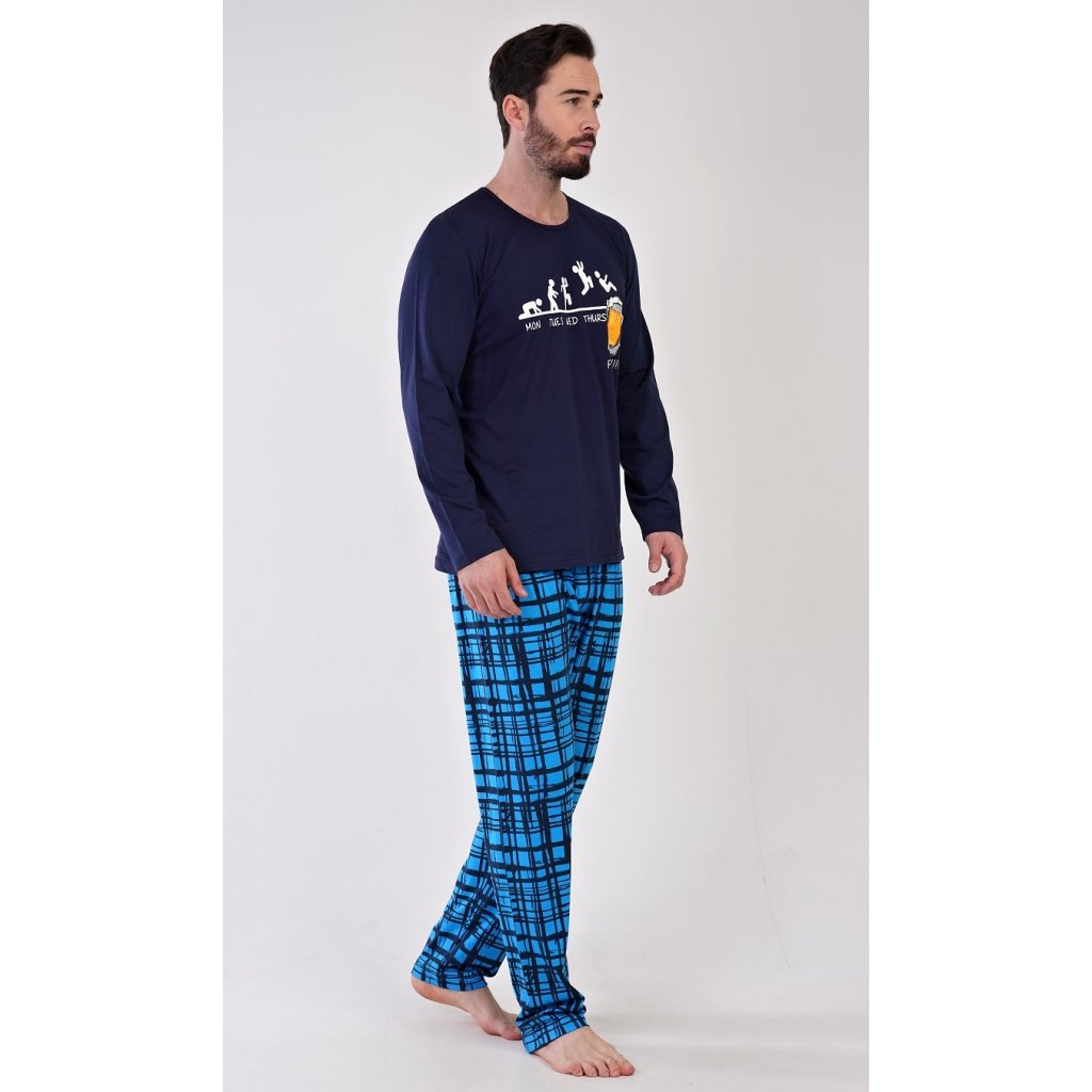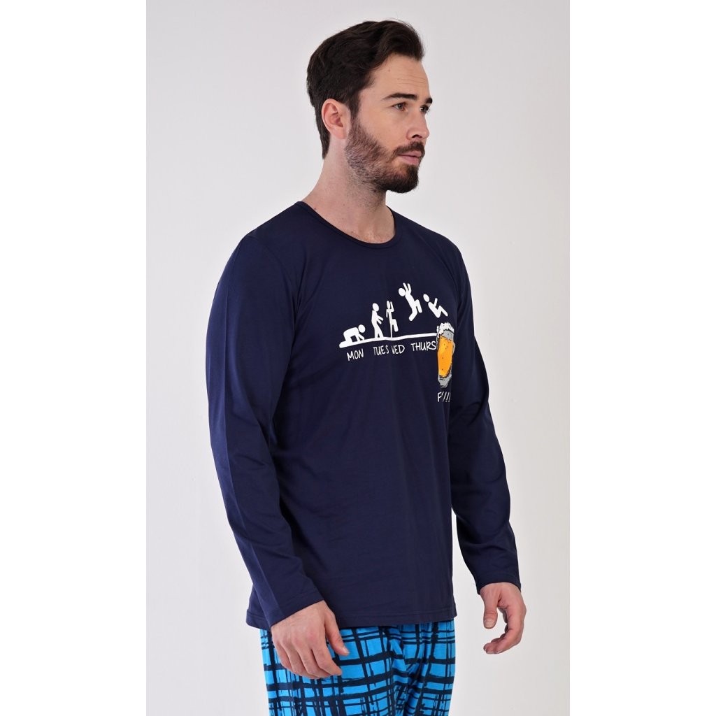 Pánské bavlněné pyžamo dlouhé Filip. Pánské pyžamo se skládá z trika s dlouhým rukávem a dlouhých kalhot. Jednobarevné triko s kulatým výstřihem je zdobeno veselým obrázkem panáčků, kteří se s blížícím víkendem nemůžou dočkat sklenice piva. Kostkované kalhoty mají v pase gumu a šňůrku na stažení. Nemají kapsy. Použitý materiál je příjemný a poddajný na dotek. Podíl bavlny u kalhot i trika je 100%.