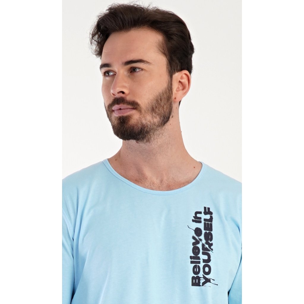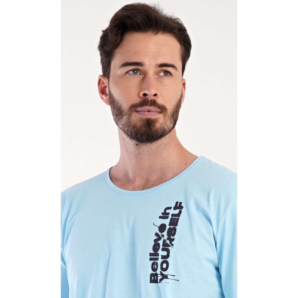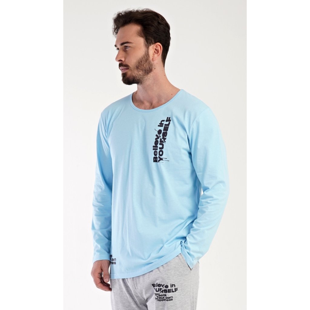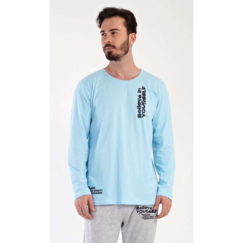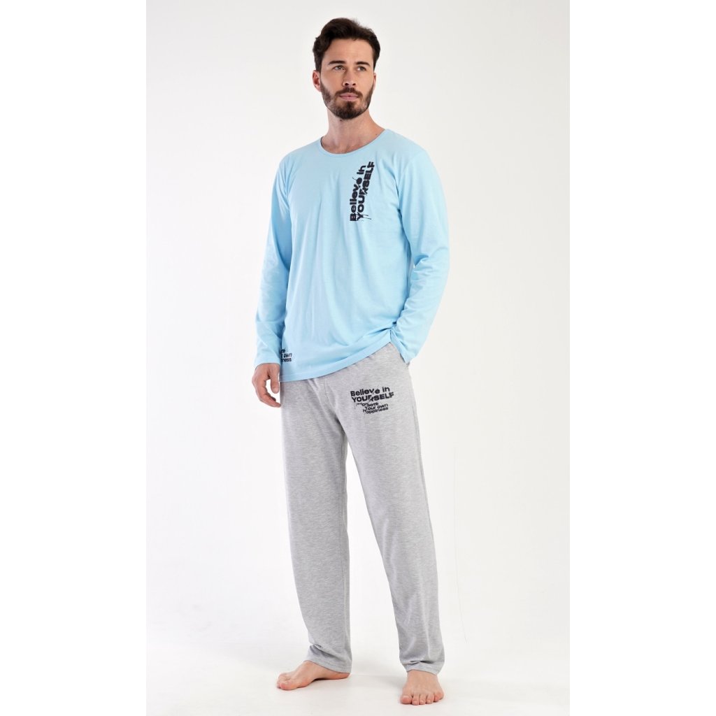 Pánské pyžamo dlouhé Henry. Pánské pyžamo se skládá z trička s dlouhým rukávem a dlouhých kalhot. Na jednobarevném triku s kulatým výstřihem je nápis BELIEVE IN YOURSELF, který se opakuje i na kalhotách. Kalhoty mají v pase gumu, šňůrku na stažení a praktické kapsy. Použitý materiál je jemný a poddajný na dotek. Podíl bavlny u trika je 100% a u kalhot 70%.
