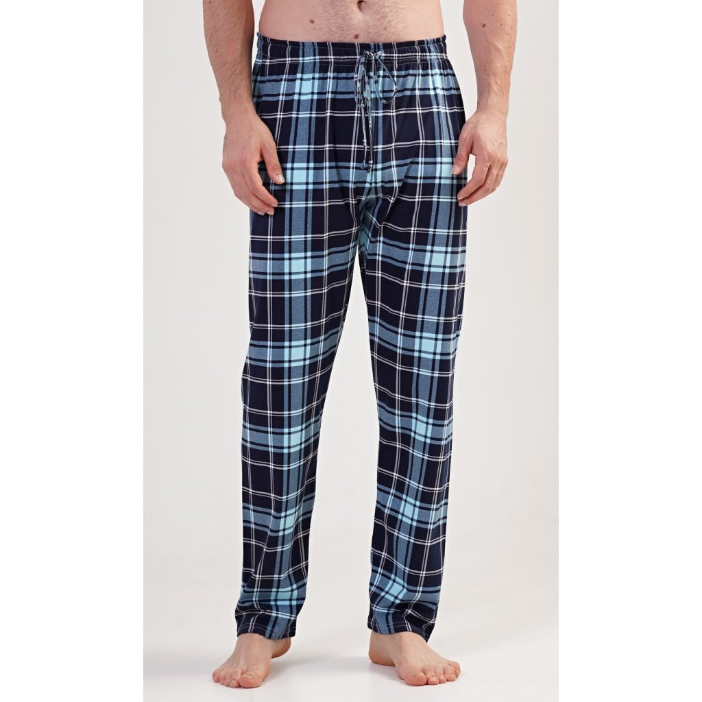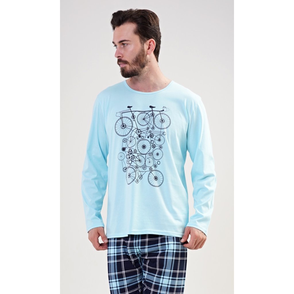 Pánské bavlněné pyžamo dlouhé Kolo. Pánské pyžamo se skládá z trika s dlouhým rukávem a dlouhých kalhot. Na jednobarevném triku je velký obrázek několika propletených kol. Výrazný potisk trika vhodně doplňují kárované kalhoty bez kapes. Kalhoty mají v pase gumu a šňůrku na stažení. Použitý bavlněný materiál je příjemný a poddajný na dotek.