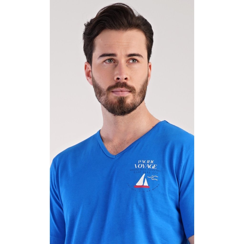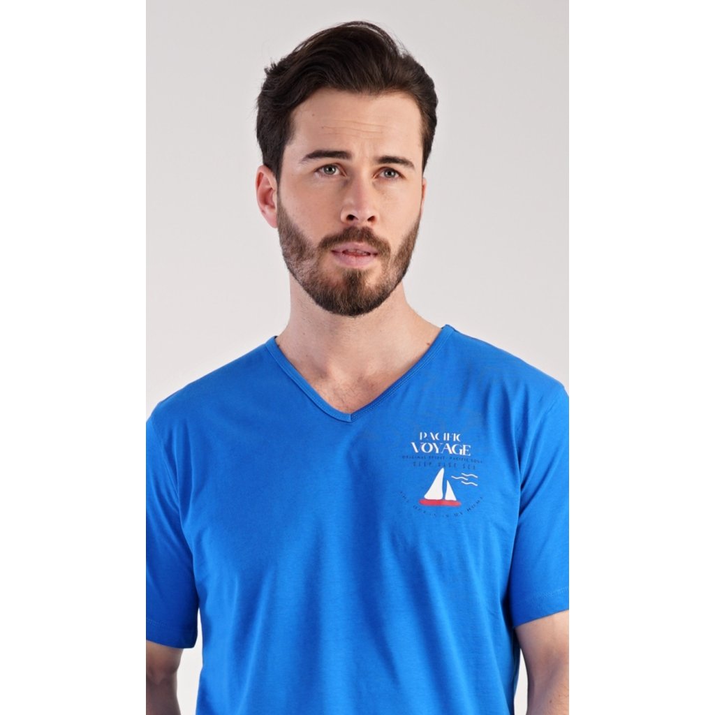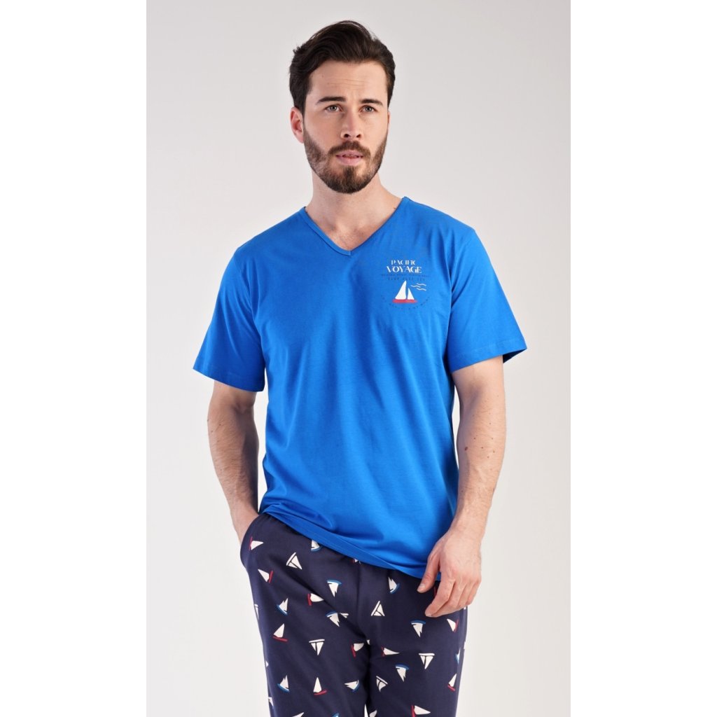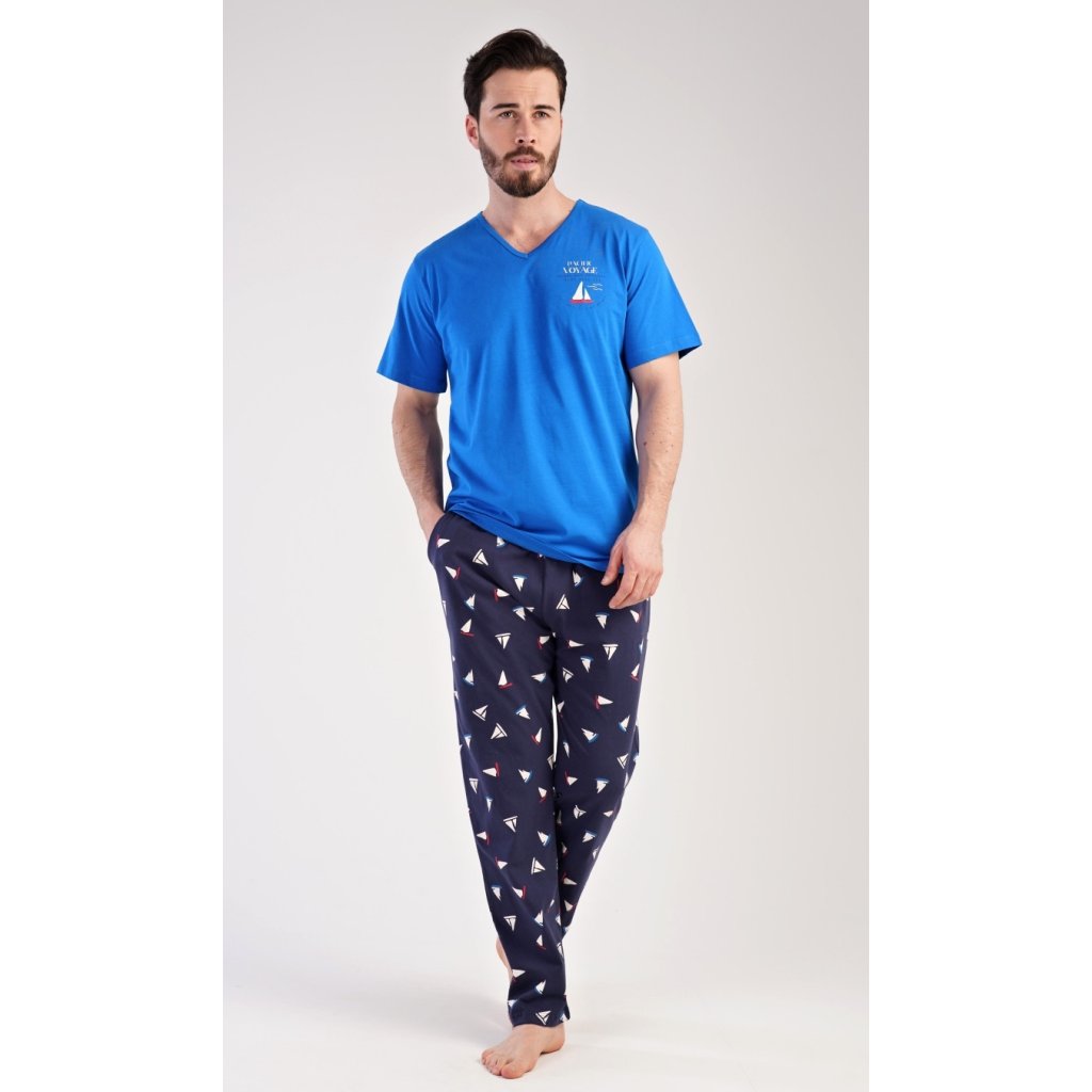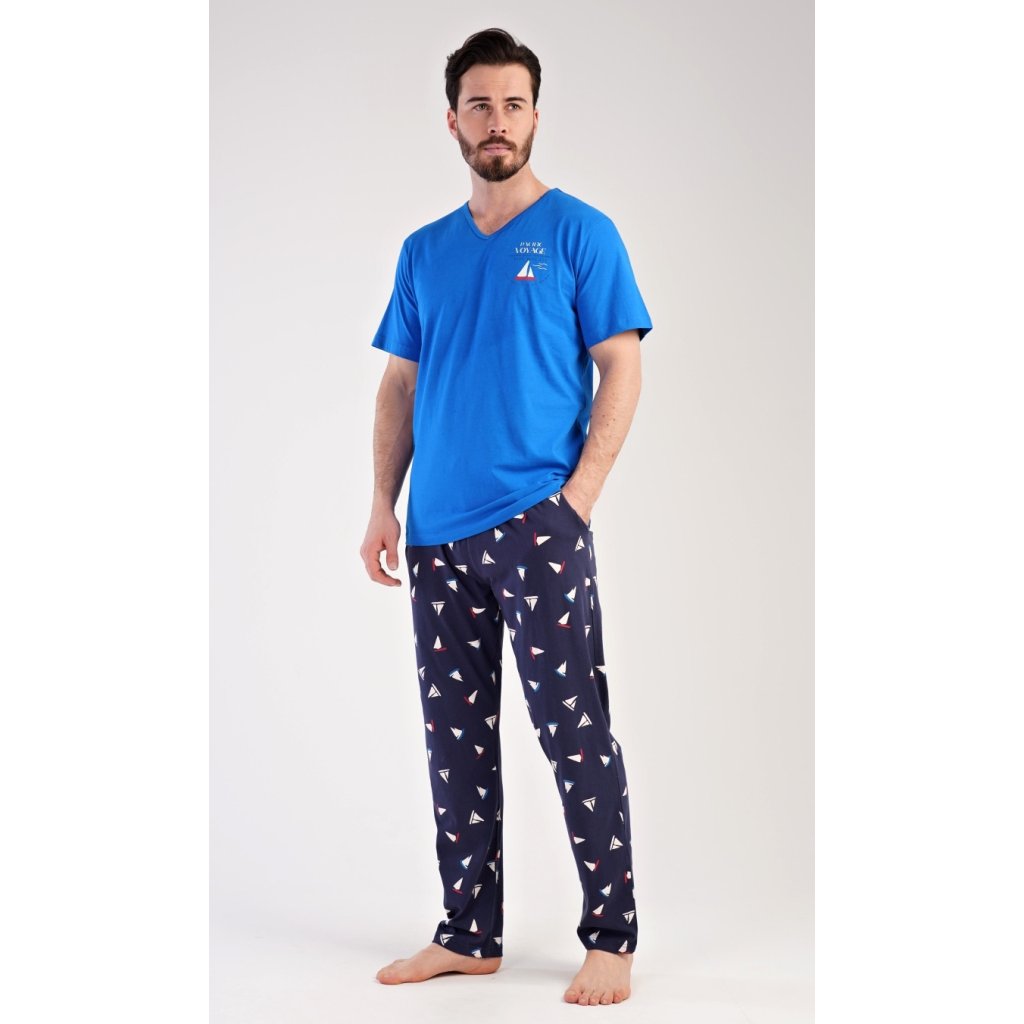 Pánské bavlněné pyžamo dlouhé s krátkým rukávem Loďka. Pánské pyžamo se skládá z trička s krátkým rukávem a dlouhých kalhot. Na modrém tričku s výstřihem do V je malý obrázek loďky a nápis PACIFIC VOYAGE. Kalhoty s kapsami a potiskem loděk mají v pase gumu a šňůrku na stažení. Použitý materiál s obsahem bavlny 100% je příjemný a poddajný na dotek.
