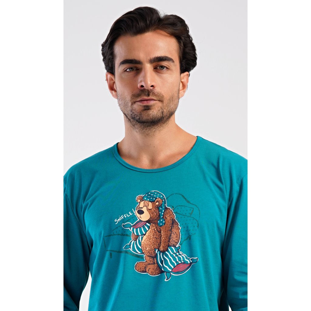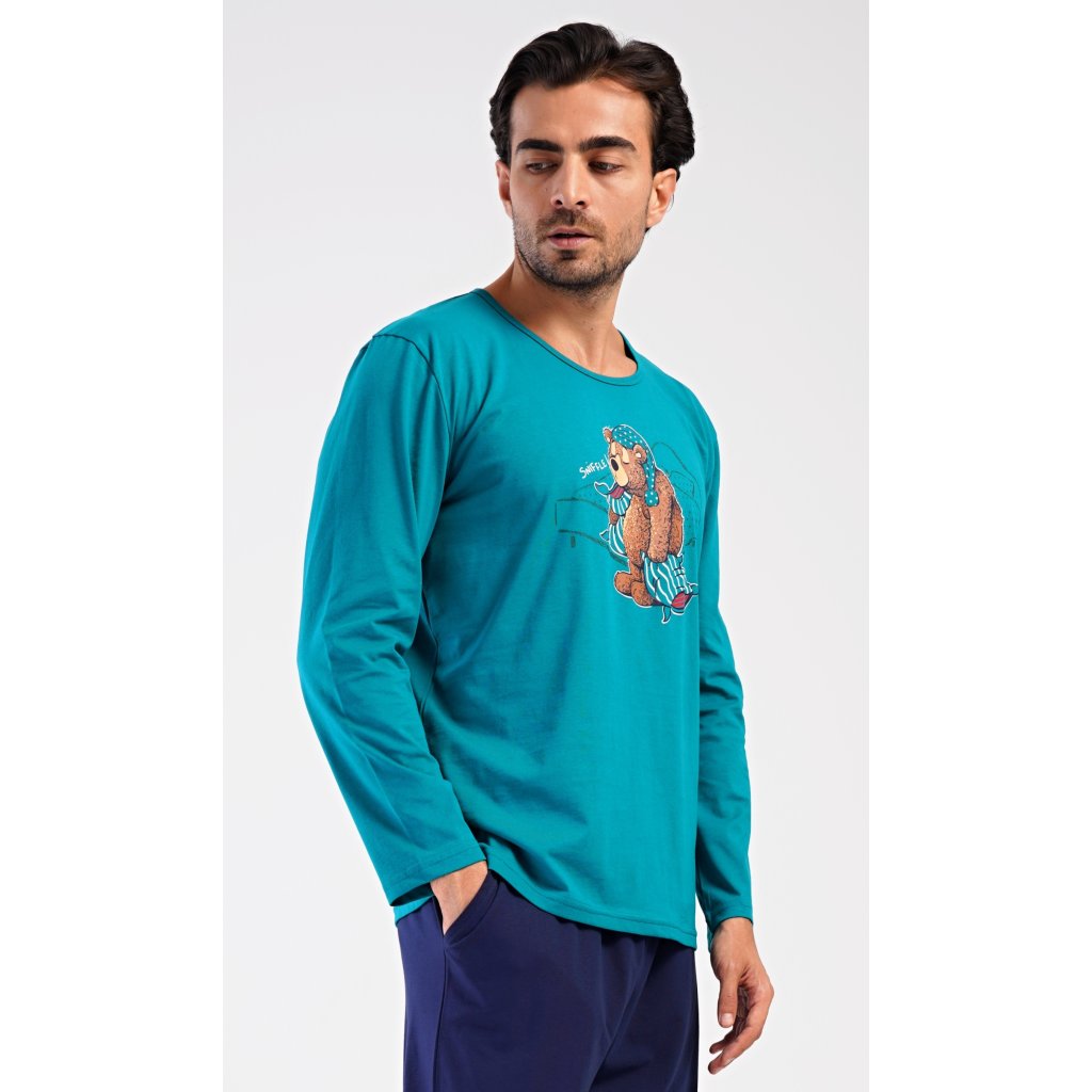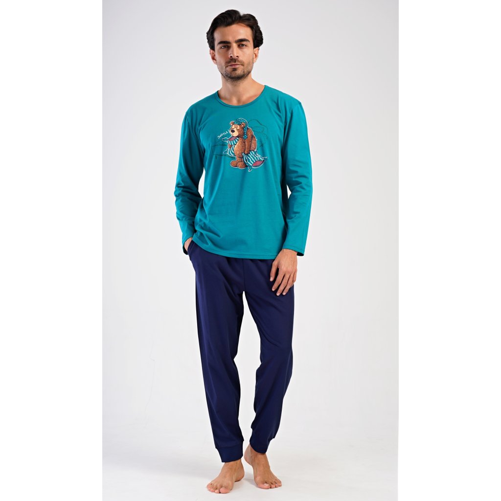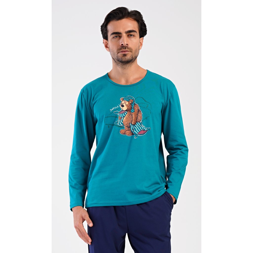 Pánské dlouhé bavlněné pyžamo Méďa Ospalec. Pánské pyžamo se skládá z trika s dlouhým rukávem a dlouhých kalhot, které jsou zakončeny lemy. Triko s kulatým výstřihem zdobí na hrudi obrázek ospalého medvěda. Jednobarevné kalhoty mají v pase gumu, šňůrku na stažení a praktické kapsy. Použitý materiál s obsahem bavlny 100% je poddajný a příjemný na dotek.
