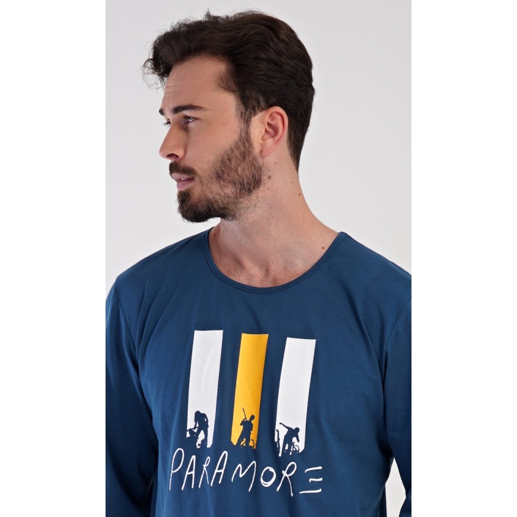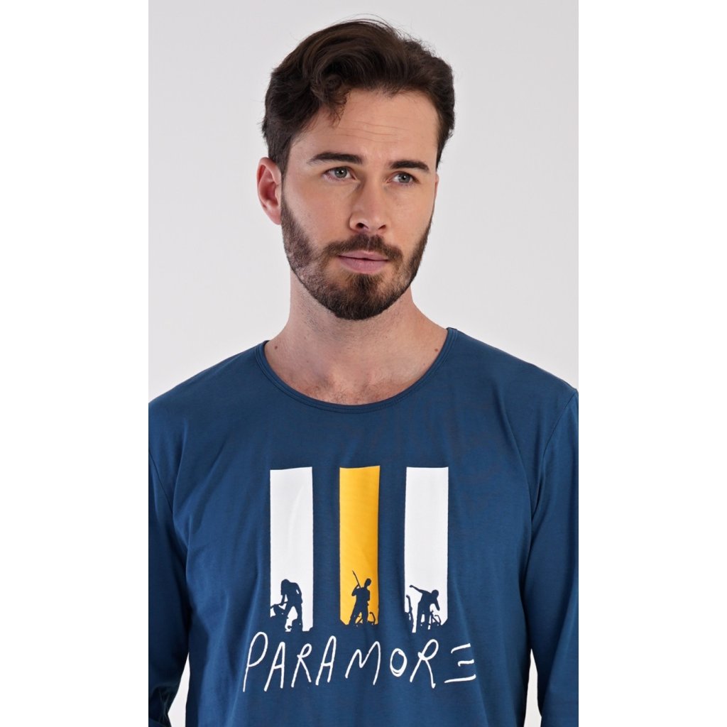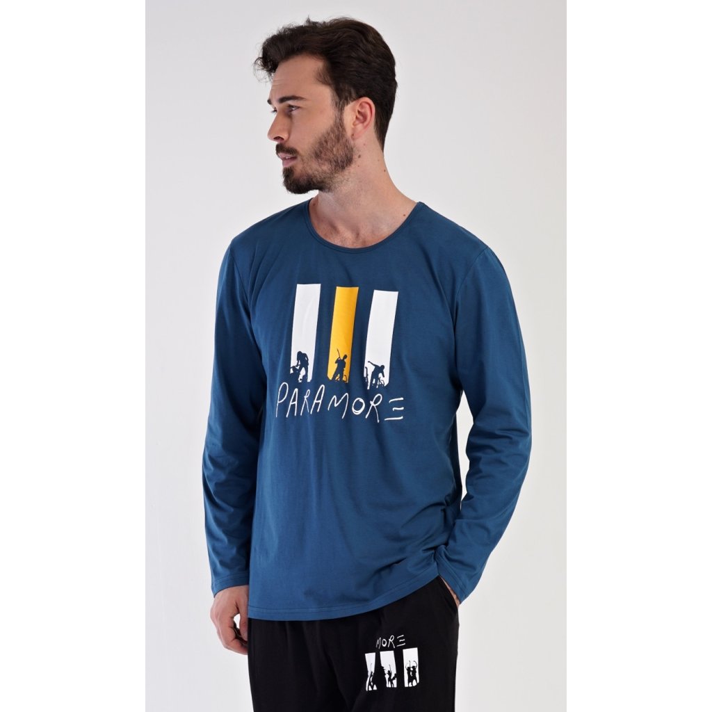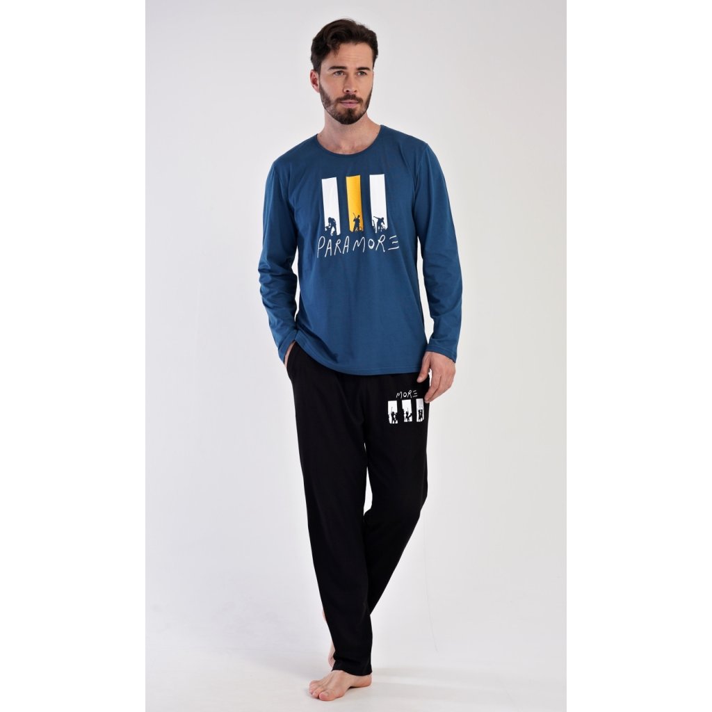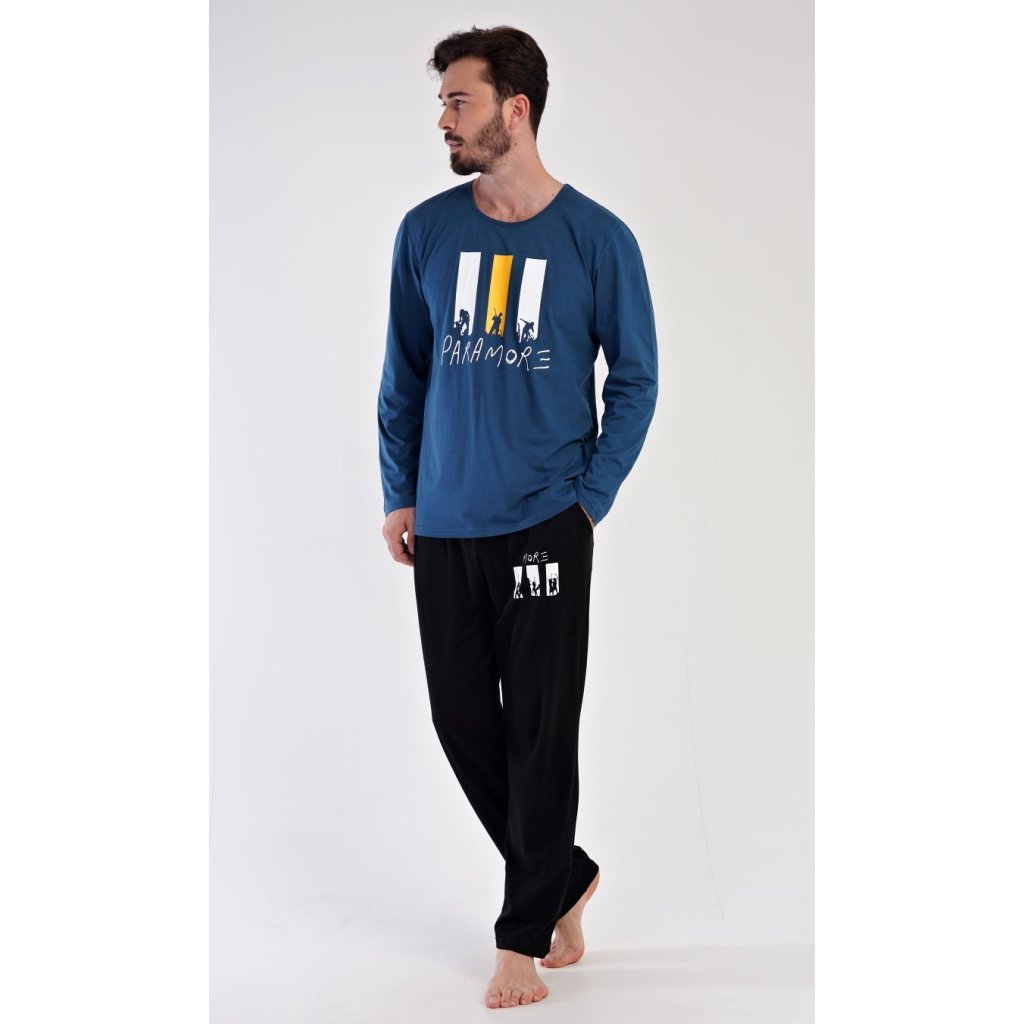 Pánské bavlněné pyžamo dlouhé Oliver. Pánské pyžamo se skládá z trika s dlouhým rukávem a dlouhých kalhot. Na jednobarevném triku s kulatým výstřihem je nápis PARAMORE, který se opakuje i na kalhotách. Triko zdobí obrázky rockové kapely. Kalhoty mají v pase gumu, šňůrku na stažení a praktické kapsy. Použitý materiál je jemný a poddajný na dotek. Podíl bavlny u trika a kalhot je 100%.